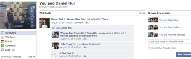 Facebook a lancé, il y a trois jours, une nouvelle fonctionnalité appelée “Amitié” qui permet d’afficher les échanges entre vous et un de vos amis ou entre deux de vos amis. Pour y accéder, rien de plus simple. Il vous suffit de vous rendre sur le profil d’un de vos contacts et de cliquer sur le lien situé en dessous de sa photo de profil : “[Prénom du contact] et vous”. Sont alors rassemblés en une seule et même page tout ce que vous avez pu échanger avec cette personne : photos publiées sur le mur, commentaires chez l’un ou chez l’autre, statuts tagués, etc.. Pas de panique, cette page n’est visible que par vous ou vos amis, tous ça ne sera donc pas accessible à n’importe qui. Cependant, la fonctionnalité est également possible pour voir ce qui s’est fait entre deux de vos amis. Dans le cadre latéral droit “d’autres relations”, vous pouvez taper le nom de deux amis différents et voir leurs échanges. Nathan Soret (St.).
