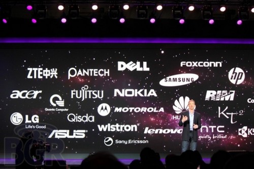 Le CEO de Qualcomm a fait une entrée fracassante mardi soir au CES pour dévoiler le nouveau processeur Qualcomm S4 Snapdragon. La principale nouveauté vient du fait que le processeur pourra désormais être utilisé pour les télévisions, smartphones, notebooks et digital media adapters et offrira le support de la 4G. Plus de 20 constructeurs travaillent déjà avec Qualcomm, parmi lesquels quelques entreprises réputées, comme HTC, Sony Ericsson, Nokia ou encore Samsung. Qualcomm poussera encore plus loin ce partenariat en 2012 puisqu’il a annoncé être en train de travailler en collaboration avec Microsoft sur la production de processeurs équipés de 4G. Avec ce nouveau processeur ultra-puissant, Qualcomm est enfin en mesure de proposer une expérience sensationnelle sur Smart TV. Les télévisions équipées par une puce Qualcomm pourront faire tourner des applications et jeux encore plus puissants que dans le passé et offriront une qualité de surf inégalée sur le marché. Il faut dire qu’avec son quad core d’1.5 Ghz de puissance, le Snapdragon S4 a fière allure. Mais là où Qualcomm marque le plus de points, surtout sur smartphones, c’est dans le fait que ce nouveau processeur utilisera moins d’énergie que prévu. Par conséquent, il devrait non seulement vous permettre d’économiser un peu sur votre facture énergétique, mais surtout de recharger moins souvent le smartphone, malgré des performances accrues. Raj Talluri, Vice-CEO de Qualcomm, estime que l’arrivée des processeurs Snapdragon sur Smart TV est “une évolution naturelle du leadership de Qualcomm dans le secteur mobile vers le secteur de la maison connectée”. 20 constructeurs, présents sur la photo ci-dessus, ont déjà adopté le S4 Snapdragon, pour un total de 70 appareils prévus en 2012. Inutile de dire que l’année s’annonce déjà très bonne pour la société ! Source : BGR