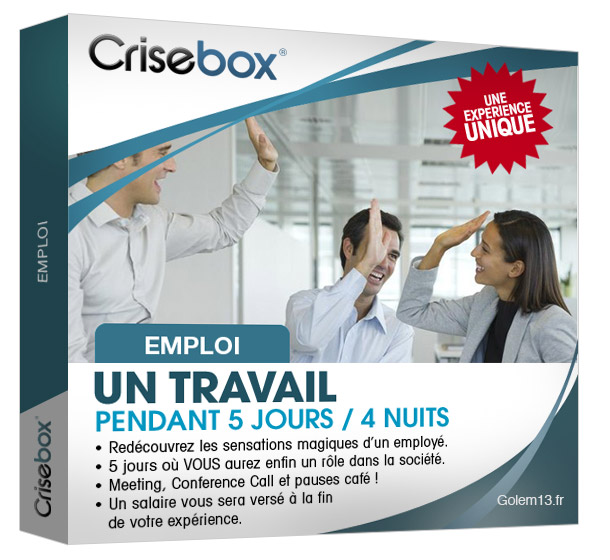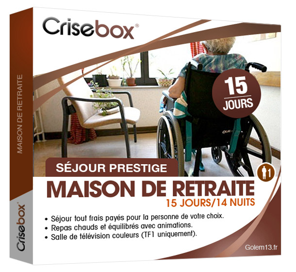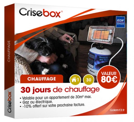 Le site internet Golem13 a imaginé une parodie de coffrets cadeaux permettant d’aider vos proches face à la crise. Face à la crise, faites plaisir à vos proches en leur offrant un coffret cadeau “Crisebox”. Bien loin de l’idée d’offrir à votre moitié un week-end gastronomique ou une séance de massages dans un grand centre thalasso, les coffrets Crisebox sont plutôt destinés à donner “un petit coup de pouce” à vos proches face à leur quotidien de plus en plus difficile… Le concept de ces coffrets est bien évidemment une parodie et a été imaginé par le site Golem13. Fiction qui pourrait devenir réalité ? Qu’en pensez-vous ? Réagissez sur le forum. À découvrir ci-dessous et d’autres par ici: