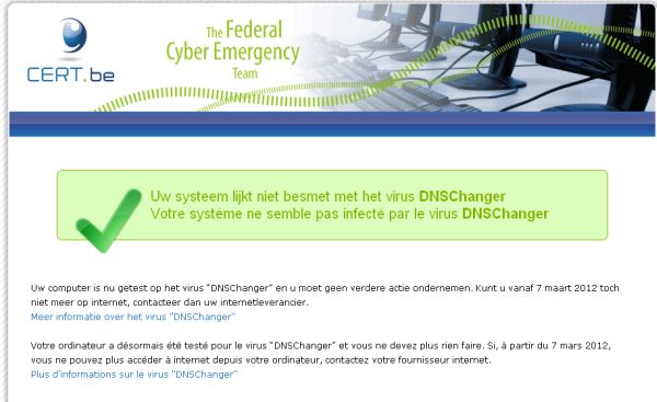 C’est la question que pose le CERT.be, le “Federal Cyber Emergency team”. En cause, un virus informatique qui a déjà infecté “plus de 4 millions d’ordinateurs dans plus de 100 pays du monde entier”. Et si le programme malveillant s’est logé sur votre PC, le CERT prévient :”Vous ne pourrez sans doute plus accéder à internet à partir du 7 mars”. Comment savoir si vous êtes infecté ? Testez votre ordinateur sur www.dns-ok.be, qui vous rassurera très vite sur la santé de votre machine. Le programme malveillant « DNS Changer » pouvait modifier les paramètres internet de votre ordinateur et vous rediriger vers des sites web frauduleux dont l’objectif était de dérober des données ou vers des sites web publicitaires grâce auxquels les cybercriminels gagnaient de l’argent. Pour plus d’infos sur le virus. Ce danger est désormais écarté car le FBI a créé un serveur provisoire qui intercepte la redirection du virus. “Mais vu que ce serveur disparaîtra bientôt, les ordinateurs infectés ne pourront plus accéder après 7 Mars à l’Internet”. D’où l’importance de vérifier la présence ou non de ce virus sur votre pc.