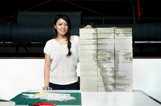 “Red” Hong est une jeune artiste qui a fait des portraits sa grande spécialité. Elle a récemment rendu hommage à Mark Zuckerberg en reproduisant son visage avec des livres. Ou lorsque Face-Book prend tout son sens… Habituée du buzz sur Internet, “Red” Hong reproduit régulièrement des visages de personnalités à partir de divers matériaux. Sa dernière création en date? Une reproduction du visage de Mark Zuckerberg à base de livres. La belle jeune femme reprend ainsi au mot “Face-book” (livre de visage) et nous propose une approche plutôt intéressante de l’art, basée sur la créativité et l’utilisation de matériaux inattendus. Pour cette oeuvre, la jeune femme a utilisé des livres dans lesquels elle a découpé des morceaux de pages pour créer des crevasses qui font apparaitre des zones d’ombre une fois exposées à la lumière. Plus d’oeuvres de “Red” Hong peuvent être consultées sur son blog I see red. On en parle sur le forum.