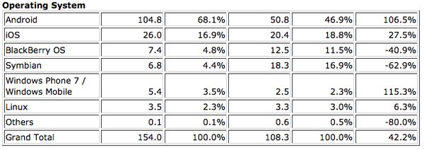 Selon une étude réalisée par IDC, 68,1 % des téléphones intelligents vendus au deuxième trimestre de l’année 2012 tournaient sous Android. Cela représente une hausse de 106,5 % par rapport au deuxième trimestre de l’année passée. Chez la concurrence, l’iPhone est loin derrière avec 16,9 % des ventes, même si elles progressent toujours, puisque qu’elles ont grimpé de 27,5 % par rapport à la même période l’année dernière. Pour l’IDC, nous sommes désormais devant une « course à deux ».En effet, les autres plateformes se partagent les restes. BlackBerry OS (4,8 %) et Symbian (4,4 %) continuent de diminuer en terme de parts de marché. Leurs ventes de smartphones ont chuté de manière inquiétante (-40,9 % pour RIM par rapport au deuxième trimestre 2012, -62,9 % pour Symbian) En ce qui concerne Windows Phone, on remarque une progression de l’OS mais qui ne représente que 3,5 % des ventes. Selon l’IDC, le succès d’Android est directement lié à celui des terminaux Samsung, qui représentent presque la moitié (44 %) des smartphones fonctionnant avec l’OS de Google vendus ce trimestre. Le Galaxy SIII, qui rencontre un franc succès, n’est certainement pas étranger à cette domination. Par ailleurs, le constructeur Apple pourrait bien rattraper une partie de son retard dans les mois qui viennent, avec le lancement de l’iPhone 5. IDC explique que « la demande pour le smartphonehaut de gamme d’Apple a baissé étant donné qu’il est disponible depuis octobre dernier et que les rumeurs ont lancé la spéculation sur un nouveau design et de nouvelles fonctions pour la prochaine version ». On en parle sur le forum