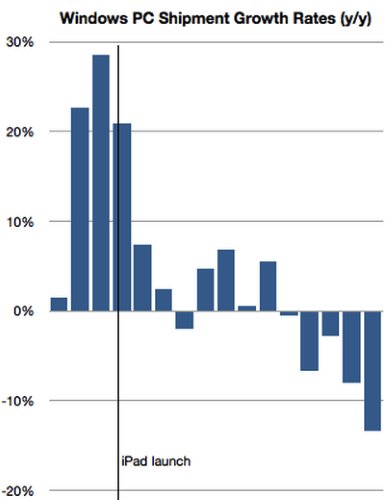 Si Microsoft rattrape petit à petit la concurrence sur le segment mobile, le quasi-monopole qu’avait la firme de Redmond jadis semble s’être définitivement effondré au profit d’un marché hautement compétitif et qui fait la part belle à la concurrence entre les différents acteurs du marché. Certes, le marché reste dominé par trois systèmes d’exploitations principaux : Windows, Android et l’inévitable duo OSX/iOS, mais les petits acteurs ont grâce à cet intérêt croissant des acheteurs pour la nouveauté une carte à jouer dans ce business. Une récente étude d’Asymco publiée par Business Insider nous révèle l’impact gigantesque de la montée en puissance du mobile sur les parts de marché de Microsoft. En quelques années seulement, Microsoft est passé d’une forte croissance à un recul important. Sans surprise, l’effondrement des ventes coïncide avec l’arrivée du premier iPad sur le marché, qui a définitivement bouleversé les habitudes des consommateurs (voir graphique 1). On le sait, Microsoft a tardé à entrer dans la danse. Il aura fallu plus de trois générations de systèmes mobiles avant que le géant américain passe le cap des 5% de parts de marché, et Microsoft commence tout juste à imposer Windows 8 comme un système compétitif sur le segment des tablettes numériques. En réalité, Redmond a longtemps cru que le tactile ne vampiriserait pas les ventes d’ordinateurs portables. Comme on peut le voir sur le second graphique, les volumes de ventes de smartphones ont rapidement dépassé les volumes de ventes d’ordinateurs personnels, et les tablettes semblent en voie de dépasser, d’ici quelques années, les PC traditionnels. Pour autant, si le secteur souffre de cette concurrence, presque déloyale, avec les appareils tactiles, les volumes restent très corrects. Certes, on note une baisse des ventes, et un désintérêt croissant du consommateur, ou plutôt un cycle de renouvellement plus lent que pour les appareils tactiles, mais le PC occupe toujours une part importante de notre vie, et aussi bien les étudiants que les professionnels ne sont pas prêts de les remplacer de si tôt par une tablette ou un smartphone. En revanche, Windows a du soucis à se faire. D’une part parce que les ex-partenaires de Microsoft sont de plus en plus nombreux à tâter le terrain pour trouver des alternatives (Chrome OS), et d’autre part, parce qu’Apple a parfaitement réussi son retour sur le marché des ordinateurs portables, devenant un symbole de professionnalisme et de performances. Contrairement à Apple, Microsoft n’est pas encore parvenu à imposer son écosystème comme une entité unique. Par conséquent, les acheteurs de Windows Phone ne ressentent pas forcément le besoin d’acheter une tablette Windows 8 ou un PC. A l’inverse, les possesseurs d’iPhone sont souvent tentés de se procurer un iPad ou un Mac en complément de leur smartphone. Comme on peut le voir sur le troisième graphique, Windows a tout à y perdre, et risque vite de passer du rang de leader à celui de challenger, voire même de système d’exploitation secondaire. La réactivité de Redmond décidera très probablement de l’avenir de l’ogre vert, qui possédait il y a quatre années encore près de 70% de parts de marché, et qui se retrouve aujourd’hui avec moins de 25% de parts de marché. Une situation inconfortable qui donne un clair avantage à Google et son système d’exploitation mobile, qui lorgne aujourd’hui sur une utilisation professionnelle…