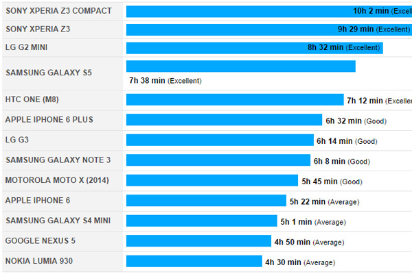 Selon des tests réalisés par le magazine en ligne Phone Arena, le fabricant japonais a réussi des prouesses au niveau de la consommation d’énergie de ses derniers smartphones. Source: Phonearena.com Depuis l’introduction du mode Stamina sur sa gamme Xperia, Sony tente d’améliorer sensiblement l’autonomie de ses smartphones. Avec les Z3 et Z3 Compact, les résultats semblent convaincants. En effet, les essais effectués sur ces dispositifs les classent en première position, bien loin des nouveaux iPhone et des fleurons des marques concurrentes. Le choix d’un écran 720p sur le Z3 Compact lui permet de dépasser 10 heures de vie sur une batterie de tests, le double des iPhone 6, Nexus 5 et S4 Mini de Samsung. Seul le G2 Mini de LG s’approche mais à des niveaux de performances bien moindres. Contrepartie de taille: les temps de chargement sont plus importants. Il ne faudra pas loin de trois heures pour passer de 0 à 100%. Cette réussite de Sony se traduira-t-elle par un premier succès commercial conséquent sur le segment Android ? La réponse est certainement détenue par le département marketing de la marque, généralement obscurci par les moyens phénoménaux de Samsung et d’Apple.