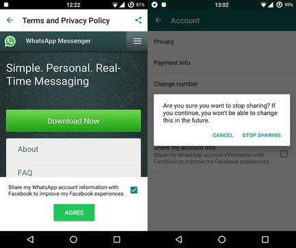 Alors qu’on nous avait promis que Facebook et WhatsApp resteraient deux entités distinctes, la firme californienne est en train d’implanter une nouvelle option qui permettra de faire le pont entre un compte WhatsApp et un compte Facebook… La nouvelle bêta de WhatsApp réserve quelques surprises aux utilisateurs du service de messagerie instantanée. Pour la première fois de son histoire, l’application introduit un “pont”, qui permet de lier son compte WhatsApp à son compte Facebook. Si aucun détail n’est donné au sujet de ce lien entre les deux outils, il semblerait qu’il soit question ici de plus facilement retrouver ses contacts WhatsApp sur Facebook. Concrètement, si vous avez certains contacts qui ne vous ont pas donné leurs coordonnées complètes, il vous sera possible de les retrouver une fois la nouvelle mise à jour appliquée. Heureusement, il sera possible de désactiver l’option si vous ne souhaitez pas permettre aux personnes que vous contactez via la messagerie de vous ajouter dans leurs cercles d’amis. Reste que le fait que Facebook introduise aujourd’hui cette nouvelle fonctionnalité a de soulever quelques questions, et ce d’autant plus que WhatsApp vient d’abandonner sa formule payante…