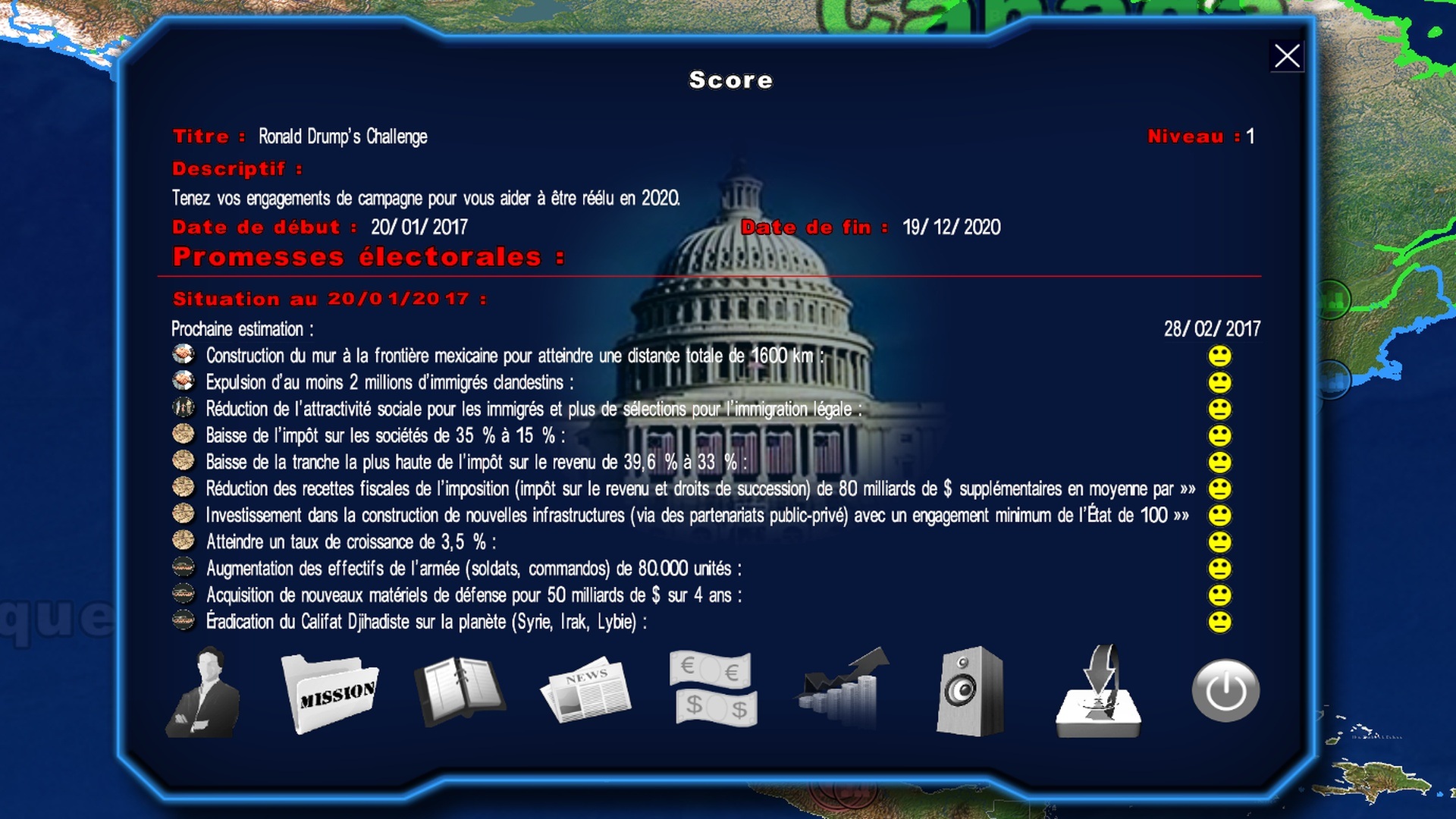 Power & Revolution, Geopolitical Simulator 4″ est un jeu où il est demandé au joueur de gouverner. Crédit : Eversim “Donald Trump’s challenge”, c’est le nom de la nouveauté présente au sein de l’add-on du jeu “Power & Revolution, Geopolitical Simulator 4”. Cette franchise offre au joueur la possibilité de gérer un territoire. En d’autres termes, il s’agit d’un jeu de simulation militaire, économique et géopolitique. Et la nouvelle extension du jeu permet de prendre le contrôle du nouveau président américain afin d’occuper ses fonctions. Voici le descriptif du “Donald Trump’s challenge” rédigé par Eversim, studio de développement du jeu : “Incarnez le nouveau chef de l’administration américaine et tentez de tenir vos engagements de campagne sur des sujets aussi variés que la baisse de la pression fiscale, la relance de l’économie ou la lutte contre l’immigration illégale et ce en évitant la banqueroute de l’état et en maintenant votre taux de popularité, l’objectif au final étant de se faire réélire pour un second mandat en 2020.” La sortie de l’add-on est annoncée pour le 20 janvier 2017, soit le jour de l’investiture de Donald Trump en tant que président des USA. Crédit : Eversim