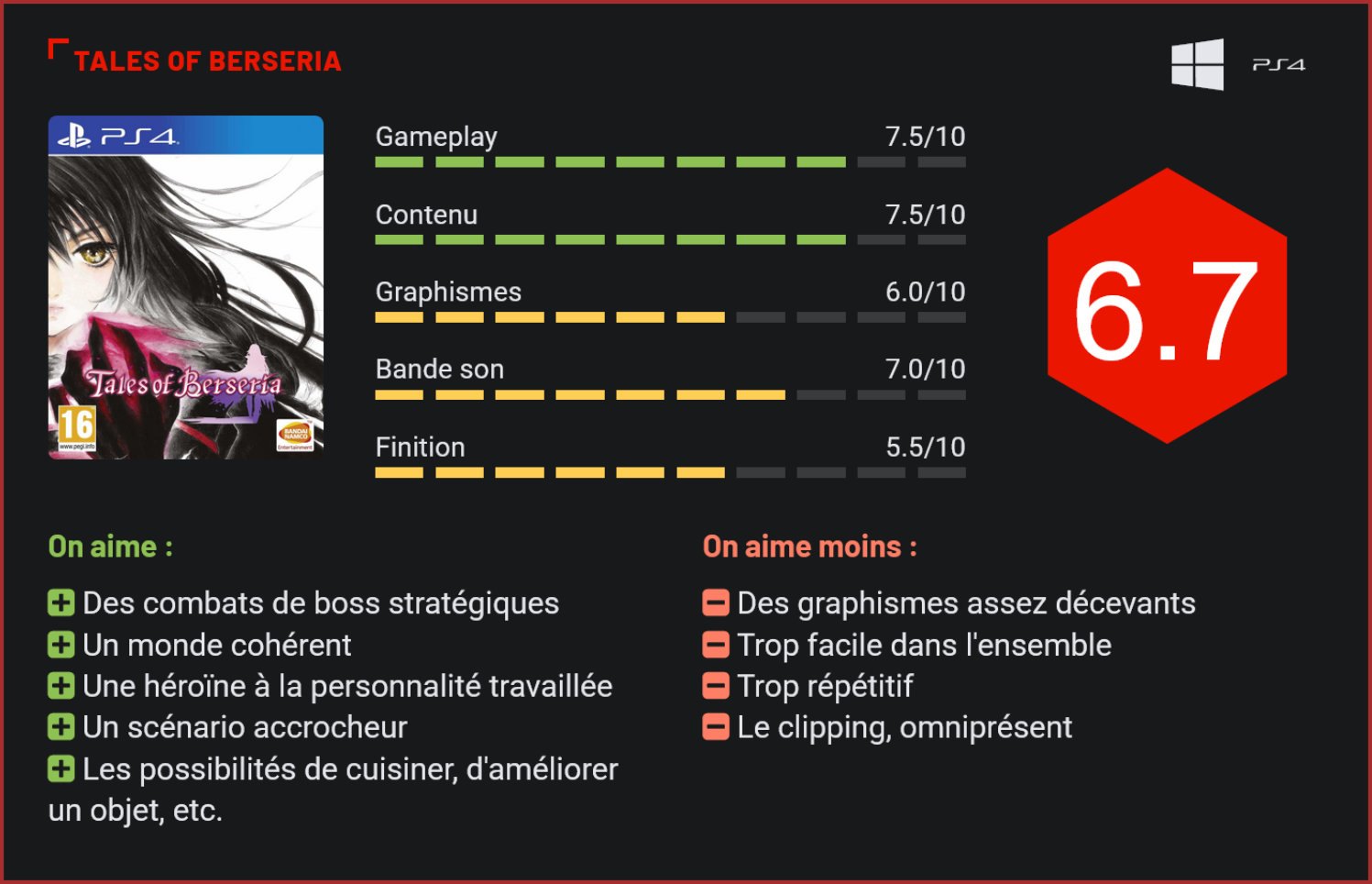 Ce nouvel opus constitue la préquelle du dernier volet, Tales of Zestiria. Les Tales of représentent l’une des franchises les plus connues en matière de JRPG aux côtés des Star Ocean et autres Final Fantasy, même si ce dernier surpasse les deux premiers en termes de notoriété. Après Tales of Zestiria, Namco-Bandai nous livre un nouvel opus exclusivement réservé à la PS4 et au PC, le fameux Tales of Berseria. Une quête de vengeance Bien qu’il s’agisse d’une préquelle, Tales of Berseria ne présentera pas de problèmes de compréhension pour les joueurs qui prennent en cours de route cette série. Dans cette nouvelle aventure, le joueur incarne Velvet, une jeune fille vivant seule avec son petit frère depuis la mort de leurs parents. Ceux-ci sont sous la garde de leur tuteur, Artorius, un exorciste de renom. Une nuit, Velvet se réveille et ne trouve plus son petit frère, Laphicet. Elle part donc à sa recherche et finit par assister à son sacrifice. Ce dernier événement aura également d’autres conséquences comme la métamorphose de l’héroïne en démon. S’en suivra une quête de vengeance envers l’auteur du rituel ayant conduit à la mort de Laphicet. Voici donc en quelques mots de quoi il retourne en ce qui concerne le scénario. Comme on peut le voir, le titre est assez sombre et mature. L’héroïne, quant à elle, présente une personnalité intéressante puisqu’elle estime que tous les moyens sont bons pour atteindre son objectif et ne tombera jamais dans les clichés que l’on peut observer dans d’autres productions. Ici, vous contrôlez un rebut de la société et vous devrez donc faire face à l’autorité de ce monde. Le tout s’inscrit dans univers cohérent afin de faciliter l’immersion du joueur. Des graphismes datés mais une identité cohérente Dans les faits, les personnages principaux, tout comme les nombreux ennemis à abattre, sont variés. Il en va d’ailleurs de même concernant les lieux à visiter : port, village rustique, ville commerciale enneigée… ne constituent que quelques-uns des endroits à parcourir. Les protagonistes comme les différentes villes sont modélisés dans un style manga assez épuré qui confère une identité propre au titre. Seulement voilà, les graphismes font peine à voir. Dans l’ensemble, le design est très réussi, mais il suffira de s’approcher d’une texture ou d’un détail pour se rendre compte que le titre a quelques années de retard sur ses concurrents. De plus, il n’est pas rare d’observer du clipping. Si ces points sont regrettables, ils peuvent tout de même se ranger dans la catégorie des détails tant, comme dit précédemment, la cohérence de l’univers présenté est solide. D’ailleurs, ce dernier est illustré tantôt par des cinématiques où les protagonistes apparaissent à la manière d’un anime, tantôt par des phases dites classiques, comprenez que les personnages y sont tels qu’ils sont modélisés lorsque le joueur les contrôle. Et la transition entre les phases de gameplay et ces cinématiques “anime-manga ” a été soignée. Toute cette structure renforçant, encore une fois, l’immersion du joueur. D’ailleurs, le son y contribue également : que ce soit les dialogues, les exclamations lancées en plein combat ou encore la musique, il n’y a rien à redire à ce niveau. Des combats mêlant action et stratégie Côté gameplay, on retrouve une formule de combats qui repose sur le dynamisme. Pour les néophytes, sachez qu’il n’est pas question de tour par tour à l’ancienne mais plutôt de combats en temps réel très dynamiques un peu à l’image de ce que propose Final Fantasy XV. Ici, il s’agit de composer vous même vos combos au sein des menus afin d’expédier le plus rapidement possible votre adversaire au tapis. Ces combos sont gérés par une “jauge d’âmes”, soit l’équivalent d’une barre de mana. Celle-ci, symbolisée par de petits losanges, diminuera en fonction des coups que donnera le personnage contrôlé. Ce qui poussera le joueur à cogiter afin de ne pas se voir démuni avec une jauge vide. Ajoutez à cela des “Brise-âmes”, une sorte de super attaque que vous pouvez déclencher lorsque vous possédez au moins trois âmes. D’autres spécificités viennent également pimenter les affrontements comme la possibilité de se mettre en garde, d’éviter un coup, etc. Concrètement, le système mis en place dans ce Tales of Berseria est plaisant tant il permet de nombreuses combinaisons de coups et force le joueur à réfléchir lors de duels face à des boss. Cependant, ces mêmes combats face à des adversaires communs se résumeront pour la plupart du temps à marteler quelques touches et à s’éloigner d’un ennemi quand c’est nécessaire, soit quand la jauge d’âmes est au plus bas. Bref, répétitif à souhait. Mais il s’agit là d’une spécificité de la série. Un jeu pour débutant ? Toujours concernant les défauts du titre, on regrette la réapparition des trésors. Il suffira au joueur de collecter un trésor dans une pièce avant d’en ressortir et d’y retourner quelques instants plus tard afin d’y retrouver… le même trésor. Une idée pouvant convenir à des joueurs n’ayant jamais posé les mains sur un jeu de rôle mais qui s’avèrera trop simpliste pour les gamers expérimentés. D’ailleurs, ces derniers regretteront aussi le nombre réduit de quêtes annexes et la deuxième partie d’aventure plus mollassonne. Le système d’évolution, quant à lui, est classique et voit les caractéristiques des personnages augmenter d’elles-mêmes. Par contre, un système de titres vient enrichir le jeu : certains d’entre eux confèrent la possibilité de dénicher plus de trésors, d’autres permettent d’être plus agressifs avec certains types de combos, etc. A cela, ajoutons la possibilité de démanteler et de créer des objets qui offrent la possibilité d