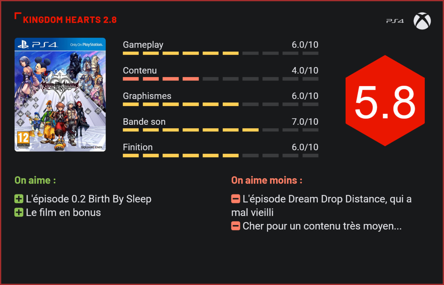 En attendant la sortie de la compilation rassemblant les deux premiers opus de la franchise sur PlayStation 4, les fans de Kingdom Hearts ont droit à une première compilation rassemblant deux spin-offs du jeu ainsi qu’un film d’animation. Série tentaculaire malgré sa relative jeunesse, Kingdom Hearts a eu droit à de nombreux spin-offs et portages sur consoles portables. Pour permettre aux fans de la franchise qui n’avaient pas eu l’opportunité de goûter à ces opus, Square-Enix propose aujourd’hui une compilation rassemblant deux des meilleurs spin-offs de la série ainsi qu’un film d’animation d’environ 1 heure. Ce dernier, sobrement intitulé “X Back Cover”, apporte une modeste contribution à l’univers de Kingdom Hearts avec une vidéo entièrement tournée avec l’Unreal Engine 4, qui narre l’histoire du Maître des Maîtres. Si elle est plutôt bien réalisée, la vidéo en question ne rivalise pas avec les films d’animation inspirés de l’univers de Final Fantasy, comme le récent Kingsglaive – beaucoup plus abouti techniquement, et intéressant au niveau de l’intrigue que ce court-métrage, qui n’apporte finalement pas beaucoup à cette compilation mais qui a au moins le mérite d’exister. La meilleure contribution vient de l’épisode 0.2 Birth By Sleep – A Fragmentary Passage, la suite directe de Birth By Sleep, un épisode sorti exclusivement sur PSP (et qui n’est malheureusement pas proposé dans cette compilation), et qui nous emmène dans le monde des ombres. Orienté sur l’action, ce spin-off a le mérite d’être une réelle réussite sur le plan ludique – avec des affrontements très nerveux et un gameplay aux petits oignons -, et de jouir en outre d’une réalisation graphique digne d’une grosse production – merci l’Unreal Engine 4. Malheureusement, le divertissement n’est que de courte durée puisqu’il faudra moins de 2 heures aux plus aguerris pour boucler l’aventure. En prenant son temps pour parcourir l’aventure et en tentant d’en débloquer tout le contenu, la durée de vie gonflera certes à 4 ou 5 heures, mais la majorité des joueurs ne prendra pas le temps de s’attarder sur cet épisode certes très agréable à parcourir, mais aussi beaucoup trop court. Le troisième et ultime contenu n’est en réalité qu’un portage du jeu Dream Drop Distance, un autre spin-off de la franchise sorti cette fois sur 3DS, et qui a droit à une adaptation assez banale sur PS4. Cette fois, pas de claque graphique puisque le jeu a plutôt mal vieilli. S’il est appréciable de pouvoir enfin y jouer sur une console de salon, on regrettera que l’épisode n’ait pas eu droit à une refonte graphique. Dans le même ordre d’idée, le jeu a plutôt mal vieilli aussi au niveau de son gameplay, clairement plus adapté à la console portable de Nintendo qu’à la PlayStation 4. Clairement trop facile, décousu, et pas très entraînant, cet épisode représente une petite déception pour les fans de la franchise – qui retrouveront certes un spin-off assez proche de l’opus originel, mais aussi un jeu qui n’apporte pas grand chose tant au niveau du scénario que du gameplay. Notons d’ailleurs que sur ce point, la compilation reste très accessible. Les commandes se mémorisent assez facilement et – bien que variées (combats, plate-forme & minis-jeux), les séquences de jeu se maîtrisent rapidement. Quant au concept, qui consiste à mêler les univers de Disney et de Final Fantasy, il reste toujours aussi accrocheur et réussit surtout là où beaucoup d’autres jeux du même genre ont échoué… Au final, Square-Enix a donc été assez peu généreux au niveau du contenu de sa compilation avec seulement deux spin-offs au compteur et un film d’animation. On aurait clairement aimé retrouvé le Birth By Sleep sorti sur PSP afin de pouvoir enfin compléter sa collection. Vu le prix auquel est vendu cette compilation, un épisode de plus n’aurait clairement pas été de trop. Les fans ne pourront toutefois que se réjouir de pouvoir compléter leur collection avec cette nouvelle galette, en attendant la prochaine compilation sur PlayStation 4… Conclusion Si les fans seront sans doute ravis de pouvoir mettre la main sur plusieurs spin-offs de la franchise qui n’étaient pas sortis sur consoles de salon, cette compilation n’est pas exactement ce qu’on pourrait appeler une totale réussite. L’épisode 0.2 Birth By Sleep est sans doute la plus belle surprise de cette galette, mais sa durée de vie n’excède pas les 5 heures de jeu. Le film d’animation est un joli bonus, mais pas une aussi belle réussite que Kingsglaive – le film d’animation inspiré de Final Fantasy XV. Enfin, le portage de Dream Drop Distance, sorti à l’époque sur 3DS, séduira difficilement les joueurs avec ses graphismes d’un autre âge. Si elle reste incontournable pour les fans, cette compilation manque de ce petit plus qui en aurait fait l’un des musts de ce début d’année 2017. En l’état, seuls les fans purs et durs de la franchise devraient se jeter dessus…
