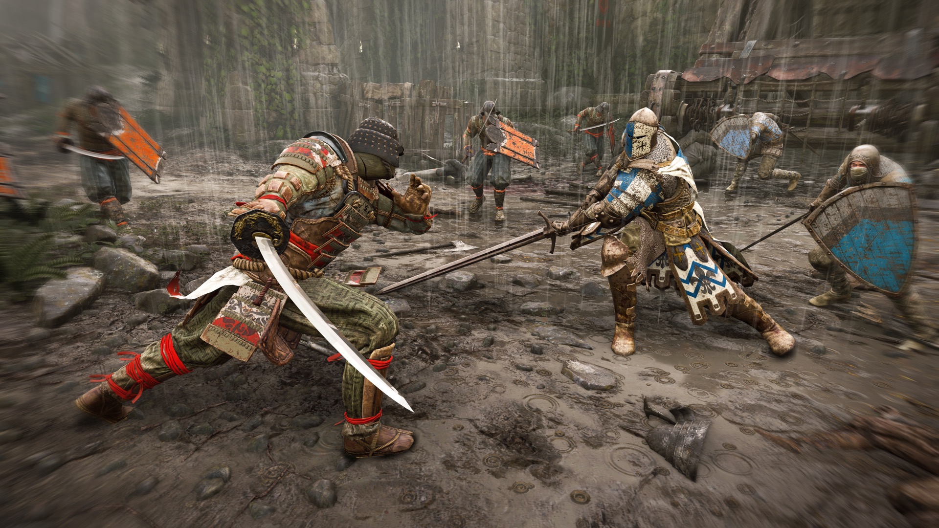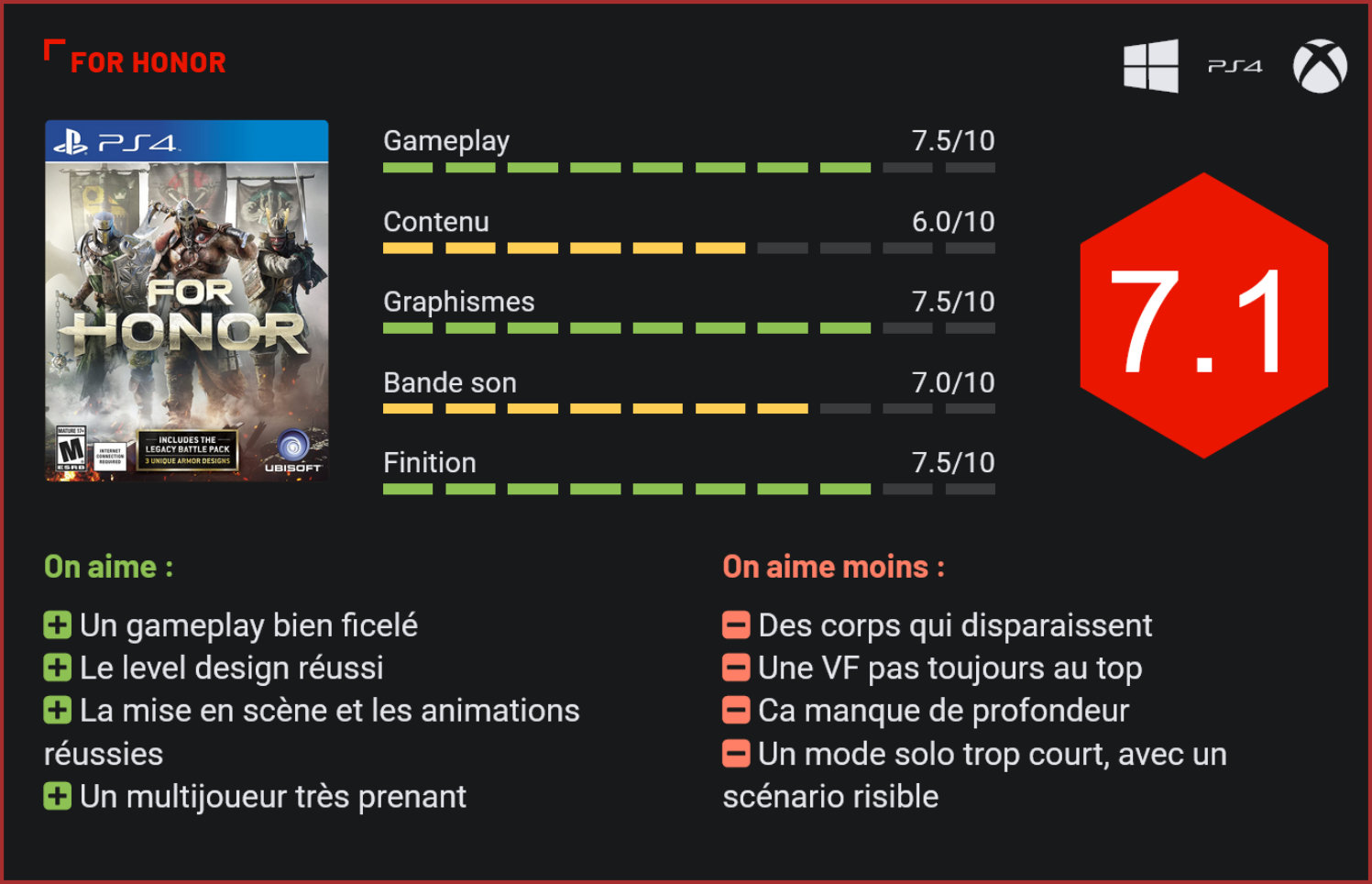 Après Steep et ses monts enneigés, Ubisoft lance une autre nouvelle licence au très gros potentiel. Ubisoft tient à diversifier ses productions. Avec Steep, et maintenant For Honor, le catalogue de l’éditeur s’enrichit de nouvelles franchises à très fort potentiel. Dans For Honor, le joueur côtoie trois factions – les chevaliers, les samouraïs et les vikings – et doit affronter les factions adverses dans des duels épiques entre groupes de belligérants. L’idée est originale, même si d’autres l’avaient fait avant Ubisoft (Chivalry Medieval, pour ne citer que lui) et envoie donc les gamers dans trois contrées distinctes fin de tuer leurs adversaires. Précisons que For Honor est disponible depuis le 14 février sur Xbox One, PS4 et PC. Un solo en guise de tutoriel Si le mode histoire n’est clairement pas l’argument de vente de ce titre, il est conseillé à tous les joueurs de passer par cette étape, ne serait-ce que pour apprendre les rudiments du métier. Durant les premières minutes de la campagne, le joueur devra étudier le maniement d’une arme et apprendre à se défendre vis-à-vis des coups portés par les ennemis. La campagne solo reste toutefois assez rudimentaire. En quelques mots, alors que toutes les factions sont moins rompues à l’art de la guerre qu’auparavant, l’Obsidienne, une armée menée par la mystérieuse Apollion, choisit ce moment pour s’imposer sur les terres de ses ennemis. Si la mise en scène et la narration, hormis quelques doublages français, sont de qualité, n’y cherchez pas un scénario abouti constitué de multiples retournements de situations. Il fallait un motif pour se battre et Ubisoft a choisi celui-là. Le joueur évoluera dès lors dans des champs de batailles très vivants. Entre châteaux forts, villages vikings ou temples orientaux, le dépaysement est total. Evidemment, la plupart des panoramas qui s’offrent à vos yeux n’en seront plus après le passage des troupes. Ils laissent la place à des maisons incendiées, des sols jonchés de cadavres, des temples détruits… Détruits ou pas, les places fortes à assiéger sont très belles et cela grâce à un level design très travaillé et les animations de qualité rendent l’ensemble encore plus immersif. En fait, seuls quelques détails (barbes, portes, etc.) manquent de finesse et donc, de réalisme. Dans cet univers moyenâgeux, je joueur devra affronter des combattants rudimentaires qui tomberont au moindre coup, à l’image des “ennemis de base” d’un beat’em all. Mais au milieu de cette masse de guerriers se trouvent des adversaires bien plus entraînés. Ceux-ci demanderont une connaissance minutieuse des mécaniques de jeu qu’il sera possible d’intégrer durant la petite dizaine d’heures qui compose le solo. D’ailleurs, celles-ci sont bien huilées et pousseront les gamers en recherche de challenges à se perfectionner. Cependant, les néophytes seront également aux anges tant le jeu réussit à satisfaire les deux catégories de joueurs. Les bases du maniement d’armes sont très simples : il suffit de pencher le joystick dans la direction du coup porté par l’ennemi pour le contrer et l’incliner dans une direction où ce même ennemi ne se protège pas pour le toucher. Il est aussi possible de briser la garde de l’adversaire, d’esquiver et d’enchaîner quelques combos. Le tout rappelle d’ailleurs un peu Mount & Blade . Tout comme dans la production de TaleWorlds Entertainment, le timing est aussi la clé d’une victoire. Dans cet ordre d’idées, le combattant devra frapper au bon moment, choisir s’il décide d’enfoncer la garde de son adversaire via un coup d’épaule par exemple ou d’asséner une attaque faible ou plus forte. Ces choix sont cruciaux si l’on ne veut pas voir son personnage se faire contrer et/ou tuer. De plus, d’autres bonnes idées viennent enrichir le gameplay. A l’image d’une jauge d’endurance qui ne devra pas se retrouver à sec au risque de voir son guerrier incapable d’esquiver le moindre coup et une jauge de vengeance, qui lorsqu’elle est à son maximum, permet au joueur de ne plus s’inquiéter de sa vie et de son endurance. Autrement dit, Ubisoft gratifie le joueur qui saura réfléchir et prendre son temps, d’un gameplay profond et travaillé. Et maîtriser ces fondamentaux permettra d’aborder le mode multijoueur de la meilleure des manières. For Honor, un jeu taillé pour le multijoueur Si le gameplay est l’argument de vente de ce jeu d’action, c’est à travers le mode multijoueur qu’il prend tout son sens. Pour commencer, le joueur atterrira sur une carte divisée entre les trois factions. Celle-ci évolue en fonction des victoires de chaque camp. Après avoir choisi son clan, le joueur devra opter pour un guerrier parmi les 4 classes de héros propres à chaque faction, soit 12 au total. Un bon point car les différences ne sont pas uniquement d’ordre esthétique : chacun des personnages possède sa propre façon de se mouvoir. Prendre un héros massif à l’image du Shoguki, c’est l’assurance d’effectuer des coups puissants au détriment d’une mobilité fluide. A l’inverse, le Nobushi est passé maître dans l’art d’asséner des coups rapides mais sa défense laisse à désirer. Ensuite, ce sont quatre modes de jeu qui se présentent au joueur : les duels (1 contre 1), les rixes (2 contre 2), les matchs à mort (4 contre 4) ou encore le mode dominion (4 contre 4 avec des objectifs à atteindre). Sans oublier les contrats que le joueur peut choisir de remplir afin de gagner encore plus de récompenses. D’un autre côté, si vous espériez pouvoir inscrire votre nom au palmarès de gigantesques batailles, ce ne sera pas le cas, Ubisoft limitant à quatre par équipe le nombre maximum de joueurs. Mais cela n’enlève rien au mode online qui s’avère des plus plaisants. Pour en revenir aux modes de jeu, le plus abouti