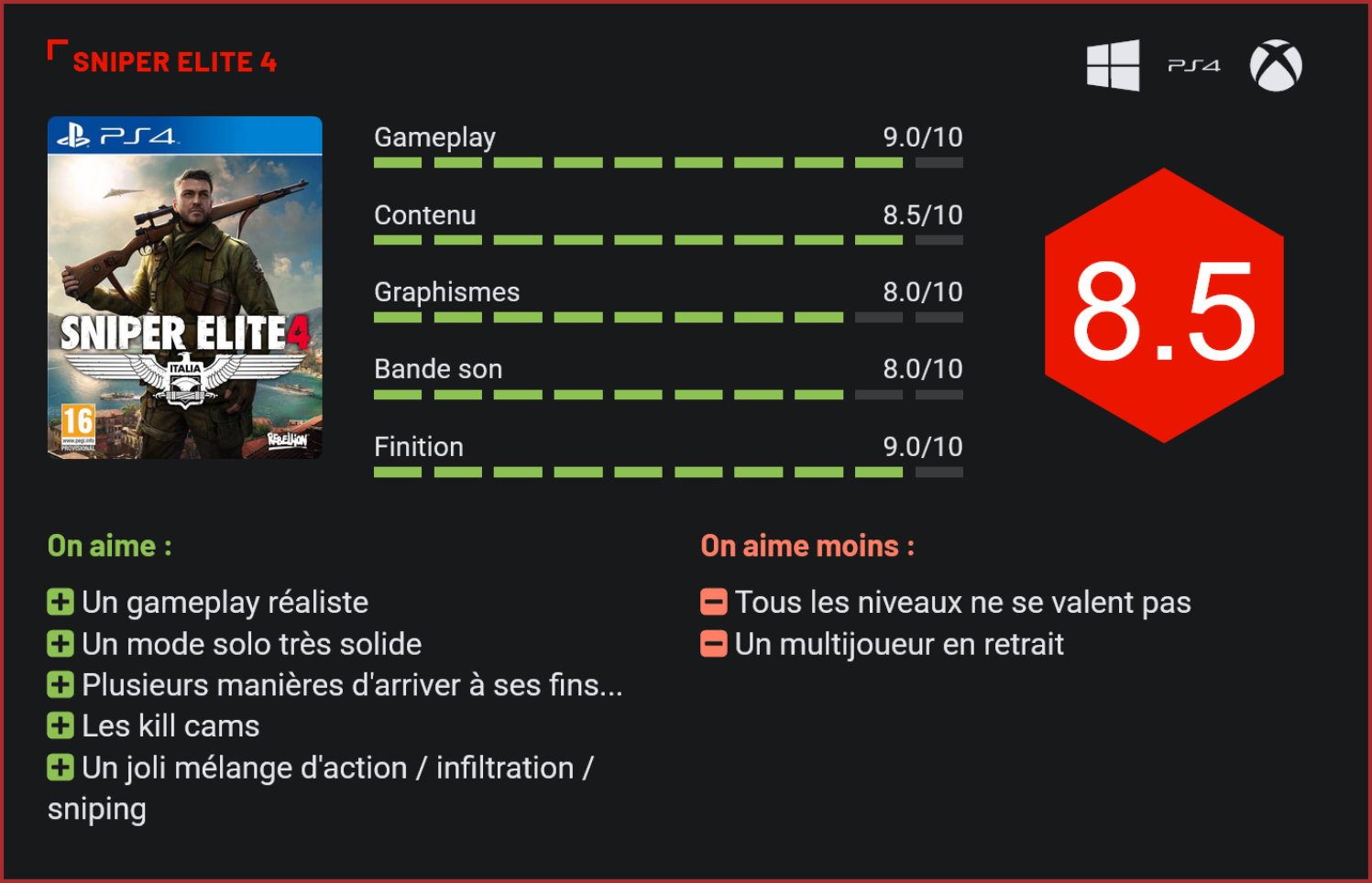 Les jeux d’infiltration n’ont plus vraiment la cote. En dépit de ce constat, Rebellion continue à proposer à intervalles réguliers de nouveaux épisodes de sa franchise Sniper Elite, avec une très belle surprise à la clé pour ce quatrième opus. La série des Sniper Elite avait séduit dès ses débuts les amateurs de jeux de guerre de par son réalisme. Se transformant au fil des épisodes d’un simple jeu de tireur d’élite en un véritable jeu d’infiltration, le jeu de Rebellion a beaucoup évolué au cours des trois dernières années. Le quatrième opus, fraîchement sorti sur PC, Xbox One et PlayStation 4, est le fruit d’un travail acharné et sans aucun doute l’une des excellentes surprises de ce début d’année. Mais avant de poursuivre, il est important de rappeler que si le jeu porte l’appellation “Sniper Elite”, il est tout à fait possible de réaliser toute une mission sans utiliser une seule fois son fusil à lunettes. Plongé en pleine Seconde Guerre Mondiale – cette fois dans les décors luxuriants de l’Italie -, le joueur doit réaliser des missions d’assassinat pour désorganiser l’armée allemande. La particularité du jeu, c’est bien sûr la grande liberté d’action qui est donnée au joueur. Chaque mission se déroule dans des décors relativement vastes et ouverts, qui donne une totale liberté au niveau de l’approche du terrain de jeu. Pour éliminer ses cibles, le joueur peut choisir de prendre position sur une colline et d’utiliser son fusil à lunette pour éliminer à distance sa cible, mais aussi s’infiltrer dans le camp et assassiner l’ennemi sans faire de bruit, voire s’attaquer à l’entièreté de la faction mitrailleuse à la main. Jeu d’infiltration oblige, mieux vaut toutefois opter pour la méthode la plus silencieuse… D’autant plus que l’intelligence artificielle des ennemis est loin d’être médiocre. Alertés par un bruit, ceux-ci fouilleront méthodiquement chaque zone avant de se diviser par patrouilles. Un simple tir déclenchera une vaste battue en direction de la position du joueur. Dans les environnements plus confinés, il sera important de rester mobile, et de ne pas hésiter à prendre de la hauteur. Sniper Elite 4 est un titre très jouissif qui force le joueur à explorer son environnement et à trouver des solutions concrètes pour se rapprocher de sa cible tout en évitant les patrouilles d’ennemis. Le réalisme fait partie intégrante de cette expérience unique, puisque le joueur pourra choisir de bloquer sa respiration pour être sûr de faire mouche, et devra prendre en compte toute une série de facteurs avant d’appuyer sur la détente. On notera d’ailleurs qu’il est possible de jouer avec la physique pour éliminer ses ennemis, en tirant par exemple sur une grue, pour faire s’abattre une tonne de métaux sur une patrouille ennemie, ou piéger ses cibles. Plus intéressant encore, le titre intègre un système de “kill cam” particulièrement sadique, qui permet de visualiser, au ralenti, les meurtres les plus sanglants, en suivant le trajet d’une balle, ou en visualisant les organes touchés lors d’une attaque au corps à corps. Par rapport aux précédents volets de la franchise, Sniper Elite 4 gagne en dynamisme mais aussi en richesse. Les niveaux sont beaucoup plus vastes, le gameplay plus réaliste et les missions autrement plus passionnantes. Pour autant, tout n’est pas encore parfait. A commencer par le scénario du jeu, platonique, qui n’est finalement qu’un prétexte pour nous faire voir du pays. Au niveau du gameplay aussi, on regrettera quelques petits bugs – pas très gênants -, mais qui montrent qu’il y a toujours un peu de travail à faire à ce niveau… Enfin, si le solo tolère une approche plus musclée, ou au contraire davantage orientée sur l’infiltration, le mode multijoueur se concentre quasi-exclusivement sur des tirs longue portée. Seuls les vrais amateurs de jeux de tir de précision s’y risqueront donc… Dommage, car les parties sont stables et le concept fonctionne plutôt bien, mais le camping est une pratique qui y est malheureusement très populaire. Reste que, dans l’ensemble, Rebellion propose un mode multijoueur riche en contenu, avec de nombreux modes de jeu différents et des cartes variées. Sur le plan technique, en revanche, Sniper Elite 4 est une très belle réussite. Les décors sont vastes, très vivants, et chargés de détails. Les modélisations des objets et personnages sont aussi très convaincantes, et le tout est d’une fluidité étonnante. Rarement, parcourir la campagne italienne aura été un pareil délice. Si Sniper Elite 4 n’a pas la carrure d’une superproduction, le jeu de Rebellion n’a clairement pas à rougir, surtout dans sa catégorie de jeux – avec un monde semi-ouvert très riche, des niveaux vastes qui regorgent de lieux à découvrir et un level-design très abouti. Conclusion Excellente surprise, ce quatrième volet de la franchise Sniper Elite fait mouche avec son gameplay très réaliste, ses vastes décors et son level-design soigné. Excellent jeu d’infiltration, le titre de Rebellion tire sa richesse de son gameplay. Pour accomplir ses missions, le joueur pourra opter entre plusieurs approches du terrain de jeu. Si le mode multijoueur est également une franche réussite, il ne convaincra – à l’inverse du solo -, pas forcément tous les joueurs compte tenu de son élitisme. Que vous aimiez où non le concept d’incarner un tireur d’élite, Sniper Elite 4 devrait figurer parmi votre liste d’achats à considérer, étant donné que le jeu mélange brillamment plusieurs genres, avec une grosse louche d’infiltration, de l’action et du snipe.