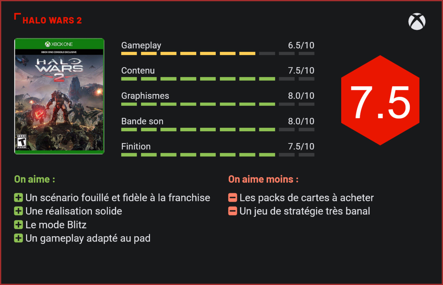 Suite directe du premier volet, sorti en 2009, Halo Wars 2 est un jeu de stratégie basé sur la célèbre franchise de Microsoft qui poursuit avec brio le travail d’Ensemble Studio. Spin-off de la franchise Halo, Halo Wars était parvenu à séduire le grand public grâce à une prise en main très simple et un campagne solo enivrante. Certes, le jeu d’Ensemble Studio n’était pas une révolution, mais il parvenait à décliner la célèbre franchise de Microsoft en jeu de stratégie avec un certain brio… Et le moins que l’on puisse dire, c’est que sa suite se sera faite attendre puisqu’il aura fallu patienter pendant 8 ans avant de pouvoir mettre la main dessus. Développé cette fois par les vétérans de Creative Assembly, le jeu Halo Wars 2 demeure une suite fidèle au premier volet et qui n’introduit finalement que peu de réelles nouveautés. Comme son ancêtre, Halo Wars 2 se destine avant tout aux fans de la franchise et aux propriétaires de Xbox One. Certes, le jeu est également disponible sur PC, mais les contrôles ont véritablement été pensés pour que le titre soit parfaitement jouable au pad. Autre point important à évoquer avant d’entreprendre une longue dissection du gameplay : l’aventure solo représente véritablement la colonne vertébrale du jeu. D’une part parce qu’elle permet de débloquer du contenu pour le nouveau mode multijoueur du jeu. D’autre part parce que l’on sent très bien que l’attention des développeurs s’est portée sur cette campagne solo – certes pas très longue (entre 6 et 9 heures) -, mais admirablement scénarisée. Car c’est bien là le plus gros atout du jeu : Halo Wars 2 continue d’explorer le vaste univers SF de la franchise avec un scénario inédit et alléchant qui se concentre sur l’affrontement des forces de l’UNSC et d’une armada de renégats covenants, isolés du reste de leur flotte. Chaque mission est entrecoupée par de longues cinématiques en images de synthèse qui n’ont rien à envier à un film d’animation à gros budget. En résulte une aventure véritablement prenante pour les fans, et qui donne surtout envie de progresser ne serait-ce que pour découvrir la destinée du Spirit of Fire et de son personnel de bord… Sans entrer dans les détails, les fans de la franchise en auront largement pour leur argent. Et cerise sur le gâteau, le jeu s’intègre parfaitement à la saga. Au niveau du gameplay, les développeurs ont corrigé la plupart des petits défauts du premier volet. Plus fluide que son aîné – malgré encore quelques petits ralentissements lors des séquences trop chargées -, le jeu est parfaitement jouable au pad et l’interface beaucoup plus accessible. Malgré sa grande accessibilité, le titre reste toutefois exigeant. Pour réussir ses missions, le joueur devra être fin stratège et gérer tant la production de ressources que les mouvements de ses troupes. Le soft se veut un skin de la franchise Age of Empires, avec toutefois moins de complexité au niveau de la gestion. Mais Halo Wars 2 ne montre toute sa richesse qu’une fois la première partie en multijoueur lancée. Que ce soit en mode duel, en 2 contre 2 ou 3 contre 3, le titre réserve de belles surprises. Coopérer fait partie intégrante de l’aventure. Pour espérer remporter la partie, les joueurs devront apprendre à coordonner leurs frappes et épauler leurs alliés en cas d’attaque. Jouer de manière individuelle sera systématiquement synonyme d’échec. Comme dans l’ancien volet, le contrôle de lieux stratégiques sera la clé de la victoire. En progressant sur la carte, le joueur devra conquérir différents avant-postes qui lui procureront les ressources nécessaires pour continuer à progresser vers l’ennemi. Le petit plus vient du mode Blitz, un nouveau mode de jeu en multijoueur qui se révèle particulièrement addictif. Basé sur un deck de cartes à composer en début de partie, le mode Blitz ouvre de nouvelles portes aux joueurs, et se révèle beaucoup plus stratégique encore que les autres, puisque basé sur un nombre d’unités limité. Malheureusement, si le joueur pourra débloquer 19 packs de cartes en solo, il devra passer par la case paiement pour débloquer davantage de contenu. Le 3 paquets étant facturés 2,99€, le calcul est vite fait… Ajoutez donc une vingtaine d’euros pour la composition d’un très bon deck. A noter que les acheteurs de l’édition ultime pourront également mettre la main sur Halo Wars : Definitive Edition, une réédition Xbox One de l’opus sorti sur Xbox 360, ainsi que sur tous les futurs DLC du jeu. Si le premier volet représente un joli bonus – surtout pour les acheteurs qui n’avaient pas pu l’essayer à l’époque -, on regrette toutefois l’absence de mise à jour sur le plan technique et de nouveautés au niveau du contenu. Definitive Edition n’est malheureusement qu’un portage tout ce qu’il y a de plus classique du jeu sorti sur Xbox 360… Conclusion A défaut d’être une totale réussite, Halo Wars 2 reste un très bon jeu de stratégie qui présente surtout l’énorme atout d’être parfaitement adapté à l’usage du pad. Joliment réalisé, agréable à parcourir en solo, fidèle à la franchise de Microsoft et offrant un mode multijoueur très solide, le jeu de Creative Assembly devrait satisfaire les fans du premier opus. On regrette toutefois que son gameplay soit aussi banal et que l’aspect gestion ne soit pas davantage exploité. Avec un contenu un peu plus original, Halo Wars 2 serait sans doute parvenu à convaincre tout le monde. En l’état, reste un très bon RTS, auquel on jouera toutefois de préférence sur PC.