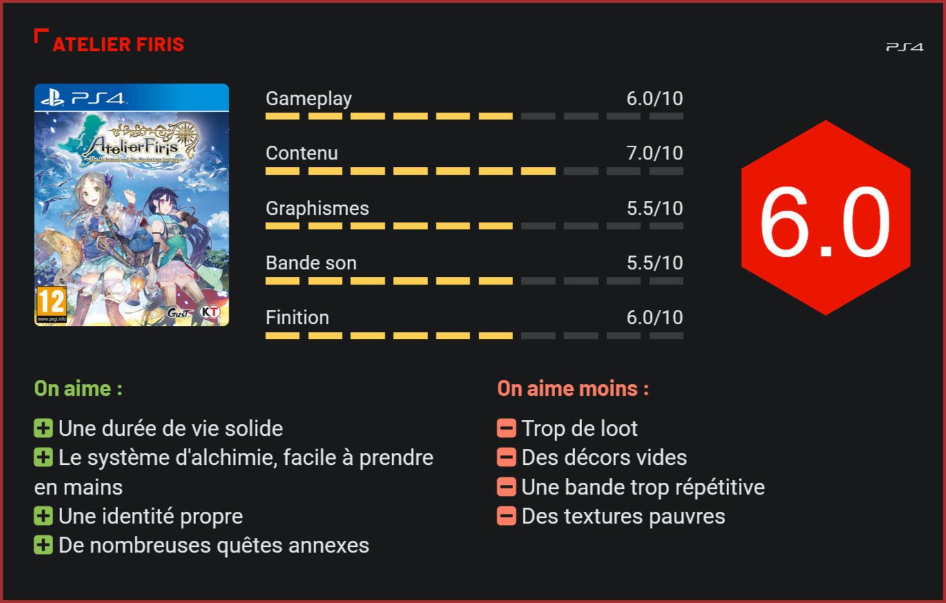La série des “Atelier” en est à son 18ème épisode avec cet “Atelier Firis”. Commencée dans les années 90, cette saga de J-RPG a toujours réussi à se placer juste derrière les plus grands jeux vidéo de son genre. Parmi les J-RPG, on retrouve les poids lourds du milieu comme Final Fantasy ou Star Ocean, et ensuite apparaissent des séries moins connues du grand public mais qui présentent un potentiel important. Dans cet ordre d’idées, on se doit de citer la franchise “Atelier”. Le premier épisode est sorti sur la première Playstation et depuis, chaque nouveau titre a réussi à proposer de quoi satisfaire les fans. Preuve en est avec la longévité de la série qui en arrive aujourd’hui à son 18ème épisode sur Playstation 4, PC et PS Vita. Un pied de nez à certains ténors Firis est une jeune fille qui vit dans une ville, une cité minière du nom d’Ertona, coupée du monde. Elle est très appréciée car elle a la capacité de dénicher en quelques secondes du minerai. Mais ce que voudrait Firis par dessus tout, c’est franchir les immenses portes de la ville afin de visiter le monde extérieur qui est, selon ses proches, “bien trop dangereux“. Les habitants ne changeront d’avis qu’après l’arrivée de deux alchimistes, dont Sophie, héroïne d’un précédent épisode. Les deux visiteurs vont donc enseigner leur art à Firis et le doyen d’Ertona donnera à la jeune fille le droit de sortir afin passer l’examen des alchimistes. Pour ce faire, Firis devra obtenir trois lettres de recommandation émanant de professionnels confirmés. C’est donc sur base de ce pitch de départ que le joueur partira à la conquête du monde. C’est d’ailleurs là le premier point positif d’Atelier Firis : la carte est grande et le joueur peut choisir d’aller où il veut, quand il le veut dès que l’introduction prend fin, soit dès le départ d’Ertona. Là où certains Final Fantasy paraissent encore trop balisés, Atelier Firis marque le coup en proposant ce que tous les adeptes attendent d’un RPG : un vaste monde non linéaire. Malheureusement, on déchante un peu face aux graphismes et à la bande-son. Si le jeu présente une identité propre avec ses personnages dont l’esthétisme renvoie directement aux plus beaux mangas, certaines textures laissent à désirer. D’ailleurs, côté détails, les intérieurs des bâtisses sont plutôt vides. En ce qui concerne le son, quelques musiques collent parfaitement à l’ambiance, pour les autres, il faudra apprendre à rester zen tant les mélodies sont très répétitives, notamment celles de l’Atelier où Firis a recours à l’alchimie. On en arrive donc au point le plus important de la série : l’alchimie, l’arme qui vous permettra de survivre dans ce jeu. Cuisine et magie font bon ménage L’alchimie est ici une méthode qui consiste à mélanger plusieurs ingrédients afin de créer un objet, cela peut aller d’une bombe à un remède en passant par du cuir. Firis possède un atelier qu’elle peut faire apparaître à certains checkpoints, des feux de camp, prévus à cet effet. Elle doit donc collecter des fleurs, du bois et d’autres ressources pour les mélanger dans son chaudron telle une sorcière. Le procédé, simple à intégrer, demande tout de même de la rigueur et de la patience. Tout d’abord, chaque objet similaire ne présente pas les mêmes caractéristiques. Un morceau de bois pourra être de meilleure qualité qu’un autre par exemple. Ensuite, le joueur devra suivre une recette et mélanger les objets demandés. La dernière étape consistera à choisir ou un non un “catalyste”, soit la possibilité de renforcer les particularités de l’objet créé. Le mécanisme est assez bien pensé puisqu’il allie simplicité, recherche et originalité. Prenons en exemple la dernière étape du processus d’alchimie. Firis devra placer les ingrédients sur une grille et le but sera de les juxtaposer sur des points prédéterminés afin de multiplier les bienfaits de la recette. Avec l’Alchimie, l’héroïne va donc créer des objets pour finir telle ou telle quête, des potions pour se renforcer lors des combats, des armes, etc. Tout ce qui permet à Firis d’avancer dans le jeu doit être créé par la magie. Tout comme pour le monde ouvert qui annonçait de très bonnes idées mais qui malheureusement a très vite révélé d’importantes lacunes, la mécanique d’alchimie sur laquelle repose Atelier Firis a été soignée mais nécessite de passer par d’autres étapes, beaucoup plus laborieuses et pénibles. Au programme, il faudra passer par le loot, la découverte de nouvelles recettes et les quêtes annexes. La collecte d’objets est très importante dans Atelier Firis. Plus le joueur en possédera, plus il pourra suivre de nouvelles recettes. Sauf que dans ce soft, la jeune fille trouvera du foin, du bois, des fleurs, du blé, des pierres, de la poussière… tous les quelques mètres. Le loot est donc omniprésent au point qu’il pourra entraîner une lassitude chez le joueur. Une chance, dans votre atelier se trouve un container sans limite d’espace et où vous pourrez stocker toutes vos trouvailles. Le deuxième point qui aurait mérité un meilleur traitement : la découverte de nouvelles recettes. Il existe deux moyens pour en trouver. Le premier consiste à se laisser guider par son instinct et certaines actions feront naître des idées dans l’esprit de Firis. Tuer un monstre, casser un rocher, trouver une pierre… Tout est source de recettes. Pour le deuxième moyen, il est question de suivre les indices disponibles dans l’atelier. Seulement, ceux-ci sont souvent assez subtils et demanderont beaucoup de patience avant d’en tirer profit. Enfin, le dernier point critiquable concernant l’alchimie repose sur le déroulement des quêtes annexes. Lors de celles-ci, vous pourrez mettre à profit vos talents et aussi, gagner des obje