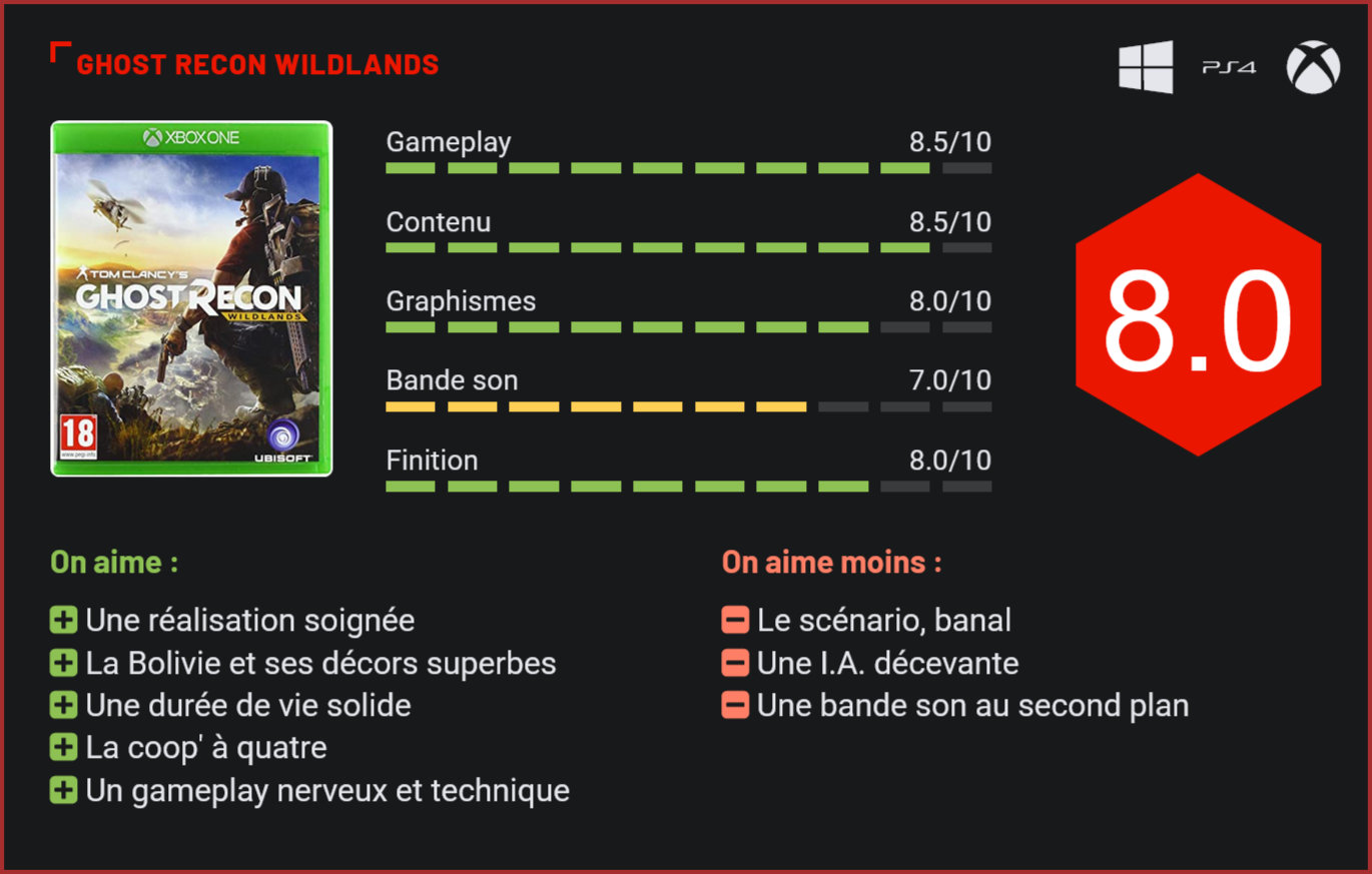 Après des années de retraite, la franchise Ghost Recon fait son grand retour avec un reboot ambitieux. Septième épisode de la franchise (si l’on considère Island Thunder et Summit Strike comme des stand-alone), Wildlands n’a pourtant plus grand chose à voir avec le tout premier volet de la série, sorti à l’époque sur PC, PlayStation 2 et Xbox. Et pour cause puisqu’Ubisoft a toujours eu la volonté de rendre sa série plus accessible et surtout de transformer “Ghost Recon” en un jeu très grand public. Ubisoft avait déjà amorcé la transformation il y a quelques années, avec les deux opus sortis sur PS3 et Xbox 360. Lorgnant à l’époque du côté des Call of Duty, les deux spin-offs n’avaient toutefois pas connu le succès escompté. Avec Wildlands, Ubisoft est reparti d’une feuille blanche et a imaginé un jeu en open-world, calqué sur le modèle de Grand Theft Auto, ou plutôt de Just Cause pour évoquer le jeu qui se rapprocherait le plus de Wildlands au niveau de son concept… Si, dans le fond, il est toujours question d’incarner un escadron de l’ombre dans un pays en pleine guerre civile, la forme a complètement changé puisque Ghost Recon n’a plus rien d’un shooter tactique. Mais que les fans de la franchise ne désespèrent pas pour autant puisque ce nouvel opus n’en demeure pas moins un très grand cru, avec ses défauts certes mais aussi ses qualités. Car, assez paradoxalement, s’écarter de son modèle est sans doute la meilleure chose qui aurait pu survenir pour cette franchise, qui avait furieusement d’un joli coup de pinceau. Certes, Wildlands n’a rien à voir avec les quatre premiers opus, mais l’approche open-world ouvre de nouvelles possibilités aux joueurs et le jeu s’avère finalement très bien conçu. Car au-delà de la découverte d’une gigantesque aire de jeu – représentant les paysages variés et souvent très dépaysants de la Bolivie -, le joueur aura surtout l’excellente surprise de découvrir des mécaniques de jeu bien huilées basées en grande partie sur Grand Theft Auto, mais avec des éléments de gameplay empruntés aux shooters tactiques. En d’autres termes, il ne s’agit pas d’un simple skin de GTA mais d’un titre qui parvient à s’identifier comme un jeu qui est parvenu à développer son propre gameplay. Plongé en pleine guerre civile, le joueur devra accompagner les rebelles dans des affrontements face au cartel de Santa Blanca et ses capitaines aux allures de psychopathes névrosés. Pour ce faire, il faudra libérer chaque région en accomplissant une série de missions qui consisteront aussi bien dans l’élimination de cibles que de courses-poursuites effrénées, d’interventions commandos et de séquences d’infiltration. La campagne solo est admirablement menée et c’est sans aucun doute l’un des plus gros points forts de ce Ghost Recon Wildlands, qui, en plus de proposer une durée de vie faramineuse (bien au-delà des 30 heures de jeu!), présente également l’énorme atout de pouvoir être intégralement joué en coopératif, et d’avoir même été pensé dans ce sens. Car Ghost Recon oblige, Wildlands vous propose de prendre le contrôle d’un squad de quatre hommes surarmés. En solo, le joueur en contrôle un seul, et peut donner des ordres assez simples à ses coéquipiers. En multijoueur, ceux-ci sont contrôlés par d’autres joueurs, qui doivent se coordonner pour venir à bout des ennemis. Nul besoin de préciser que le titre offre une beaucoup plus grande richesse de jeu en coopération que tout seul. Mais rassurez-vous, car Wildlands reste très agréable à parcourir en solo également… Au niveau du gameplay, Wildlands reste beaucoup plus technique qu’un GTA ou un Just Cause. Et on ne pourra que remercier Ubisoft de ne pas avoir davantage dénaturé sa franchise d’ailleurs! S’il est beaucoup plus accessible que le premier opus, Wildlands offre également beaucoup plus d’opportunités au joueur, compte tenu justement du fait qu’il se joue en open-world. Libre au joueur de choisir son approche sur le terrain. Pour récupérer des données dans un camp ennemi, le joueur peut opter pour un assaut frontal, utiliser un hélicoptère pour canarder la zone, lancer une frappe chirurgicale, ou agir dans l’ombre en s’infiltrant, et sans faire aucune victime. Le gameplay offre réellement une grande profondeur de jeu. On notera d’ailleurs que l’infiltration et les interventions rapides sont souvent beaucoup plus efficaces que les assauts fronteaux. Au rayon des bonnes surprises, outre la vaste palette de véhicules à conduire, et l’étendue de l’arsenal, on notera la présence de nombreux gadgets à utiliser sur le terrain, comme le drone, qui permettra de repérer ses ennemis avant de lancer une attaque – et qui est d’ailleurs un véritable régal à contrôler. Au fil des missions, le joueur débloquera également des aptitudes, et se rapprochera de groupes rebelles qui viendront lui prêter main forte dans les affrontements. Autre point fort du jeu : le nombre de missions annexes et leur variété, sans oublier bien sûr le fait que progresser dans celles-ci permet d’améliorer ses compétences et son efficacité sur le terrain. Toutefois, c’est bien l’immensité de la carte, la diversité des décors et l’efficacité du gameplay qui font de Ghost Recon Wildlands un jeu particulièrement savoureux à parcourir, en solitaire comme en multijoueur. Si l’on regrettera un scénario assez banal, des ennemis assez peu charismatiques et une bande sonore assez décevante, on apprécie en revanche clairement le travail fourni par les équipes de développement qui sont parvenues à créer un titre extrêmement ambitieux et parfaitement abouti. Certes, tout n’est pas parfait, et Wildlands aurait clairement mérité davantage d’attention au niveau de l’écriture de son scénario, mais pour une franchise qui n’a jamais é