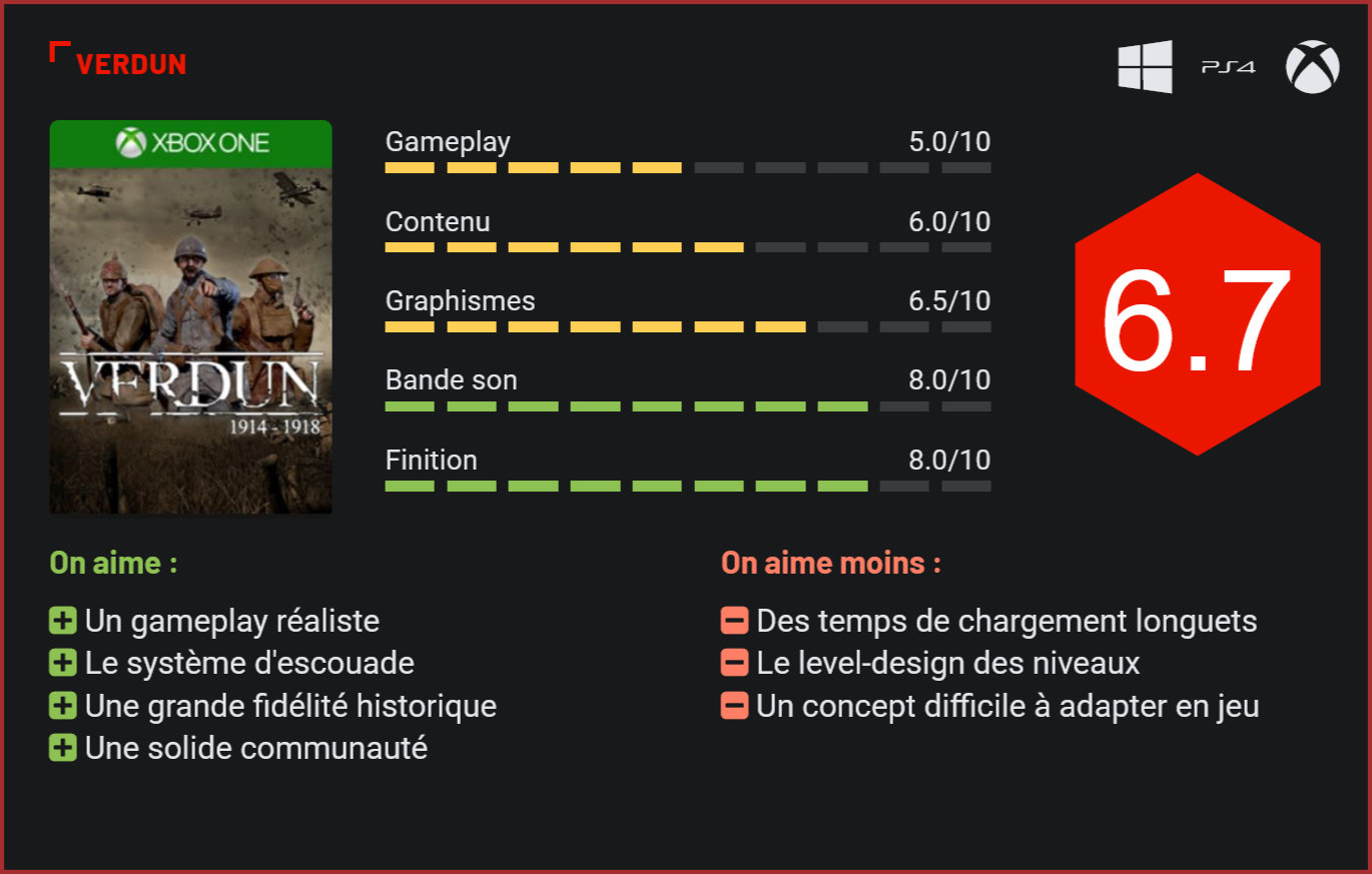 Disponible depuis un peu plus d’un an sur PC, Verdun débarque après plusieurs mois d’attente sur Xbox One et PlayStation 4. A côté des Call of Duty et autres Battlefield, il existe également des jeux de tir à la première personne plus pointus, comme le sympathique Verdun. Développé par un studio indépendant, Verdun est un jeu qui nous plonge en pleine première Guerre mondiale. Ici, toutefois, pas question de prendre part à des missions scénarisées, ni à prendre le contrôle d’un avion de chasse ou d’un char. L’intégralité du jeu repose en effet sur des affrontements entre des escouades de fantassins dans des décors exigus. En l’occurrence, les fameuses tranchées. Entièrement orienté vers le online, le jeu de Blackmill Games – un petit studio de développement néerlandais -, propose plusieurs modes de jeu. Toutefois, l’intégralité du concept repose sur le mode Lignes de front, un mode de jeu qui fait s’affronter les joueurs de deux factions (l’Axe et les Alliés) sur une ligne de front, qui évolue au gré des parties. Chaque partie est ainsi divisée en plusieurs séquences d’attaques et de replis stratégiques qui permettent aux deux forces de s’évaluer et d’évoluer sur le champ de bataille. S’il est tout à fait possible de se la jouer solo, il est préférable d’agir en équipe, ne serait-ce que parce que lorsqu’on suit le chef d’escouade, on bénéficie de bonus très intéressants sur le champ de bataille. Le défaut, c’est que lorsque les balles fusent, le bataillon peut être rapidement décimé. Et c’est justement dans cette coopération que l’on se rend compte de toute la richesse stratégique du jeu. Agir en équipe devient vite primordial, et ceux qui chercheront d’ailleurs à s’écarter de leur groupe seront froidement abattus par leur capitaine. Car Verdun est bien plus dirigiste qu’il n’y paraît. La plupart des cartes s’architecturent uniquement autour des fameuses tranchées. En s’écartant de celles-ci, le joueur recevra un avertissement indiquant qu’il sera froidement exécuté quelques secondes plus tard s’il continue dans cette direction. Une arme à double tranchant donc pour les joueurs. Car tout l’objectif des développeurs est de pousser les joueurs au corps à corps et aux attaques groupées. Si la technique fonctionne plutôt bien avec des joueurs expérimentés, ceux qui débutent auront bien du mal à saisir le concept. Notons par ailleurs que les autres modes de jeu de Verdun n’ont que peu d’intérêt par rapport à ce mode de jeu principal. Là où le titre gagne de précieux points, c’est justement au niveau de son réalisme. Une balle bien placée suffit pour abattre un ennemi. Dans le même ordre d’idée, le joueur doit également prendre plusieurs autres aspects dans les affrontements. Quelles armes il utilisera au corps à corps, ou tout simplement combien de temps cela lui prendra pour recharger. Car ici, peu voire pas de mitrailleuses, mais de vieux fusils à la cadence très lente, et surtout les incontournables baïonnettes. Notons également la présence de gaz moutarde, qui forcera les fantassins à s’équiper rapidement d’un masque à gaz lors d’une attaque. Les bruitages, d’un réalisme à glacer le sang, plongent parfaitement le joueur au cœur du conflit. En revanche, les graphismes ne font pas vraiment honneur au jeu. Très pixellisés, les environnements souffrent également d’un level-design souvent bancal et le jeu souffre globalement de temps de chargement très longs. En d’autres termes, et n’ayons pas peur de le dire, Verdun est un titre qui ne se destine qu’à un public cible très particulier, et certainement pas aux mordus de Call of Duty et autres Battlefield. Le jeu n’a d’ailleurs strictement rien à voir avec Battlefield 1, tant sur le plan technique qu’au niveau de son gameplay. Beaucoup plus réaliste que son homologue de chez E.A., Verdun est un titre qui se destine avant tout aux passionnés d’Histoire et de conflits armés. Des remarques importantes à prendre en compte au moment de l’achat, pour éviter une cruelle déception… Conclusion Ciblant un public très spécifique, Verdun est un jeu de guerre au réalisme saisissant, qui passionnera les amateurs de conflits armés, à la recherche d’un titre plus stratégique et technique que brutal. On est très loin ici d’un fast-FPS. Le rythme est posé, mais les affrontements restent meurtriers. La plupart du temps, une seule balle suffit pour mettre au tapis un adversaire. La structure des niveaux, qui suit celle des tranchées du front Ouest, fait toutefois que le jeu est très linéaire et les parties assez confuses puisqu’il s’agit ici d’une reproduction de la guerre des tranchées. Un concept sympathique mais finalement pas aussi ludique qu’on l’aurait espéré. Se jouant exclusivement en ligne, le jeu souffre malheureusement de temps de chargement un peu trop longs et d’une réalisation datée…