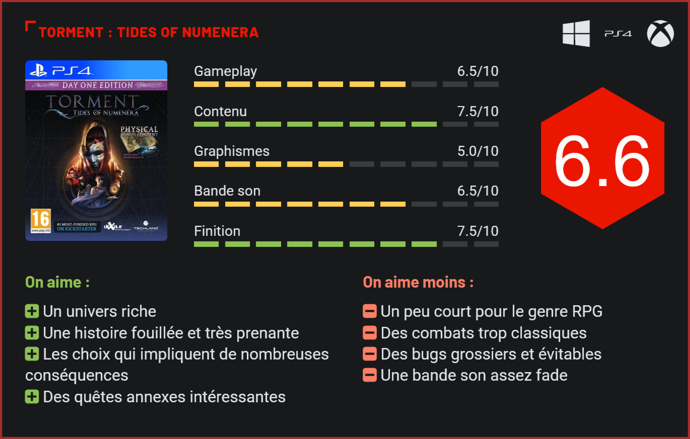 Il se présente comme la suite spirituelle de “Planescape: Torment” et se dénomme “Torment : Tides of Numenera”. Les RPG old-school ont la cote et le studio InXile compte bien en profiter avec ce nouveau soft. Les RPG old-school reviennent sur le devant de la scène depuis quelques années avec des titres comme Divinity : Original Sin ou encore Pillars of Eternity. Ils ont en commun la vue isométrique, des scénarios aboutis et un univers riche. Parmi ces jeux, on retrouve Torment : Tides of Numenera qui souhaite être considéré comme le digne successeur de Planetscape : Torment, un titre sorti en 1999 et encensé par les critiques. Ce nouvel opus (sorti sur PS4, Xbox One et PC), s’il se classe dans la catégorie “RPG old-school”, se démarque tout de même de la concurrence, notamment par la présence de milliers de lignes de dialogues donc chacune peut avoir un impact sur la suite des événements. Jouer et lire : une combinaison gagnante Dès les premières minutes de jeu, le ton est donné : le joueur se retrouve face à un écran noir dans lequel est incorporée une zone de texte. Les lignes de dialogues s’enchaînent et la seule manipulation à effectuer est de choisir ce qu’on l’on désire réaliser. L’opération n’est pas à prendre à la légère puisque chaque choix de dialogues ou d’action aura des conséquences dans Torment. Le simple fait d’ignorer une quête peut modifier l’histoire du monde qui vous entoure, là où dans un autre jeu, il est possible d’y revenir plus tard sans qu’il n’y ait de conséquences pour le background de vos personnages. Pour preuve, les premiers choix à effectuer auront un impact sur la personnalité et les capacités de votre personnage. A ce propos, il existe trois classes déterminées : le Glaive qui occupe le rôle du guerrier, le Nano qui fait office de mage et enfin, le Jack qui présente des caractéristiques équilibrées. Quand le joueur aura choisi ce qu’il veut être et quelles seront ses premières compétences, il se retrouvera après un tutoriel assez court dans la première ville du titre : Sagus. Très vite, le joueur apprend qu’il est un reliquat d’un être mystique appelé “Dieu changeant”. Ce dernier est parvenu à devenir immortel en s’appropriant des corps humains. Et vous êtes l’un d’eux. Lorsque votre créateur n’a plus eu besoin de vos talents, il a laissé tomber votre corps comme une coquille vide. Votre mémoire vous fait défaut et vous partez donc à la recherche d’éléments qui pourraient vous aider à répondre à la question : “Qui suis-je ?” Autrement dit, le titre est un prétexte à une véritable quête d’identité qu’il faudra acheminer en parcourant bien des lieux. Un background captivant Se balader dans une ville du soft constitue un véritable régal : chaque personnage secondaire à quelque chose à dire et la plupart ont une histoire à raconter. Tout cela crée un univers riche dont on veut toujours en apprendre plus. Que ce soit la cité en elle-même, le pouvoir en place ou une communauté précise d’individus, tout dans ce soft pousse le joueur à discuter encore et encore avec les PNJ. Et quel régal : les développeurs d’InXile ont accompli un travail remarquable sur les textes et sur la cohérence de l’univers de leur jeu. Entre heroic-fantasy et science-fiction, le monde de Torment : Tides of Numenera mettra des aliens, des adeptes de la magies, des robots, des mutants, etc. sur la route du héros sans que jamais le joueur n’ait l’impression que l’un d’eux n’ait rien à y faire. De plus, il est possible de constituer une équipe et donc, en réalisant les bons choix, d’être accompagné par des PNJ rencontrés en cours d’aventure. Par exemple, lorsqu’une petite fille est à la merci d’un kidnapping, vous pourrez choisir de ne pas vous en mêler, de tuer directement votre opposant, de persuader votre ennemi de rebrousser chemin, de le payer… Ensuite, si vous avez pris le parti de la fille en question, rien ne vous empêche de l’intégrer à votre équipe. Un personnage de plus représentera une aide utile notamment lors des combats. Ces derniers sont assez rares puisqu’il est possible de les éviter du premier au dernier grâce aux dialogues. A ce propos, les combats en tant que tels sont très classiques : lancer un sort, une attaque physique ou encore un cypher (un objet à usage unique). Néanmoins, deux particularités viennent s’immiscer dans les joutes. Tout d’abord, il est possible de discuter avec l’ennemi au milieu d’une confrontation afin de le persuader qu’il existe une autre solution. Ensuite, les personnages peuvent interagir avec le décor grâce à des points de puissance, de dextérité et d’intelligence. D’ailleurs, ces fameux points devront être utilisés tout au long de l’aventure : si le reliquat que vous contrôlez croit avoir déjà vu la machine qui se situe en face de lui, il peut tenter de s’en rappeler en faisant appel à sa mémoire, pour ce faire il devra user d’un point d’intelligence. Quand une autre situation vous demandera de déplacer un obstacle, vous pourrez dépenser des points de puissance. Cet usage doit être réfléchi car les points, dont la réserve augmente avec votre expérience, sont limités en nombre et en profiter n’est pas pour autant synonyme de succès. Et encore une fois, la réussite ou la défaite de votre entreprise influera sur le monde qui vous entoure. Un monde qui d’ailleurs est régi par des flux dominants dont chacun dépend de vos actions et choix de dialogues. Par exemple, le rouge signifie que la tendance est celle des passions, de l’émotion ou de la prise de décision directe. Précisons que si les conséquences résultant des dialogues sont perceptibles, celles liées aux flux restent tout de même assez mineures. Dommage puisque les changements de flux sont souvent portés à l’attention du joueur comm