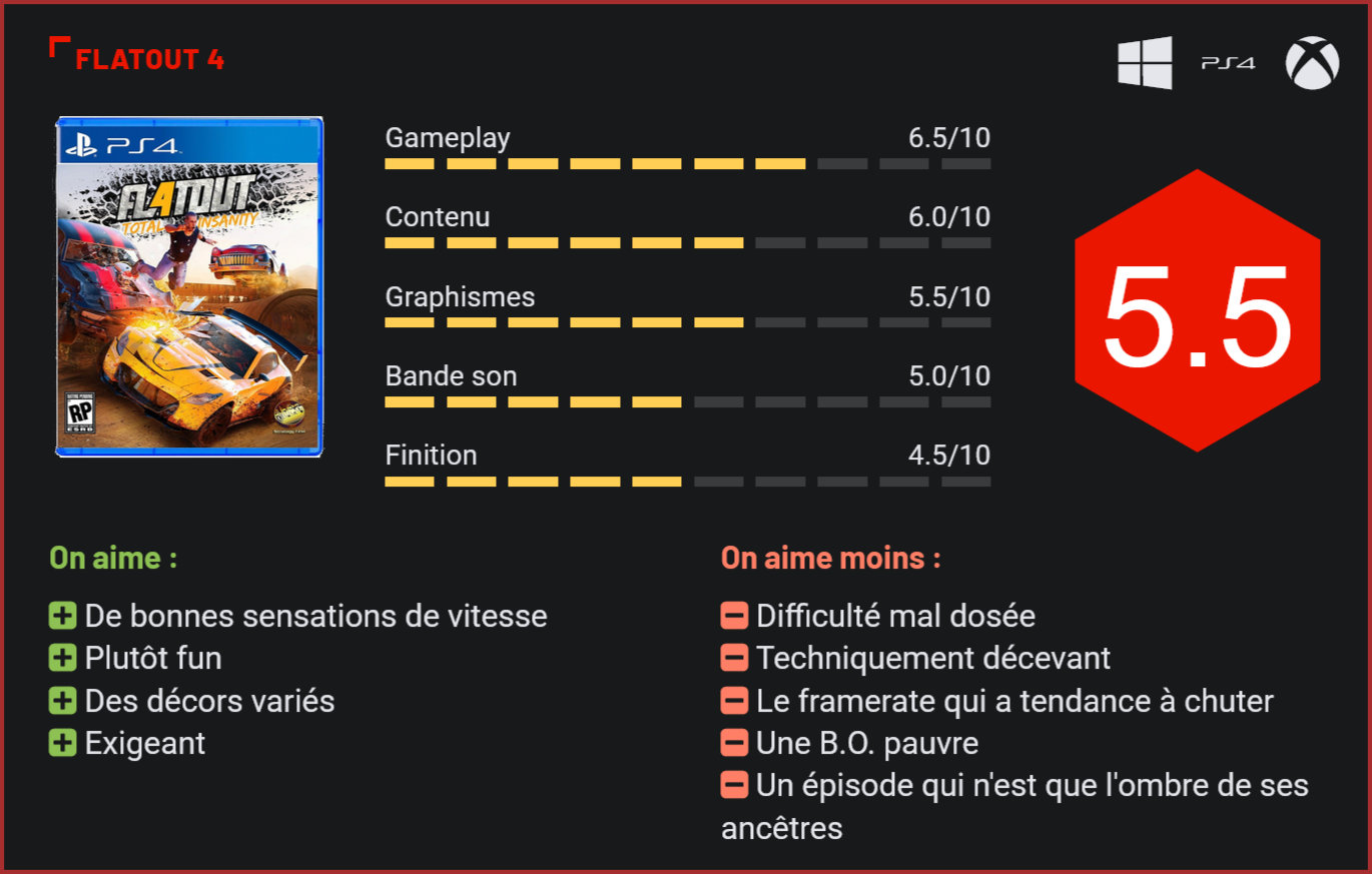 Reprise en mains par le studio français Kylotonn après des années d’errance, la franchise FlatOut opère un retour sur le devant de la scène avec Total Insanity, un épisode qui n’est toutefois qu’une demi-réussite. Depuis FlatOut Ultimate Carnage, les fans de la franchise n’avaient plus eu droit à un épisode digne de ce nom pour la franchise FlatOut, qui avait sombré dans les jeux à tout petit budget avec le troisième épisode de la série, sorti uniquement sur PC. Six ans après le naufrage, la série nous revient avec un nouveau studio de développement à la tête du projet : les français de Kylotonn, qui avaient déjà signé le sympathique WRC 6. Et dès le premier contact, on se rend compte qu’on monde sépare le troisième opus, sorti en 2011, et ce nouvel épisode, qui à défaut d’être aussi excellent que les deux premiers volets de la franchise – et que l’incontournable Ultimate Carnage -, parvient à redresser la barre. Comme dans les deux premiers volets, on retrouve les épreuves barrées qui ont fait tout le succès de la série : des cascades aux matchs à mort en passant par l’incontournable mode carnage. Finalement très proche du Destruction-Derby-like, le jeu tire son épingle du jeu au niveau de son mode carrière, qui alterne brillamment les épreuves et a le mérite à nous garder scotché au pad. Décomplexé, Flatout 4 Total Insanity n’hésite pas à jouer la carte de la surenchère, avec des environnements presqu’entièrement destructibles, des carambolages mémorables et un gameplay qui ne laisse aucune place aux erreurs. Si le manque d’expérience de Kylotonn se fait un peu ressentir – tant au niveau de la difficulté, très aléatoire, que du framerate, lui aussi très aléatoire -, tous les ingrédients d’un très bon FlatOut sont au programme. Les décors sont variés, presqu’entièrement destructibles, et regorgent de raccourcis à découvrir. En ce qui concerne le gameplay, Total Insanity est à la fois relativement exigeant et incroyablement fun. Les sensations de vitesse sont là, et le feeling est plutôt bon. Au final, on regrettera juste que le plaisir soit un peu gâché par une difficulté mal dosée avec des courses ou trop faciles ou trop difficiles. Le plus gros défaut du jeu vient finalement de sa réalisation. Malgré tous les efforts du studio de développement, on sent très clairement que le budget alloué au projet n’était pas faramineux, et c’est bien là tout le problème car les épisodes précédents avaient justement comme atout un moteur graphique époustouflant. Si le résultat n’est pas catastrophique, on se situe tout de même à des années lumières d’un Forza Horizon 3. Au final, les impressions sont donc plutôt mitigées. Flatout 4 : Total Insanity est un joli retour aux sources pour la franchise. Tous les ingrédients d’un bon Flatout sont là, sauf peut-être un moteur graphique digne de ce nom. Mais l’expérience est sans doute ce qui manquait aux développeurs, qui ne parviennent pas à nous livrer un titre exempt de défauts. Ralentissements, bande sonore bas de gamme, décors souvent assez pauvres et level design parfois à la rue font de cet épisode un titre très moyennement convaincant, qui séduira peut-être les fans de la franchise, dans le bac à soldes, mais ne mérite en tout cas certainement pas une cinquantaine d’euros. En digital, la recette aurait sans doute mieux porté ses fruits. Dommage, car le potentiel était là. Conclusion S’il redore un peu le blason de la franchise, et s’avère même être une bonne surprise, compte tenu de l’historique de la série, Total Insanity est encore loin de remplir son contrat, la faute à des graphismes d’un autre âge, un framerate qui a tendance à flancher et une difficulté relativement mal dosée. A condition de ne pas y mettre plus de quelques dizaines d’euros les fans de la franchise passeront toutefois un agréable moment. Les sensations de conduite de ce jeu de course arcade sont plutôt bonnes, les décors et épreuves variés et le titre reste relativement fun à parcourir. Bref, un petit jeu pas déplaisant qui aurait sans doute mérité un plus gros budget de développement…