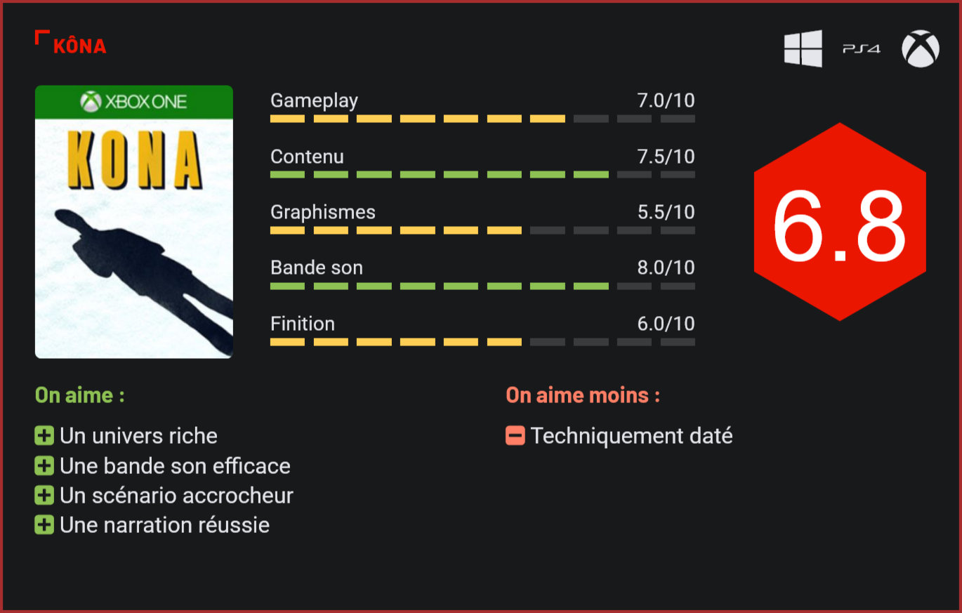 Imaginé par un petit studio de développement canadien, Kôna est un jeu d’aventure qui emmène le joueur dans le froid glacial du Québec enquêter sur une série de disparitions mystérieuses. Parti enquêter sur une série de disparitions dans une petite bourgade du Québec, le détective privé Carl Faubert parcourt les routes du Québec en quête de son contact, un riche homme d’affaires qui l’a embauché pour cette affaire. A quelques kilomètres de sa destination, il a un accident avec un autre véhicule. Il se réveille alors en plein blizzard, et part à la recherche d’un abris. Surfant sur la vague des jeux de survie, Kôna est un titre à l’ambiance et au design particulier, qui propose une expérience proche d’une œuvre cinématographique. Comme The Long Dark, le jeu se joue entièrement à la première personne, et plonge le joueur dans un vaste monde ouvert et enneigé. S’il partage certains éléments de gameplay avec les autres titres du genre, Kôna adopte toutefois une approche très différente puisque le joueur est ici plongé au cœur d’une enquête qui tend à tirer vers le surnaturel. L’atmosphère est lourde, pesante même, et le jeu réserve ses quelques moments de frisson. Mais dans l’ensemble, c’est surtout son scénario très mystérieux qui pousse le joueur à s’accrocher et à avancer dans l’aventure. Si le jeu se déroule en monde ouvert, et laisse au joueur la possibilité de mener son enquête de la manière qu’il souhaite, en choisissant de privilégier certaines pistes, les environnements ne sont pas aussi vastes qu’on aurait pu le penser et le titre se révèle donc plus dirigiste que prévu. Ce qui n’est en aucun cas un défaut. Car on le répète, la narration occupe ici un rôle central. Au niveau de son gameplay, on se retrouve avec un jeu d’aventure se déroulant entièrement en vue subjective, globalement assez immersif, mais un peu mou du genoux. Logique, puisque c’est le genre qui veut ça. S’il vous arrivera d’affronter des loups, armé d’une simple carabine ou d’une hache, vous passerez le plus clair de votre temps à parcourir des lieux à la recherche d’indices et d’objets qui vous permettront d’avancer dans votre enquête – une clé pour ouvrir une porte, un code pour ouvrir une caisse enregistreuse, une buche pour allumer un feu et vous réchauffer, et j’en passe. Notre enquêteur est bien sûr équipé de quelques objets de base, comme un appareil photo, qui lui permet de capturer quelques clichés pour son enquête, ou une lampe torche, qui lui permettra de se repérer dans les caves et greniers – mais l’essentiel du gameplay se base sur cette recherche constante d’indices et d’objets. Par ailleurs, les développeurs ont eu la riche idée d’équiper le joueur d’un pickup, qui lui permettra de parcourir la carte plus rapidement, et d’éprouver par la même occasion de bonnes sensations de conduite sur des routes verglacées. Là encore, les décors grandioses du Québec, sa nature glaciale et ses nombreux mystères jouent de leurs charmes et parviennent à séduire le joueur, immergé dans un univers radicalement différent de ce qu’il a l’habitude de voir dans les titres à gros budget. Certes, le titre aurait pu être visuellement plus abouti – ses graphismes sont très clairement très en deçà de ce qu’on est en droit d’attendre sur PC et consoles de jeu. Mais l’univers riche de Kôna, son intrigue et son gameplay en font un titre très agréable à parcourir. Qui plus est, la bande-sonore, avec un joli doublage québécois, exerce un certain charme sur le joueur, qui se laissera très vite conquérir par la richesse de l’univers de Kôna. Un titre à conseiller donc. Conclusion Franche réussite en dépit de ses graphismes d’un autre âge, Kôna est un excellent jeu d’enquête surnaturelle, qui plonge le joueur dans les décors enneigés du Québec, pour le moins dépaysants, et livre une expérience narrative très riche. Un jeu mystérieux, à la beauté cachée, qui mélange brillamment différents genres, de l’enquête au jeu de tir en passant par l’exploration et la survie.