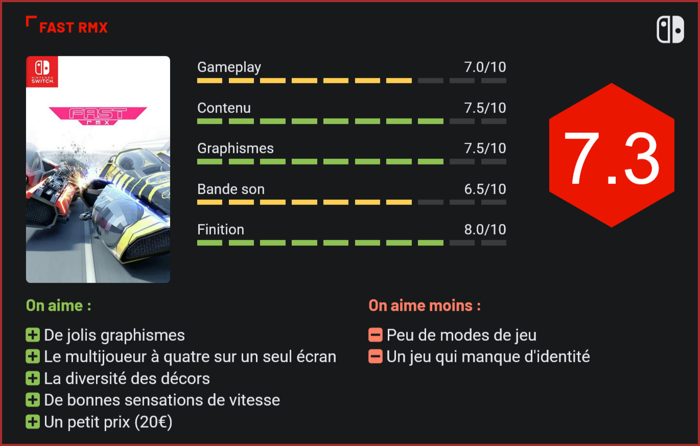 Passé presqu’inaperçu dans le line-up de lancement de la Switch, Fast RMX fait pourtant partie des meilleurs titres actuellement disponibles sur la plate-forme. Lorsqu’on pense à la Switch, on songe bien sûr à Zelda : Breath of the Wild et 1-2 Switch, mais pas forcément à Fast RMX, un jeu de course futuriste développé par un petit studio de développement allemand et sorti exclusivement sur l’eShop. Le jeu de Shin’en a pourtant plus d’un atout à faire valoir. A commencer par le fait qu’il s’agit à l’heure actuelle du seul représentant du genre sur la plate-forme, mais aussi de l’un des seuls jeux de course futuristes sortis sur une console de salon au cours des 5 dernières années. Car outre WipeOut et F-Zero, les consoles de jeu n’ont plus accueilli de vrai bon jeu de course futuriste depuis… Xtreme G (Nintendo 64) et Quantum Redshift (Xbox) ! Dans ce contexte, et même s’il n’apporte rien de vraiment neuf, on ne pouvait qu’accueillir à bras ouverts ce Fast RMX, qui se révèle être la vraie bonne surprise de ce line-up de lancement de la Switch face à un Breath of the Wild qu’on savait déjà excellent. Vous l’aurez compris, le principal défaut de Fast RMX est son manque d’originalité. Les développeurs du jeu se sont clairement inspirés des classiques du genre. Une approche difficilement critiquable dans la mesure où il s’agit d’un petit studio de développement qui n’a pas forcément les moyens de rendre plusieurs maquettes d’un seul et même projet. La bonne nouvelle, c’est que Fast RMX n’en reste pas moins un très bon jeu de course futuriste, fun, exigeant et qui propose suffisamment de contenu pour vous tenir scotché à votre console durant des heures. Dès les premières minutes de jeu, on (re)découvre des sensations qu’on pensait ne plus jamais connaître au volant d’un véhicule qui file à toute allure sur des pistes sinueuses, en plein désert ou en pleine tornade. Le gameplay de Fast RMX est incroyablement nerveux mais aussi très exigeant. Passé les premières compétitions, on se rend compte que le titre imaginé par Shin’en est beaucoup plus complexe qu’il n’y paraît. Car outre les déplacements latéraux, le joueur doit également gérer son turbo, et les différents boosts positionnés stratégiquement sur la piste – en n’oubliant pas de changer la couleur de son turbo pour bénéficier d’une accélération prodigieuse en passant dessus. A cela s’ajoutent différents obstacles et “événements” qui viendront perturber la course, et rendront encore plus ardue la victoire. Si les premiers tracés sont étonnamment faciles à boucler, on se rend très vite compte qu’il faudra parfois recommencer plusieurs fois une course pour espérer décrocher une médaille dans chaque coupe de la carrière. Comme Mariokart, Fast RMX propose différentes “coupes” réparties selon les performances des véhicules, avec un niveau de difficulté qui grimpe en fonction de la vitesse. Outre un mode solo, le jeu propose également un mode multijoueur plutôt efficace, qui manque toutefois de diversité au niveau des modes de jeu. Vu le prix du jeu sur l’eShop, difficile de trouver quoi que ce soit à redire – après tout, il ne s’agit pas d’un titre vendu 60€ en magasin ! -, mais nous aurions certainement apprécié un peu plus de diversité au niveau du gameplay. Ceci étant dit, les tracés et environnements sont assez nombreux pour vous tenir scotché à votre pad durant des heures. Outre la diversité des environnements, on apprécie aussi le fait que certains tracés subissent des conditions météorologiques extrêmes qui modifient sensiblement la conduite. En revanche, on regrette le manque relatif de vie dans ces environnements, qui manquent d’un certain authentisme. Pour le reste, les sensations sont là, la bande sonore est très efficace et les graphismes en mettent plein les yeux, avec de superbes effets visuels et de jolis effets d’accélération à 60 images par seconde. Le petit plus : les développeurs ont été jusqu’à intégrer un mode multijoueur à quatre en écran splitté, qui devrait réjouir les amateurs de home party. Conclusion Fast RMX est sans aucun doute l’une des plus belles surprises du line-up de lancement de la Switch. Dans la veine des WipeOut et autres F-Zero, Fast RMX est un excellent jeu de course futuriste, nerveux et technique, qui se caractérise surtout par ses jolis graphismes et son mode multijoueur à quatre sur un seul écran. S’il manque d’originalité, et ne propose que peu de diversité au niveau des modes de jeu, Fast RMX n’en reste pas moins l’un des meilleurs représentants du genre et un incontournable de la Switch, qui a en outre le mérite d’être proposé à un prix très compétitif (20€).