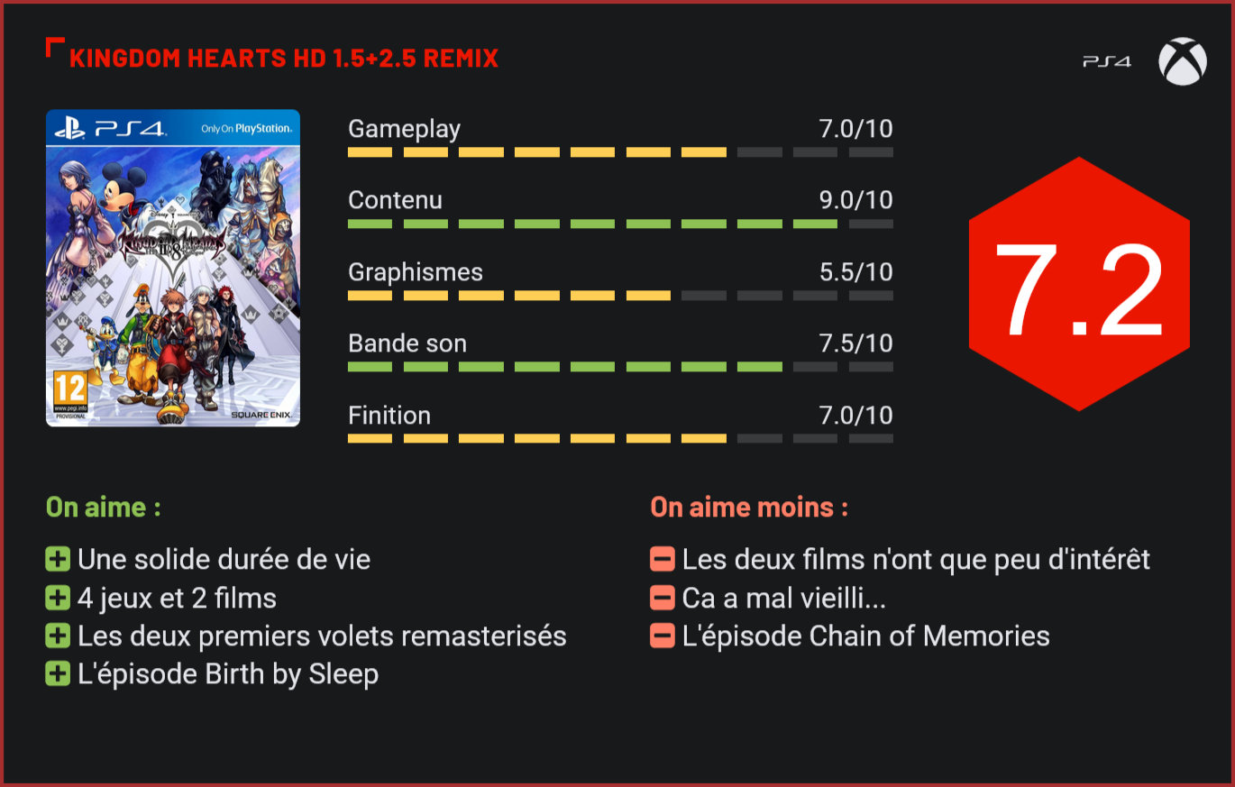Après un Kingdom Hearts 2.8 relativement décevant, Square-Enix nous livre une nouvelle compilation regroupant cette fois les deux premiers opus de la franchise, remis au goût du jour pour notre plus grand bonheur. En janvier dernier, Square-Enix nous avait déjà livré une première compilation regroupant les différents spin-off de sa série des Kingdom Hearts. La démarche était assez maladroite, dans la mesure où ceux qui n’avaient encore jamais goûté à la franchise ne pouvaient pas partir sur de solides bases, et il était donc très difficile de comprendre l’univers sans avoir essayé les deux premiers volets de la franchise. Heureusement, une seconde compilation pointe aujourd’hui le bout de son nez sur PlayStation 4. Elle regroupe cette fois deux cinématiques et quatre jeux complets – à savoir Kingdom Hearts Final Mix, Kingdom Hearts Re:Chain, Kingdom Hearts II FINAL MIX et Kingdom Hearts Birth by Sleep FINAL MIX. Fondamentalement, cette compilation est donc beaucoup plus intéressante que la précédente, ne serait-ce que parce qu’elle rassemble les deux premiers opus de la franchise, ainsi que l’excellent Birth by Sleep, mais aussi parce qu’elle est beaucoup plus généreuse que le 2.8 en terme de contenu. Mêlant brillamment les univers de Final Fantasy et de Disney, les deux premiers volets de la franchise plongent le joueur dans une saga aux relents épiques en proposant au joueur de combattre la pollution qui ronge les différents univers et de sauver la princesse de chaque monde. Assez simples d’accès les deux jeux adoptent un gameplay à mi-chemin entre le jeu de rôle tactique et le jeu d’aventure avec des affrontements en temps réel et des combats de boss épiques. Les deux jeux ont bien sûr beaucoup vieilli depuis leur sortie sur PS2, mais ils restent parfaitement jouables. Ceux qui envisagent de faire le troisième volet se doivent de toute manière de passer par cette compilation, ne serait-ce que pour avoir le background de l’histoire. Il faudra en revanche prévoir des heures de disponibilité dans son agenda pour espérer finir l’aventure, chaque titre réservant plusieurs dizaines d’heures de jeu… Si les remasters de Kingdom Hearts 1 & 2 représentent l’épine dorsale de cette compilation, les fans de la franchise pourront également redécouvrir le sympathique Chain of Memories, un épisode sorti à l’époque sur GameBoy Advance et qui avait eu droit à un portage sur PlayStation 2, qui permet de revisiter les univers du tout premier volet dans la peau d’un nouveau personnage et lève le voile sur plusieurs aspects du scénario. Visuellement, le jeu a très mal vieilli, et le gameplay a été assez mal porté sur console de salon, mais sa présence sur la galette reste appréciable pour ceux qui n’avaient pas pu toucher à cet épisode à l’époque. Reste que la vaste majorité des joueurs zapperont probablement cet épisode pour se consacrer aux trois autres jeux présents sur la galette. Si lui aussi a beaucoup vieilli, l’épisode Birth by Sleep reste sans doute la meilleure surprise de cette compilation, ne serait-ce que parce qu’il introduit un gameplay beaucoup plus nerveux, basé en grande partie sur les affrontements au corps à corps. Là aussi, le scénario se veut un complément aux deux premiers volets, mais c’est surtout pour son gameplay que ce spin-off mérite le détour. Au final, si cette compilation est somme toute généreuse en contenu, on regrette que les différents spin-off qui composent l’épisode 2.8 ne soient également livrés sur la galette. Ceux qui auront particulièrement apprécié l’épisode Birth by Sleep devront de ce fait se rendre de nouveau en magasin pour acheter la compilation 2.8, qui intègre sa suite directe, développée spécifiquement pour la PS4. Au final, livrer une seule compilation aurait été beaucoup plus intelligent. L’approche marketing forcera donc les vrais fans de la franchise à passer deux fois à la caisse au lieu d’une. Dans l’absolu, on notera toutefois que rien n’empêche celui qui débute de se procurer d’abord Kingdom Hearts HD 1.5 + 2.5 ReMIX, avant d’éventuellement retourner en magasin pour se procurer l’autre compilation. Le seul véritable regret que nous pourrions finalement avoir vis-à-vis de cet opus vient de la réalisation graphique. Car si Square-Enix a légèrement fluidifié l’expérience, et amélioré les graphismes, les différents titres de la compilation ont très mal vieillis. L’aliasing est omniprésent, les caméras sont mal gérées et le gameplay n’est plus du tout adapté au support. Reste que pour les rétrogamers, et les fans de Square-Enix, cette nouvelle compilation reste une aubaine pour (re)découvrir l’une des sagas les plus emblématiques de l’éditeur avant la sortie du troisième épisode. Conclusion Si on regrette que Square-Enix nous livre deux compilations au lieu d’une, il faut bien reconnaître que cette seconde compilation qui regroupe les deux premiers volets de la franchise, deux spin-off et deux films se révèle beaucoup plus intéressante, ne serait-ce qu’au niveau de son contenu que Kingdom Hearts 2.8. Certes, les jeux ont mal vieilli, mais ceux qui n’ont pas encore touché aux deux premiers opus devraient logiquement apprécier cette plongée dans l’univers de Kingdom Hearts avant de pouvoir mettre la main sur le troisième épisode tant attendu. Généreuse en contenu, la compilation Kingdom Hearts HD 1.5 + 2.5 ReMIX représente en tout cas un joli investissement pour les fans de la franchise, qui retrouveront sur une seule galette quatre jeux et deux longs-métrages basés sur l’univers de Kingdom Hearts.