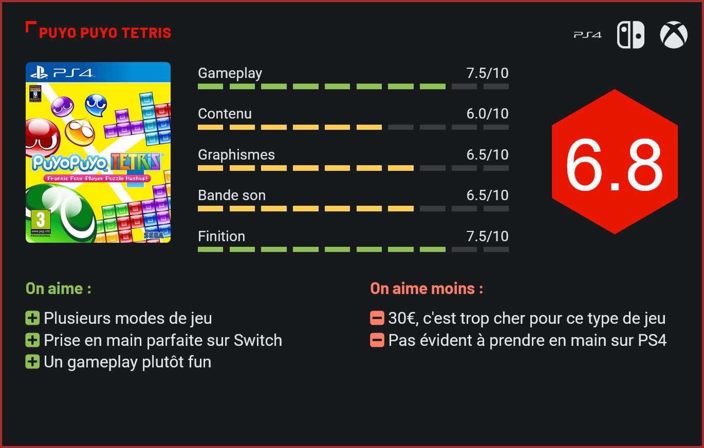 PlayStation 4 et Nintendo Switch accueillent Puyo Puyo Tetris, un nouveau tetris-like édité par Koch Media, qui tente de moderniser un genre de jeux qui avait pris un sérieux coup de vieux… Tetris, ce jeu où l’on empile des briques de diverses formes afin de former des lignes complètes et de marquer des points, est connu de tous et reste un bon parti pour s’occuper lors d’un voyage en transport en commun ou encore pour éviter de s’ennuyer dans une salle d’attente. Un peu moins connue, la franchise Puyo Puyo n’avait plus eu droit à un nouveau volet depuis quelques années. Née au début des années 90, la série avait fait ses débuts en salles d’arcade. Et tout comme Tetris, le concept – qui consiste à associer des groupes de 4 “Puyo” de même couleur pour les faire disparaître – rencontre très vite un énorme succès. Fusionnant les deux univers, Sega nous propose aujourd’hui un titre très fun, qui modernise brillamment ce style de jeu très rétro. Une pluie de modes de jeu Puyo Puyo Tetris propose une kyrielle de modes de jeu parmi lesquels on retrouve un mode histoire, un mode fusion, un autre dénommé “Party” ou encore le “Big Bang”. Les adeptes de ces jeux de réflexion/puzzle en auront donc pour leur argent puisque les variantes sont nombreuses. Au programme, il est possible de jouer uniquement à Tetris, uniquement à Puyo Puyo, à un mélange des deux, à un duel contre un autre adversaire, à un mode scénarisé… Ce dernier se présente d’ailleurs sous le nom de “mode aventure”. Après avoir choisi un personnage issu de la série Puyo Puyo Fever, le joueur devra enchaîner une série de défis (gagner une partie de Tetris dans un temps limité, réaliser un meilleur score que son adverse à Puyo Puyo, etc.) entrecoupés par des dialogues entre les différents personnages. Le scénario est des plus simplistes : les protagonistes peuvent se téléporter en jouant à Puyo Puyo et se retrouvent sur un vaisseau spatial où les pilotes ne connaissent que… Tetris. S’ensuit une série de parties entre les membres de l’équipage et les personnages de Puyo Puyo. L’intérêt se situe évidemment dans les défis à relever et non dans la trame scénaristique, des plus “banales”. Parmi les autres modes de jeu, les “Party” et “Big Bang” peuvent être considérés comme les meilleurs modes du soft. Dans le premier, le joueur affronte soit un autre joueur, soit l’intelligence artificielle sur un tableau séparé. Chaque participant reçoit des objets qui, lorsqu’ils sont activés, font apparaître des malus qui influencent le tableau de l’autre joueur. Par exemple, il est possible d’empêcher les briques Tetris de tourner pour un temps limité chez l’adversaire. Le mode “Big Bang”, quant à lui, fait apparaître la même pièce plusieurs fois de suite (un rectangle pour Tetris et deux Puyo mauves pour Puyo Puyo) et demande de la placer au meilleur endroit pour faire disparaître un maximum de “lignes” de briques pour Tetris et le plus de Puyo possible, selon le mode de jeu. Dans l’ensemble, Puyo Puyo Tetris reste donc un bon titre pour les amateurs de jeux de puzzle. Reste à savoir si le public répondra présent pour ce type de jeu bien plus adapté à une configuration portable, comme le propose la Switch, que sur une console de salon – et surtout, si le prix de vente un poil excessif du jeu ne lui portera pas préjudice… Il eut sans doute été plus intelligent de sortir le jeu en version numérique, à un prix de 10€, qu’à 30€ en version physique… Conclusion Extrêmement divertissant, Puyo Puyo Tetris est un excellent tetris-like qui se caractérise surtout par la richesse de ses modes de jeu. Parfaitement adaptée à la Switch, la prise en main passe un peu moins bien sur PS4. Séduisant, le titre a toutefois le défaut d’être vendu au prix plein (30€ en magasin). Regrettable, lorsqu’on sait qu’une copie numérique à 10€ aurait sans doute remporté un beaucoup plus gros succès…