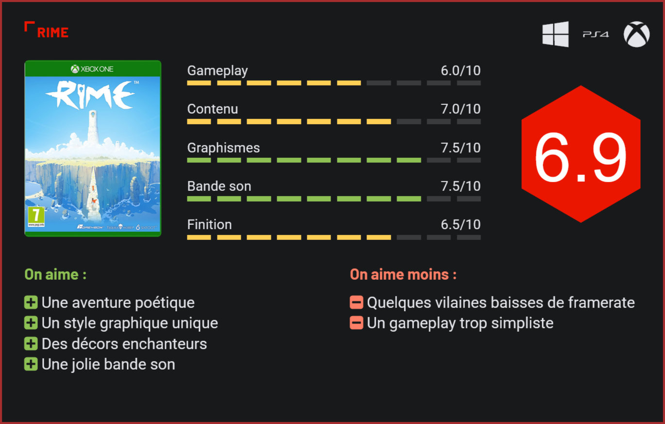 Mêlant exploration, énigmes et poésie, Rime est l’une des excellentes surprises de ce mois de mai 2017! Initialement censé sortir exclusivement sur PlayStation 4, Rime avait été récupéré en cours de route par Greybox, un petit éditeur qui s’est décidé à porter le projet sur les autres plates-formes (PC, Switch & Xbox One). A mi-chemin entre The Legend of Zelda Wind Waker et Myst, le jeu du studio de développement Tequila se veut un cocktail de genres qui tire surtout sa richesse de son style graphique, dans la droite lignée de l’excellent Wind Waker. Assez paradoxalement pourtant, le scénario et la mise en scène du jeu sont ultra-minimalistes. Pas de cinématiques de plusieurs dizaines de minutes à l’horizon, ni de dialogues qui n’en finissent plus. Rime plonge le joueur au cœur d’une expérience qui se veut essentiellement sensorielle. Dans la peau d’un jeune garçon échoué sur la plage d’une île méditerranéenne, le joueur devra explorer le monde qui l’entoure et résoudre les énigmes qu’il rencontrera sur son chemin. Tout le gameplay de Rime repose sur des séquences d’exploration en monde-ouvert et des séquences durant lesquelles le joueur devra résoudre des énigmes en découvrant des bornes ou en déplaçant des blocs. Occasionnellement, il sera également amené à fuir devant une créature ou à bondir d’une plate-forme à l’autre. Toutefois, ne nous voilons pas la face, Rime est un jeu qui se parcourt de manière très zen, sans aucune pression sur les épaules. Le titre est d’ailleurs très simple à prendre en main, et assez facile à boucler – malgré une durée de vie de 5 à 10h. Au niveau des contrôles, le joueur se contentera la majorité du temps de manipuler le stick pour explorer son environnement, et occasionnellement interagir avec les décors avec la pression d’un seul et unique bouton. Des contrôles minimalistes qui trahissent la volonté des développeurs de plonger le joueur au cœur d’une expérience sensorielle. Car c’est bien avec sa bande sonore extraordinaire et ses graphismes très colorés que le jeu séduira le joueur. Mystérieuse, l’île que parcourt le joueur le restera jusqu’au terme de l’aventure. Le joueur aura toutefois l’occasion d’explorer toute sa beauté, de ses rivages chaleureux à ses verts pâturages. Avec ses décors à couper le souffle, Rime exerce un charme fou. Quelques points négatifs sont toutefois à pointer, à commencer par quelques vilaines baisses de framerate. S’il est agréable à parcourir, le jeu reste toutefois un peu trop simple d’accès et en raison de son concept assez répétitif. N’espérez pas trouver ici un jeu d’aventure bourré d’action puisque Rime se veut davantage une expérience sensorielle poussant le joueur à la contemplation, qu’un simple défouloir. On aime ou on déteste. Mais vu son charme, difficile de ne pas lui trouver de jolis atouts… Conclusion A la fois poétique et charmeur, Rime se veut davantage une expérience sensorielle qu’un jeu d’aventure défoulant. Poignant, malgré la faiblesse de sa narration – dépourvue de dialogues – le jeu fera parcourir au joueur des décors méditerranéens somptueux et affirme son caractère au détour d’une aventure mêlant exploration et énigmes. A la croisée des genres, le titre ne plaira pas forcément à tous les publics, mais mérite le coup d’œil ne serait-ce que pour ses visuels somptueux et son atmosphère unique.