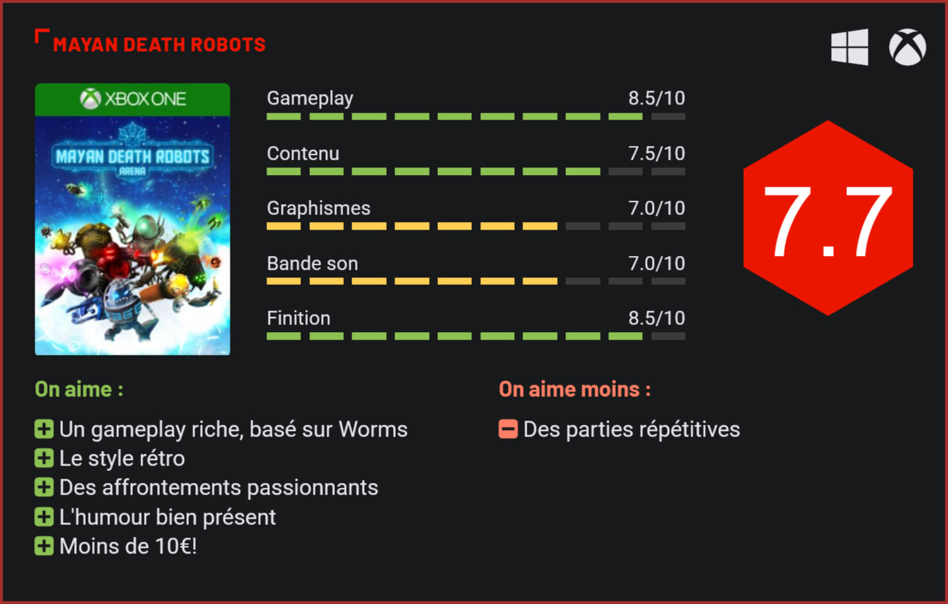 Imaginé par un petit studio de développement belge, Mayan Death Robots est LE jeu qu’il ne faut pas manquer en ce moment sur PC et Xbox One. Fondé en 2012 dans la commune d’Hoboken, Sileni Studios est un petit studio de développement indépendant qui a beaucoup fait parler de lui avec son jeu Mayan Death Robots sur PC en 2015, et qui nous livre aujourd’hui un portage en bonne et due forme sur Xbox One. Reprenant en grande partie le concept de Worms, Mayan Death Robots Arena est un jeu qui oppose deux robots dans des décors mayas en deux dimensions. A tour de rôle, les joueurs doivent décider des actions à opérer pour éliminer le noyau de leur ennemi en pilonnant les positions adverses ou en envoyant leurs sbires affronter leur opposant. Comme Worms, Mayan Death Robots Arena se joue au tour par tour. Le jeu est toutefois beaucoup plus nerveux que son modèle. Et il intègre surtout des dimensions supplémentaires puisque le joueur est capable de construire des remparts pour protéger son noyau et que la partie est régulièrement interrompue par des événements, comme l’arrivée d’un boss que les deux ennemis devront abattre en coopérant… Autre point intéressant : le joueur peut se déplacer par le biais de sauts. Lorsqu’il se déplace sur le territoire de son adversaire, les Mayas qui peuplent l’île l’attaquent, jusqu’à son élimination. La prise de risque est donc ici un facteur déterminant pour la victoire. Là où cela devient très intéressant, c’est justement dans le fait que chaque robot que l’on peut incarner sur le terrain dispose de ses propres aptitudes et pouvoirs. Le gameplay change donc du tout au tout d’un personnage à l’autre. Les cartes impliquent également une adaptation nécessaire au niveau de l’approche du terrain de jeu. Beaucoup plus tactique qu’il n’en a l’air, Mayan Death Robots Arena est un titre au concept unique et très rafraîchissant, à la fois nerveux, exigeant et défoulant, qui parvient à tirer son épingle du jeu grâce à un mode solo riche en défis et un mode multijoueur passionnant. Si le concept du jeu est par nature assez répétitif, Mayan Death Robots Arena surprend par sa richesse et l’excellence de son gameplay. Le titre de Sileni Studios tire également brillamment parti de son design délicieusement rétro et de sa bande sonore adorable. Au final, peu voire pas de défauts à pointer du doigt donc, pour ce titre indé absolument incontournable qui est vendu sur les différentes boutiques en ligne (Steam & Xbox Store) une poignée d’euros seulement. Conclusion Excellente surprise, Mayan Death Robots Arena est un jeu aussi tactique que défoulant qui reprend dans les grandes lignes le concept de Worms tout en introduisant de nouvelles mécaniques de jeu. Un titre indé délicieusement rétro, qui parvient à apporter une véritable bouffée d’air frais au genre. Si son contenu est assez léger, il compense ce petit défaut par un prix de vente très attractif. Le titre est en effet vendu sous la barre des 10€, quelle que soit la plate-forme.