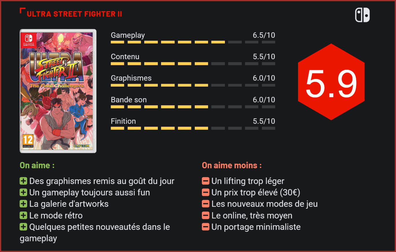 Sorti en 1991 en arcade, Street Fighter 2 est très vite devenu un grand classique des jeux de combat et a eu droit depuis sa sortie à de multiples portages. Capcom offre aujourd’hui un joli coup de lifting à ce titre culte en sortant une réédition du jeu sur la console nomade de Nintendo. Drôle d’idée que celle de Capcom de remettre au goût du jour un aussi vieux classique que Street Fighter 2, alors que la plupart des fans de la franchise auraient sans doute préféré goûter aux joies du dernier volet sur Switch. Pour les joueurs nostalgiques, livrer un remake d’Ultra Street Fighter 2 avait du sens, mais peut-être pas au prix fixé par Capcom. Car pour une trentaine d’euros, les joueurs s’attendaient à un remake en bonne et due forme. Hors, au final, Capcom ne nous livre qu’un très léger lifting du jeu, avec quelques modes inédits. Explications. Le studio Udon s’est en effet chargé de la refonte visuelle du jeu, avec des résultats très nuancés. Globalement, les décors en 2D ont très mal vieilli, et les liftings des personnages sont très moyens. Pour un titre aussi légendaire que Street Fighter, on aurait pu s’attendre à ce que Capcom sorte les gros moyens. Hors, si le jeu a bien subi un lifting, la qualité n’est pas tout à fait au rendez-vous et le titre fait pâle figure face aux autres grands classiques du jeu de combat 2D récemment modernisés. Point positif, il est possible de repasser au design 16 bits, ce qui réjouira les joueurs les plus nostalgiques. Si l’on met de côté la réalisation technique, les nouveautés restent également mineures. Au niveau du gameplay, on note l’apparition de déchoppes qui permettent de mieux équilibrer les combats et de se tirer de situations épineuses, quelques équilibrages au niveau de la palette de coups de chaque personnage et – surtout -, de nouveaux modes de jeu. Outre les modes Arcade et Versus, on citera ainsi la présence d’un mode Co-Op à deux – malheureusement pas très excitant – et le nouveau mode La Voie du Hado, qui permet de jouer dans la peau de Ryu à la première personne et se joue avec les Joy-Cons et le système de reconnaissance gestuelle de la Switch. Amusant cinq minutes, mais hyper-répétitif et là encore pas très excitant. Reste alors le mode multijoueur en ligne, qui aurait pu être un véritable argument de vente pour ce titre, mais qui se solde pas des attentes interminables de mise en relation et des combats souvent déséquilibrés. Si la présence d’un mode multijoueur était indispensable, on se rend finalement compte que celui-ci est lui aussi loin de répondre à nos attentes. Au final, peu de choses sont donc à sauver dans les nouveautés. Les joueurs nostalgiques se réjouiront toutefois de retrouver l’un des meilleurs jeux de baston en 2D, avec un joli coup de pinceau, un casting alléchant de 19 personnages, et un gameplay toujours aussi fun. Autre joli bonus : la présence de nombreux artworks dans la galerie du jeu. Mais tout cela justifie-t-il vraiment un prix de vente aussi élevé que celui auquel est vendu le jeu de Capcom? Sans doute pas, et c’est là tout le problème. Car à 5 ou 10€, nous vous aurions sans doute conseillé de foncer tête baissée sur ce grand classique du jeu-vidéo. Mais à 30€, difficile de justifier le passage à la caisse… Conclusion Si Street Fighter 2 reste un titre incontournable pour les amoureux de jeux de baston en 2D, ce remake sur Switch ne tient pas tout à fait ses promesses. Le mode multijoueur en ligne, qui aurait dû être un véritable argument de vente pour le jeu, est loin d’être aussi réussi qu’on l’imaginait, le portage est minimaliste et les quelques nouveautés n’apportent rien de très excitant. Au final, difficile de justifier le prix de 30€. Reste un jeu de combat toujours aussi fun à prendre en mains, et qui fera sans doute couler une larme de nostalgie aux trentenaires.