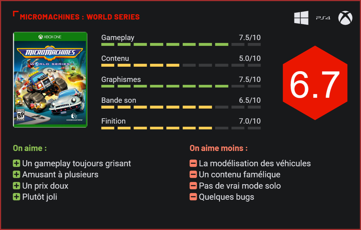 Depuis Micro Maniacs – qui était sorti à l’époque sur PS One -, les fans de la série Micro Machines n’ont plus touché à un épisode digne de ce nom. Autant dire que le nouveau volet de la franchise, baptisé World Series, était attendu au tournant. Mis au régime forcé depuis des années déjà, les fans de la franchise Micro Machines n’avaient plus eu droit à un épisode abouti depuis des années. L’éditeur de la franchise, Codemasters, a toutefois jugé qu’il était temps de redonner une chance à la franchise avec Micro Machines World Series, un nouvel épisode disponible depuis peu sur Xbox One, PS4 et PC, qui remet au goût du jour le concept décalé du premier opus. Méconnue des jeunes joueurs, la série des Micro Machines s’adresse pourtant à la base à un public très jeune puisqu’il est ici question de prendre les commandes des célèbres jouets miniatures et de les faire participer à des courses décalées dans des environnements regorgeant de pièges. Car dans Micro Machines, le joueur ne concourt pas sur des circuits mais dans des environnements inspirés du monde réel, tel qu’un jardin, une cuisine ou un salon, ou la moindre goutte de café, chips ou tâche d’huile peut devenir un véritable obstacle. En dehors des environnements, qui regorgent de tremplins et pièges mortels, le joueur devra également se méfier de ses adversaires qui utiliseront power-ups et décors pour l’éliminer. Exigeant, le titre nécessite beaucoup de dextérité et délivre une bonne dose de fun. Simple à prendre en mains, intuitif et très fun, le jeu de Codemasters remplit parfaitement son contrat sans toutefois briller. On regrettera ainsi une intelligence artificielle trop agressive, des collisions parfois très fantaisistes et quelques petits bugs qui viennent entraver notre progression. Le plus gros défaut du jeu reste toutefois son contenu trop limité. Les habitués de la série seront ainsi assez surpris de ne pas trouver de mode solo à proprement parler. Certes, il est possible de jouer seul contre l’I.A., mais il n’existe aucun mode carrière ni championnat. Dans le même ordre d’idée, on ne dénombre que 10 tracés et 12 véhicules… Inutile donc de préciser que vous aurez très vite fait le tour du jeu. Au niveau des modes de jeu, on retrouve heureusement suffisamment de diversité pour nous tenir scotché au pad durant plusieurs heures. Outre les courses classiques, on retrouve ainsi un mode Arène dans lequel les joueurs devront éliminer leurs adversaires en utilisant les différents power-ups mis à leur disposition, et un mode Elimination très fun dans lequel les joueurs trop lents qui ne sont pas capables de suivre leurs adversaires seront éliminés aussitôt que leur véhicule disparaîtra de l’écran. Un concept amusant, qui prend bien sûr tout son sens en multijoueur. Que ce soit sur un seul écran ou en ligne, World Series se révélera être un excellent divertissement pour une soirée entre amis. Notons toutefois qu’en ligne, les serveurs ne sont pour l’instant pas très chargés et le matchmaking pas franchement époustouflant. Du côté de la réalisation technique, le jeu de Codemasters s’en sort en revanche plutôt bien avec des environnements très réussis et qui regorgent de détails. Les effets visuels sont superbes, les animations abouties et le frame-rate consistant. Notre seul reproche concerne le style graphique très particulier – pour ne pas dire hideux – des véhicules, qui s’intègrent très mal dans les décors du jeu. Un constat globalement assez positif, surtout pour un titre à petit prix (vendu entre 25 et 35€ sur Internet), et qui pourrait surtout évoluer au fil des mises à jour. Conclusion S’il manque encore de contenu et est loin d’être parfaitement abouti, ce nouvel épisode de la série des Micro Machines ne fait pas honte à sa dynastie. Fun, totalement délirant et très amusant à plusieurs, le jeu de Codemasters est un excellent défouloir, qui a en outre le mérite d’être proposé à un tarif très compétitif et fera sans doute revivre d’excellents moments aux fans de la série. Certes, il y avait sans doute moyen de faire beaucoup mieux, mais pour un titre à petit budget, le jeu de Codemasters ne s’en sort finalement pas aussi mal…