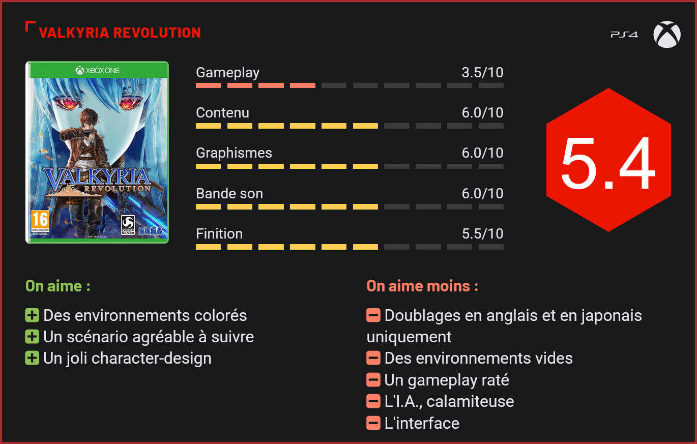 Acclamée par les critiques, la série des Valkyria Chronicles n’avait plus connu de nouvel épisode depuis la sortie de la compilation des premiers volets sur PS4 et PC. Mise de côté depuis plusieurs années, la franchise nous revient aujourd’hui avec un spin-off – malheureusement raté. La série de RPG tactiques de SEGA n’avait plus eu droit à une nouvelle entrée depuis plusieurs années. Etonnamment, l’éditeur avait toutefois annoncé un spin-off sur PC, PS4 et Xbox One, le bien nommé Valkyria Revolution. Reprenant en partie l’univers de la franchise et le style graphique des précédents jeux, Valkyria Revolution se différencie des autres épisodes de la série au niveau de son style de jeu, qui le rapproche davantage d’un jeu d’action que d’un tactical RPG. Exit les combats au tour par tour donc, puisque l’intégralité des affrontements se feront ici en temps réel. Exit également le contexte de la Seconde guerre mondiale puisque Valkyria Revolution expose une période très différente de l’Histoire et plonge le joueur en pleine révolution industrielle. Si le cadre très différent de cet épisode sied plutôt bien à la franchise, difficile de ne pas être déçu par la prise en main de cet épisode, qui s’écarte des origines de la série et se rapproche d’un beat them all standard. Car si le jeu intègre toujours plusieurs éléments tactiques et permet toujours d’affronter ses adversaires à distance en utilisant différentes armes à feu, il est généralement beaucoup plus facile de foncer dans le tas et de massacrer ses ennemis à l’arme blanche. Du coup, tout un pan du jeu perd tout son intérêt, et l’aspect tactique passe complètement au second plan. C’est d’autant plus regrettable que le jeu intégrait quelques bonnes idées avec un système de couverture, de perte de moral et d’items hérité des premiers Valkyria Chronicles. Se transformant en un vulgaire beat them all, le jeu de SEGA perd tout son charme mais également tout son dynamisme. Les affrontements sont mous et sans aucun enjeu, l’intelligence artificielle des adversaires est désastreuse et les combats de groupes deviennent très vite très brouillons. Pour peu, on en oublierait presque la possibilité de passer d’un personnage à l’autre de l’escouade pour se concentrer uniquement sur le massacre des forces adverses. Plus surprenant encore, les affrontements avec les boss sont eux aussi sans aucun enjeu. Plus effrayant, le rythme déjà très mou des affrontements est encore plus ralenti par le système de menu qui force le joueur à mettre le jeu en pause pour changer d’arme ou utiliser un sort. Les séquences d’action n’en sont que plus molles, et deviennent très vite totalement dépourvues d’intérêt. Reste alors un système d’arbre de compétence intéressant, qui permettra d’améliorer ses personnages au cours de l’aventure, et un scénario assez agréable à suivre, soutenu par de nombreuses cinématiques qui ont elles aussi la fâcheuse tendance à être un peu trop longues et indirectement soporifiques… Par chance, le titre peut toujours compter sur son style graphique unique, qui rappelle les meilleurs films d’animation nippons. Les environnement sont colorés et plutôt réussis mais globalement assez vides. Les personnages sont en revanche pratiquement tous aussi réussis que dans les précédents opus de la franchise. On regrettera en revanche le manque de vie qui se dégage du jeu et le relatif manque de diversité au niveau des décors, qui affecte forcément d’une certaine manière l’enthousiasme du joueur pour un jeu qui n’a décidément pas beaucoup d’atouts à faire valoir… Enfin, dernier point important à relever : si la bande sonore s’en sort correctement, le jeu n’est malheureusement pas traduit en français. Les joueurs devront opter au choix pour des doublages en anglais ou en japonais. Conclusion A des années lumières des précédents épisodes de la franchise, Valkyria Revolution est une jolie déception pour les fans de Valkyria Chronicles. Le titre a perdu tout son aspect tactique et s’est transformé en un beat them all mou et stupide, qui n’a plus que son joli character design et son scénario sympathique à mettre en avant. S’il n’est pas totalement dénué d’intérêt pour les fans, cet épisode pourrait bien sonner le glas d’une série qui avait pourtant un énorme potentiel…