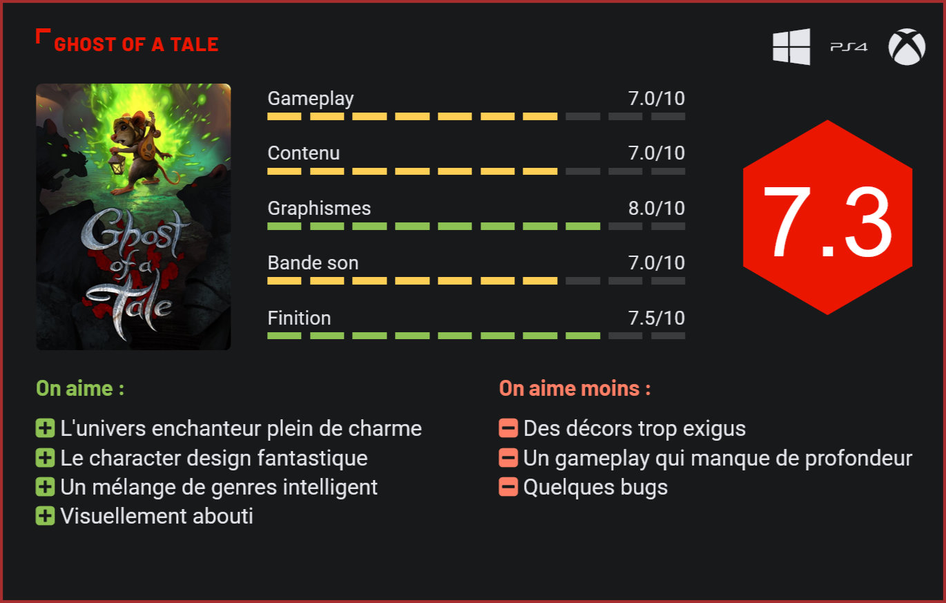 Disponible depuis quelques jours en Early Access sur Xbox One, Ghost of a Tale fait partie de ces titres sortant des sentiers battus qui pourraient bien séduire les joueurs blasés par les jeux à gros budget… Fruit du travail de presqu’un seul homme, Lionel Gallat, un vétéran de l’industrie connu pour son travail sur des films d’animation comme Gang de requins ou Moi, moche et méchant, Ghost of a Tale est un jeu d’aventure qui plonge le joueur dans un univers médiéval-fantastique décidément bien mystérieux. Ici, pas de mage ni de guerrier puisque le joueur incarne une petite souris répondant au nom de Tilo, qui devra s’échapper d’une prison pour tenter de retrouver sa tendre moitié. Malheureusement, notre pauvre souris-ménestrel n’a pas l’allure d’un héros. Elle devra dès lors faire preuve de ruse pour éviter les patrouilles de rats qui rôdent et progresser dans l’aventure. A la croisée des genres, le jeu de Lionel Gallat reprend des éléments propres aux jeux de rôle avec la collecte d’objets, les menus regorgeant d’items à employer, et de jeux d’infiltration avec ses séquences de cache-cache et d’exploration à petits pas. Si le titre s’appuie sur des mécanismes ancestraux – en l’occurrence, la recherche de clés, permettant de déverrouiller une porte et de progresser dans l’aventure -, Ghost of a Tale rappelle à plus d’un titre les meilleures productions de studios comme Rare. Lionel Gallat nous livre en effet bien plus qu’un simple jeu d’aventure. Le développeur est en effet parvenu à donner une véritable âme à son jeu. Visuellement, malgré ses petits défauts de jeunesse (le titre est toujours en développement), Ghost of a Tale est déjà un véritable délice. Certes, quelques bugs peuvent venir entraver la progression, et les détails – vu de très près – restent très sommaires. Mais la direction artistique est tout simplement bluffante et le design des différentes créatures rencontrées dans l’aventure à couper le souffle. Si la bande sonore passe au second plan, le titre intègre quelques très jolis morceaux qui immergeront parfaitement le joueur dans l’intrigue. Les bruitages restent toutefois au second plan (pour le moment). S’il reste encore beaucoup de choses à améliorer d’ici la sortie, les développeurs de Ghost of a Tale sont déjà parvenus à donner une âme à leur jeu et à créer un concept innovant qui fonctionne déjà très bien dans la pratique. Le principal reproche que l’on pourrait faire au jeu concerne son gameplay. En effet, la plupart des séquences de jeu se déroulent dans des environnements pour le moins exigus, qui ne laissent que peu de marge de mouvement au joueur. Très dirigiste, le jeu est également trop simple. Les séquences d’infiltration sont souvent réduites à des phases de cache-cache. Si l’atmosphère, l’univers et le design du jeu sont peaufinés à l’extrême, le titre manque encore de profondeur. Toutefois, les prochaines mises à jour du jeu pourraient rectifier ces quelques défauts et transformer Ghost of a Tale en un titre absolument incontournable. Conclusion Ghost of a Tale fait partie de ces titres sortant des sentiers battus qui parviennent à nous émouvoir dès la première heure de jeu. Original à plus d’un titre, le jeu d’aventure immerge le joueur dans un univers enchanteur peuplé de créatures extraordinaires. Mélange de genres, Ghost of a Tale lorgne allègrement du côté du jeu d’infiltration et introduit quelques très bonnes idées. Malheureusement, le gameplay n’est pas encore tout à fait au point et les environnements nous ont paru très (trop?) exigus. Plein de charme, le titre manque toutefois un peu de profondeur et ne parvient pas tout à fait à convaincre au niveau de son gameplay, qui manque de ce petit quelque chose qui en ferait un titre magique.