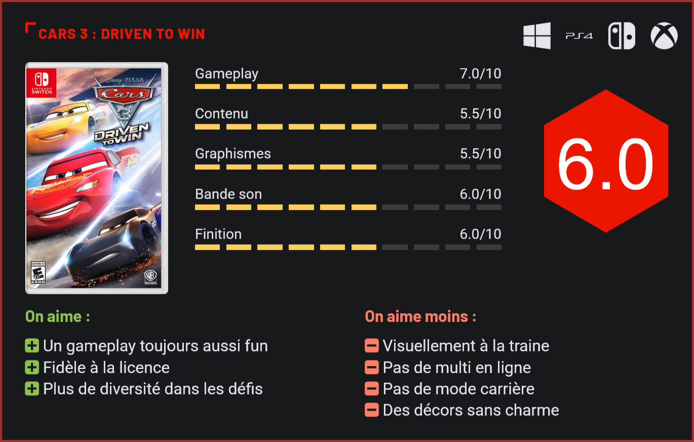 Surfant sur le succès des longs-métrages de Disney, Avalanche Studios nous livre une adaptation en bonne et due forme de Cars 3 sur Xbox One, PS4 et Switch. Développé par Avalanche Studios, le studio de développement à l’origine notamment de l’excellent Just Cause, mais aussi de l’adaptation plutôt réussie de Mad Max en jeu vidéo, Cars 3 se veut une adaptation assez paresseuse du nouveau film d’animation de Disney. Paresseuse parce que le studio de développement ne suit pas forcément la trame scénaristique du film, et ne tente pas non plus de développer un univers ou un style de jeu unique, comme le premier Cars l’avait fait. Ici, pas d’open-world, ni même de mode carrière. Dès le début de l’aventure, le joueur est catapulté à travers une série de défis sans queue ni tête qui le feront concourir face à toute une série d’adversaires dans des décors inspirés des trois premiers films. Le véritable choc vient du fait que le jeu ne propose pas de véritable mode solo à proprement parler mais une simple succession de défis, entrecoupés de longs temps de chargement. Exit l’open-world de Cars 1, et les championnats de Cars 2 donc, et place à un étrange système de défis à compléter à travers une succession de courses et challenges qui vous feront à tour de rôle affronter des adversaires sur un circuit avec différentes armes récupérées sous la forme de power-ups (façon Mariokart), concourir dans des courses plus classiques, tenter de battre les meilleurs chronos, réaliser des cascades pour emmagasiner le plus grand nombre possible de points, participer à des compétitions de stock-cars, et explorer certaines zones de jeu un peu plus vastes pour récupérer différents bonus. Si la variété est donc bien au rendez-vous au niveau des défis, l’absence d’un véritable mode carrière se fait ressentir dès les premières minutes de jeu. Certes, les défis sont amusants, et les nouveautés sont bien au programme, mais l’absence de colonne vertébrale enlève un certain intérêt au jeu. La bonne nouvelle, c’est que cette nouvelle orientation permet à Cars 3 de venir surfer sur les mêmes rivages qu’un Mariokart avec des compétitions acharnées seul ou jusqu’à quatre joueurs sur une seule console, qui rythmeront vos soirées entre amis. Bien que très arcade, le gameplay du titre reste toujours aussi fun et fait la part belle aux dérapages et figures. Pour accumuler du boost, le joueur devra en effet enchainer les figures aériennes, dérapages et glissades sur deux roues. Les nombreux power-ups disséminés sur les parcours rendent également les parties très imprévisibles – et donc forcément très amusantes. Au niveau du level-design, rien de bien folichon. Les décors sont sobres mais efficaces, et regorgent de raccourcis à exploiter. Plus facile à prendre en mains qu’un Mariokart, Cars 3 est un jeu qui se destine très clairement à un très jeune public. Les plus jeunes seront sans doute ravis de retrouver Flash McQueen au casting, ainsi qu’une quinzaine d’autres personnages emblématiques de la série. Si les voix officielles ne sont pas au programme, la réalisation globale reste très bonne. D’un point de vue purement visuel, le jeu ne tient en revanche pas toutes ses promesses. Certes, il reste assez fidèle à la franchise de Disney, et les personnages du jeu sont globalement très bien modélisés, mais les décors du jeu manquent de personnalité et surtout les décors manquent cruellement de détails. On pourrait facilement croire que le jeu est sorti il y a un bon moment déjà… L’un dans l’autre, rien de catastrophique, mais on aurait clairement apprécié que le titre bénéficie d’un peu plus d’attention à ce niveau. Autre point sombre à relever : si un mode multijoueur est au programme, Avalanche Studios n’a pas jugé bon d’intégrer un mode multijoueur en ligne. Inutile de préciser que l’intérêt du titre en prend un sacré coup si vous n’avez plus l’habitude de jouer hors-ligne avec vos amis… Conclusion Clone plutôt réussi de Mariokart, Cars 3 est un jeu de course très amusant qui reste également fidèle à la franchise de Disney. Accessible, le jeu tire tout son intérêt de la diversité de ses défis et notamment des fameux power-ups qui viendront rythmer les parties en multijoueur. Visuellement, le titre reste toutefois à la traine. Il ne propose également ni mode multijoueur en ligne, ni réel mode carrière, ce qui est tout de même regrettable lorsque l’on sait qu’il s’agissait précisément du plus gros atout de son ainé…