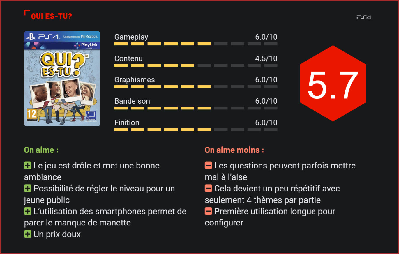 Conçu pour être joué à plusieurs, Qui es-tu ? se veut un jeu de société d’un nouveau genre qui tente de mêler dessins, selfies et usage du smartphone pour remettre au goût du jour un concept vieux comme le monde. Premier jeu d’une longue série, Qui es-tu? est un jeu de société de nouvelle génération qui propose de se divertir entre amis autour d’une partie de questions-réponses cocasses. D’autres titres du genre apparaitront au courant de l’automne, avec notamment une refonte du jeu de karaoké SingStar. La grande particulière de ces jeux PlayLink est qu’ils peuvent être joués à partir d’un smartphone. Le manque de manette n’est plus un souci, il suffit de télécharger une application pour pouvoir rejoindre la partie. Un concept très moderne et finalement très amusant. Le but de Qui es-tu ? est donc de répondre à des questions et de deviner lequel de nos amis ou membre de notre famille correspond le mieux au thème. Au-delà des 1000 questions, Qui es-tu ? intègre également des séquences de dessin et de selfies afin de laisser aller la créativité de chacun. Une bonne idée sur le papier, mais qui se révèle toutefois mal fignolée. La nouvelle ère des jeux de question-réponse En tant que jeu de société 2.0, Qui es-tu ? ne développe pas vraiment d’histoire. Divisée en 4 thématiques, le jeu nous prendre par la main par le biais d’une voix, qui nous guide tout le long de la partie. L’intérêt du jeu ne vient pas vraiment de ce qui se passe à l’écran, mais bien des interactions entre les joueurs. Bien qu’il soit possible de jouer en ligne, le charme du jeu fonctionne davantage lorsque les joueurs sont dans la même pièce. A travers chaque défi, le joueur devra préciser lequel de ses amis correspond le mieux à la proposition affichée à l’écran, en faisant attention au chronomètre. Il est possible de surenchérir les réponses avec des jokers pour gagner plus de points. Qui es-tu ? repose essentiellement sur l’alchimie entre les joueurs. Jouer depuis son smartphone La prise en mains est très clairement le gros atout de Qui es-tu ? En effet, le concept reprend les bases des jeux de société de questions-réponses traditionnels, mais intègre également des éléments plus modernes avec des coloriages, des selfies et des interactions sur téléphone. Le fait que le jeu se base sur l’utilisation de smartphone pour interagir est vraiment un plus. Plus besoin de se soucier du nombre insuffisant de manettes, l’application est gratuite, et la seule nécessité ici est d’avoir emmené avec soi son smartphone. Des cas de figures différents Il est important et intéressant de souligner que le jeu peut être paramétré de manière à adapter les questions à un jeune public. Néanmoins, notons tout de même qu’à le titre ne propose que 1000 questions différentes, ce qui reste relativement peu par rapport à d’autres jeux du même genre. On a malheureusement trop vite l’impression d’avoir fait le tour du jeu. Dans le même ordre d’idée, le jeu est très répétitif et ne surprend pas beaucoup les joueurs. Les thématiques sont parfois assez étranges et peuvent facilement mettre mal à l’aise. Mention spéciale pour le thème de l’apocalypse ou le retour sur les ruptures difficiles des joueurs. Mieux vaut donc éviter d’y jouer avec votre ex, ou des personnes trop sensibles. Conclusion PlayLink tente une remise à neuf des emblématiques jeux de société en proposant aux joueurs de participer aux défis à l’aide de leurs smartphones. Une bonne idée sur le papier, mais qui l’est moins en pratique. La sollicitation des téléphones est un très bon moyen de parer au souci du manque de manettes, mais n’apporte rien de vraiment intéressant aux parties. Les séquences de jeu sont assez courtes et les choix des thèmes sont parfois étranges. Malgré ses petits défauts, Qui es-tu ? mettra tout de même une bonne ambiance lors des soirées entre amis.