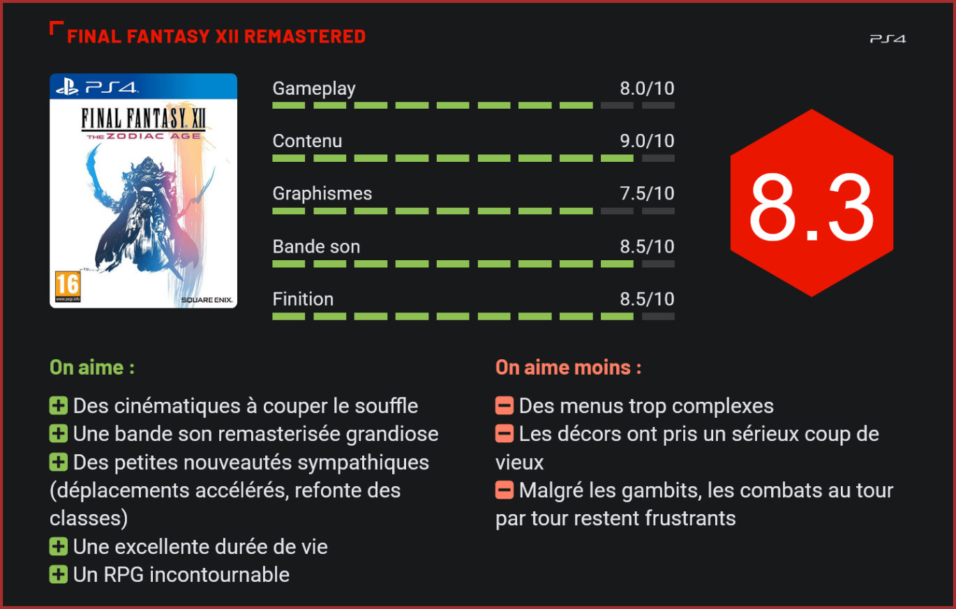 Sorti en 2007 sur PS2, le douzième titre de la saga Final Fantasy réapparait sur Playstation 4 dans une version remasterisée. A l’époque déjà, le jeu avait fait couler beaucoup d’encre. Sa réédition pourrait toutefois séduire plus d’un joueur de par les nombreuses nouveautés qu’elle introduit… Dix ans après sa sortie initiale, Final Fantasy XII revient sous la forme d’une réédition du jeu introduisant plusieurs nouveautés et bénéficiant de jolies retouches sur le plan visuel. Et ce qui est sûr, c’est que l’éditeur a mis les petits plats dans les grands. Les choses n’ont pas été faites à moitié, puisqu’il ne s’agit pas ici d’un simple portage sur PS4, mais bien d’une version entièrement remasterisée du jeu. C’est évidemment au niveau visuel que le plus gros du travail a été fait. Les visuels sont beaucoup plus lisses et tirent désormais parti des performances de la PlayStation 4. Si le jeu a plutôt mal vieilli, ses cinématiques n’ont pas pris une ride, et on se replonge finalement assez facilement dans l’aventure palpitante de ce volet. Autre point important concernant ce remaster : la bande originale du jeu a été entièrement revue et intègre une version réorchestrée de tous les morceaux, de meilleure qualité et de plus grande intensité. Le résultat est tout bonnement bluffant. Rien que dans la forme, on peut voir que cette réédition n’est pas un simple transfert du jeu originel sur PS4. Elle a demandé beaucoup de temps et un travail minutieux. Nous avions, par ailleurs, déjà pu nous faire une idée du savoir-faire des équipes de Square Enix lors de la réédition de Final Fantasy X et X-II, en 2014 sur PS3 et PS Vita et en 2015, sur PS4, douze ans après sa première apparition (2002). Une mise à jour visuelle réussie Déjà en 2006, le jeu se montrait très innovant sur le plan visuel en poussant dans ses derniers retranchements la PlayStation 2. Le remaster effectué par l’équipe de Square Enix est une remise au goût du jour du travail opéré à l’époque. Si le moteur graphique reste le même, les développeurs ont entièrement retouchés les visuels. Les personnages et les décors gagnent en textures et en détails, mais également en profondeur. Ils ne semblent plus collés aux décors, mais prennent en relief et en masse. Les couleurs sont toujours aussi présentes, mais moins criardes que par le passé. Globalement, le jeu est également plus fluide, et le rendu global des cinématiques plus réussi. Un scénario passionnant Le monde fantastique d’Ivalice est divisé entre deux empires voisins qui tentent depuis des années d’avoir la domination sur l’autre. Des affrontements terribles qui menacent le quotidien des petites gens. A côté des soldats expérimentés, certains rebelles vont vouloir prendre part au combat à leur niveau. C’est évidemment leurs aventures à eux que nous suivrons, avec à leur tête un adolescent orphelin de 17 ans et, bien sûr, on retrouve la présence d’une jeune princesse, Ashe. Le duo très caractéristique de la saga Final Fantasy. Au-delà de la trame principale, chaque personnage a évidemment sa propre histoire et le jeu propose d’en apprendre davantage sur chacun d’eux à travers des moments de vies. Très riche, le scénario du jeu est surtout admirablement mis en avant par des cinématiques superbes et une ambiance visuelle qui rappelle les meilleurs épisodes de la saga Star Wars. Des tableaux de compétences plus lisibles Dans la première version du jeu, sortie en 2006 au Japon et en 2007 en Europe, les personnages pouvaient se spécialiser dans n’importe quelle classe, mêlant magie blanche et noire, compétences de combat et d’armes à feu. De vrais demi-dieux. Cela a été changé lors dans la seconde version du jeu – Final Fantasy XII : International Zodiac Jobs System -, en 2007 avec l’ajout de « jobs », des catégories de compétences, qui – ironiquement – n’est sorti qu’au Japon. Dans cette réédition du jeu, Square-Enix a de nouveau entièrement repensé le système en incluant des tableaux de compétences divisés en 12 classes, représentant les signes du zodiaque. Les personnages peuvent être spécialisés dans deux classes sur un total de douze. La version 2017 a tout de même subi quelques améliorations à ce niveau, rendant les grilles plus lisibles et plus intuitives. Attention qu’une fois choisie, on ne peut plus la modifier. Il s’agit d’une une manière pour le joueur de personnaliser un peu plus son équipe, même si certains personnages se dirigent naturellement vers l’une ou l’autre classe. Des aspects des combats automatisés Si les affrontements au tour par tour ont toujours été la grande spécialisé de la série, la particularité de cet épisode était déjà en 2007 de permettre au joueur de voir apparaître les ennemis à distance – les ennemis sont visibles et attaquables sans transition. Un aspect qui permet à la fois de s’orienter plus facilement pour prendre de l’expérience, mais aussi de les éviter pour progresser plus vite dans l’aventure. Si le système de combat au tour par tour reste donc très classique, FFXII initiait une approche du champ de bataille relativement inédite et plutôt innovante pour l’époque. On retrouve également le concept des « gambits », un système d’automatisation d’attaques et de soins qu’on peut imposer à ses personnages suivant les situations. Par exemple, on peut décider que tous les co-équipiers attaquent le même monstre que le leader ou que le soignant soigne automatiquement le chef si ses points de vie diminuent jusqu’à un niveau défini. Un automatisation qui est la bienvenue dans un titre déjà assez coriace, et qui simplifie grandement la vie du joueur… Nouveaux modes de jeu et autres améliorations Final Fantasy XII – The Zodiac Age intègre également de nouveaux modes de jeu, ce qui lui permet de ra
