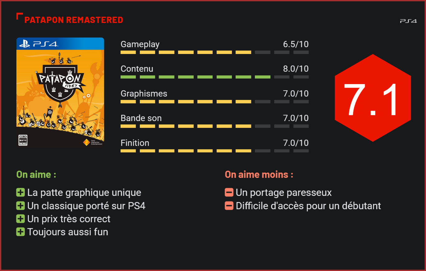 Titre culte sur PSP, Patapon a aujourd’hui droit à un portage en bonne et due forme sur PlayStation 4. L’occasion de se replonger dans l’univers farfelu de ce jeu complètement à part… Gros succès critique sur PSP, Patapon n’a malheureusement pas connu un énorme succès commercial. Considéré comme un jeu culte, le titre de Sony a néanmoins droit aujourd’hui au passage par la case remaster sur PlayStation 4. Sony Interactive nous livre en effet en cette période estivale une réédition du premier volet à la sauce Full HD (et même 4K sur PS4 Pro). Un portage paresseux Les rééditions de jeu sont à la mode, et plus encore sur PlayStation 4 que sur n’importe quelle autre console. Au cours des dernières semaines, nous avons vu atterrir un nombre incalculable de remasters, de l’excellent Final Fantasy XII – qui introduisait quelques jolies nouveautés tant au niveau des modes de jeu que du gameplay -, au fantastique Crash Bandicoot – qui offrait un joli coup de lifting à la franchise d’Activision. Depuis quelques mois déjà, les éditeurs raclent leurs fonds de tiroir, et enchaînent les compilations à un rythme surprenant. Surfant sur la vague, Sony nous livre avec Patapon Remastered un portage malheureusement assez paresseux d’un titre devenu culte sur PSP… Car si le jeu n’a rien perdu de son charme, il faut bien reconnaître que ce remaster déçoit. D’une part parce qu’au niveau du contenu, Sony s’est contenté de porter le premier volet de la série – et ne nous livre donc pas une compilation en bonne et due forme réunissant les trois premiers volets mais une simple réédition du premier volet. D’autre part, parce que le jeu n’a bénéficié d’aucune retouche majeure sur le plan visuel. Il s’agit purement et simplement d’un portage du titre sorti sur PSP, à la sauce Full HD. Un classique Si le portage déçoit, le jeu n’en reste pas moins excellent. Les joueurs qui apprécient les titres sortant des sentiers battus en auront donc largement pour leur argent. Visuellement tout d’abord, puisque Patapon parvient à créer son propre univers graphique, avec des décors superbes, qu’on croirait sortis d’un livre de croquis, et un character design majestueux, inspiré des meilleurs films d’animation. Et puis, bien sûr, au niveau de son gameplay – unique en son genre, qui mélange stratégie et rythme. Car le concept de Patapon ne ressemble à nul autre. Le jeu propose au joueur de prendre les commandes d’une armée de petites créatures – qu’il faudra faire progresser sur un champ de bataille en faisant sonner les tambours de guerre. Concrètement, le joueur devra enchainer les combinaisons de touches pour donner des ordres à ses unités. Si les mécaniques de jeu restent assez simples – le joueur se contentera de dire à ses troupes d’avancer, d’attaquer, de se replier et d’utiliser de la magie -, le cocktail fonctionne plutôt bien et les combats se révèlent bien plus épiques que d’apparence! On notera d’ailleurs que pour progresser, le joueur devra tirer parti de son environnement et ne pas hésiter à enrôler de nouvelles troupes dans son périple. Bien entendu, la musique joue un rôle central dans le jeu et l’excellente bande sonore du jeu mérite à elle seule le détour. Si la répétitivité des morceaux – Patapatapatapon! – obligera les joueurs à ne progresser dans l’aventure que par courtes sessions, ce voyage initiatique dans l’univers de Patapon ne laissera aucun joueur indifférent. Le jeu n’a pas gagné son statut de titre culte sans raison! Très accessible, le jeu nécessitera toutefois un peu de rigueur au début de l’aventure, pour bien saisir le concept si particulier de Patapon… On appréciera en revanche la difficulté progressive qui poussera le joueur à boucler l’aventure assez rapidement. Au niveau de la durée de vie, il faudra compter entre 3 et 5 heures pour boucler le jeu. Ce qui n’est pas si mal. Surtout compte tenu du prix de ce remaster, qui est vendu sur le PlayStation Store au tarif de 14,99€. Alors certes, il est regrettable que Sony ne nous livre pas une compilation réunissant les trois premiers volets de la série – et oui, ce portage de Patapon est assez paresseux – mais il s’agit finalement d’une belle occasion de (re)découvrir un jeu culte sur sa PlayStation 4, à un tarif qui nous semble somme tout très correct. Conclusion Patapon fait partie de ces titres cultes qui ont bercé la jeunesse de milliers de joueurs. Si son partage sur PS4 est plutôt paresseux, et le jeu a plutôt mal vieilli, il n’en demeure pas moins un titre incontournable à (re)découvrir pour sa superbe bande sonore, son gameplay unique et sa patte graphique absolument superbe. Une expérience sonore et visuelle de courte durée, mais sur laquelle on reviendra volontiers.