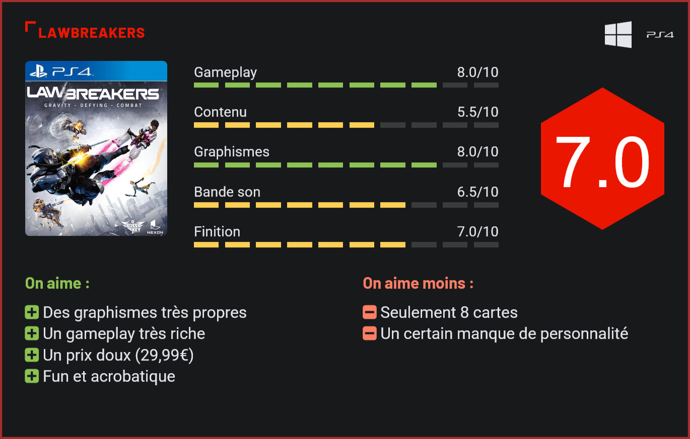 Sorti de l’esprit de Cliff Bleszinski – le game-designer de Gears of War -, Lawbreakers faisait partie des jeux les plus attendus cet été. Ambitieux, le FPS de Boss Key Productions pourrait bien entrer au panthéon des titres multijoueurs les plus séduisants du moment. Signant le retour triomphal de Cliff Bleszinski, Lawbreakers est un FPS multijoueur qui plonge le joueur dans des combats frénétiques. Lorgnant tantôt du côté d’Unreal Tournament, tantôt du côté d’Overwatch, le titre de Boss Key Productions joue la carte de l’originalité avec un gameplay acrobatique qui propose au joueur de virevolter dans les airs et d’utiliser toute une série de capacités spéciales pour affronter les adversaires. Très orienté e-gaming, le jeu tire sa richesse de la diversité des 9 classes de personnages mises à disposition du joueur. Celui-ci peut choisir de foncer dans le tas, armé d’une lourde mitrailleuse, de passer inaperçu pour se faufiler dans le dos de son adversaire et l’assassiner de la manière la plus fourbe qui soit, ou utiliser des classes permettant de se rapprocher très vite de son adversaire pour engager un combat au corps à corps. Vous l’aurez compris, maîtriser chacune de ces classes demandera du temps, d’autant plus que chacune d’elle dispose de bien plus que d’une seule capacité unique. Chaque classe se joue réellement différemment, et pour mener à bien les missions, il faudra apprendre à jouer en équipe et à être complémentaire, pour éviter une trop grosse raclée… Contrairement à un Overwatch, le succès des missions repose toutefois régulièrement sur les exploits personnels. Une caractéristique du jeu que l’on doit en grande partie aux capacités acrobatiques des personnages. Car c’est bien ça qui différencie le plus Lawbreakers des dizaines d’autres FPS multijoueur que l’on trouve sur le marché. Le jeu de Boss Key Productions propose littéralement de défier la gravité et de s’envoler virevolter dans les airs. Extrêmement nerveux, le jeu prend rapidement des allures de ballets aériens et fait la part belle aux combats rapprochés. On notera d’ailleurs que le designer de Gears of War n’a pas hésité à jouer avec le level-design de Lawbreakers pour proposer des affrontements très techniques qui ont tendance à se dérouler sur plusieurs niveaux simultanément. Il n’est pas rare ainsi que des échauffourées éclatent dans les airs, sur une plate-forme et dans un souterrain simultanément. Très vertical, le gameplay de Lawbreakers force le joueur à rester très mobile. Inutile de préciser que le camping est ici puni d’une mort rapide… Extrêmement fun, le jeu est également très technique. Maîtriser une classe de personnage prendra plusieurs heures. Dès lors, inutile de préciser que vous en aurez largement pour votre argent, malgré le maigre nombre de cartes à disposition (seulement 8!) On s’en rend compte dès les premières minutes de jeu, Lawbreakers est un titre qui a été conçu pour les mordus de FPS, qui découvriront un titre particulièrement savoureux, et qui nécessitera plusieurs heures avant d’être parfaitement dompté. Si certains regretteront l’absence d’un mode solo, le maigre nombre de cartes et leur manque relatif de diversité (modernisme, bonjour!), difficile de ne pas être séduit par le gameplay très nerveux du titre de Boss Key Productions et ne pas lui trouver de jolis atouts. On notera d’ailleurs que si le titre est uniquement axé multijoueur, il propose tout de même cinq modes de jeu différents : deux modes de capture de zones, deux modes d’escorte et un mode de jeu plus sportif, le fameux mode Blitzball, qui passionne déjà les joueurs. Et pour cause puisque dans ce mode de jeu il faudra attraper une balle, placée au milieu du terrain de jeu et l’amener jusque dans le camp adverse pour marquer un point. La première équipe à marquer 8 points remporte la partie. Simple mais captivant, ce mode de jeu rappelle d’une certaine manière un Deathrow, en plus complexe et plus nerveux. Bref, vous l’aurez compris, si le jeu manque de contenu – principalement au niveau des cartes -, il délivre une bonne dose de fun et parvient à diversifier les plaisirs à travers cinq modes de jeu très funs, axés sur le jeu en équipe. Il sera dès lors intéressant de voir de quelle manière le jeu évoluera au cours des prochains mois, et à quel rythme le studio de développement délivrera de nouvelles cartes et modes de jeu. Pour l’heure, le résultat est plutôt impressionnant pour un tout petit studio de développement et surtout pour un jeu à tout petit budget. Que ce soit sur PC ou PS4, le jeu ne vous coûtera en effet que 29,99€. Par ailleurs, on notera que du point de vue de la réalisation, le titre frappe très fort, avec une bande sonore électrique et des graphismes visuellement très beaux, qui ne sont d’ailleurs pas sans rappeler un Unreal Tournament au niveau de la patte graphique. Certes, on a déjà vu plus joli, mais pour un jeu à tout petit budget, Lawbreakers réalise de belles prouesses… Alors oui, on pourra lui reprocher ses airs d’Overwatch, quelques similarités au niveau des classes et un manque global d’originalité au niveau du design des cartes et du concept du jeu, mais le gameplay très dynamique de Lawbreakers lui permet d’affirmer sa propre identité. Lawbreakers ne plaira d’ailleurs probablement pas aux fans d’Overwatch. Il est de ce fait plus nerveux, sanguin et mature que son principal modèle. Et c’est sans aucun doute ce qui fait toute sa richesse. Conclusion S’il manque encore de contenu, Lawbreakers n’en reste pas moins un excellent FPS multijoueur, qui se rapproche finalement davantage d’un Unreal Tournament au niveau de son gameplay que d’un Overtwatch. Fun et nerveux, le jeu de Boss Key Productions est un titre qui se laisse déguster sur la durée. Son gameplay très riche 