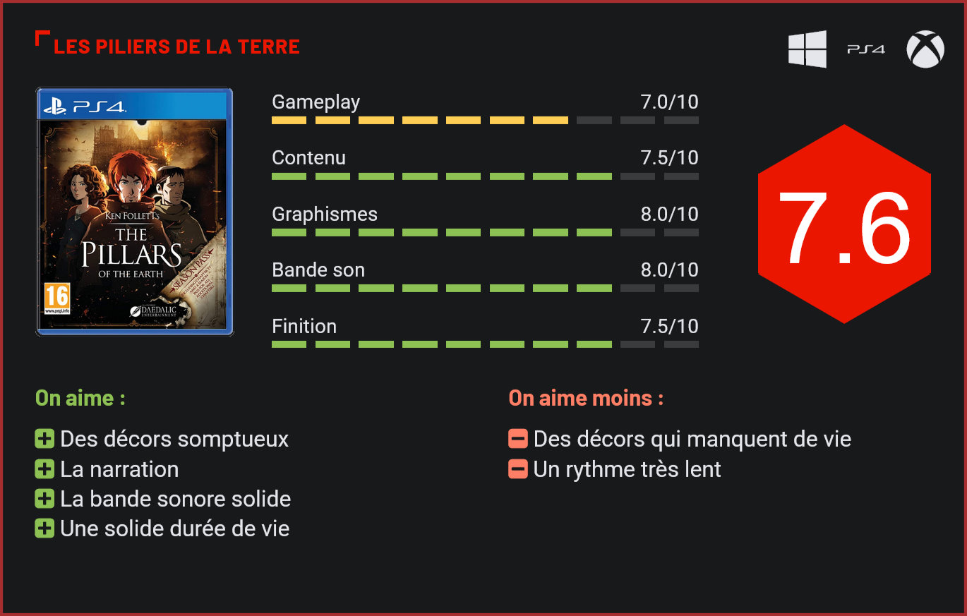 Déjà porté sur le petit écran en série télévisée, l’œuvre de Ken Follet a aujourd’hui droit à une adaptation vidéoludique, orchestrée par le studio Daedelic Entertainment. Découpée en plusieurs épisodes, qui retraceront l’ensemble de l’œuvre de Ken Follet, Les Piliers de la Terre : le jeu vidéo, ose une approche narrative innovante en misant sur le storytelling et la mise en scène. Daedelic Entertainment a choisi d’adapter l’œuvre de Follet sous la forme d’un point & click old-school. Une approche qui permet à l’éditeur de rester très fidèle à l’œuvre de l’auteur tout en osant une approche différente au niveau de la narration. Et difficile de ne pas être séduit par cette formidable aventure dès les premières minutes de jeu. Visuellement tout d’abord, parce que le jeu place le joueur au cœur de tableaux très vivants, avec des personnages dessinés à la main, et avec une bande sonore digne d’une grosse production. Le joueur est complètement immergé dans l’Angleterre du douzième siècle et subjugué par la beauté de cet écosystème. Si l’on regrettera un certain manque de vie et d’animation dans les différents décors traversés, il faut toutefois reconnaître qu’artistiquement, le jeu est très réussi. Pour ce qui est de la prise en main, Daedelic a opté pour une approche très classique du genre point & click, avec un déroulement très posé, qui permettra au joueur d’admirer la beauté de chaque tableau avant de tenter de résoudre les différentes énigmes auxquelles il sera confronté, ou d’entamer un dialogue avec un PNJ. Très lent par nature, le jeu cible très clairement un public de passionnés, et devrait logiquement enthousiasmer les passionnés d’Histoire. On regrettera toutefois que les développeurs ne soient pas parvenus à donner plus de dynamisme à leur mise en scène, et à apporter un peu plus de vie dans leurs tableaux. Pour autant, la plongée dans l’univers médiéval n’en reste pas moins passionnante, et froide de réalisme. Fidèle à l’œuvre originelle, le studio de développement a avant tout misé sur la narration et le résultat est juste brillant. Même sans avoir lu l’œuvre de Follet, vous devriez être en mesure de comprendre tous les tenants et aboutissants de cette formidable épopée et de la construction de la cathédrale. Les amateurs de point & click risquent en revanche d’être assez déçus par le voyage, qui promettait de nombreuses énigmes – finalement très faciles à résoudre et qui se cantonnent pour la plupart à une succession de dialogues avec des PNJ. Finalement très contemplatif, le jeu de Daedelic mérite toutefois le détour, ne serait-ce que pour ses superbes artworks ou l’excellent traitement narratif. Véritable roman interactif, au ton sérieux mais à la prise en main mollassonne, Les Piliers de la Terre représente au final une excellente adaptation d’un ouvrage qui était par nature très difficile à adapter en jeu vidéo, et une excellente manière de se replonger dans l’univers fantastique de Ken Follet. Conclusion Brillante adaptation d’une œuvre majeure de la littérature anglo-saxonne, Les Piliers de la Terre : le jeu vidéo transpose avec brio l’univers imaginé par Ken Follet en jeu vidéo. Fidèle à l’œuvre originelle, le jeu tire toute sa richesse de sa narration et de la beauté de ses tableaux, plongeant le joueur au cœur d’une intrigue passionnante. Si on lui regrettera un rythme assez lent et des décors qui manquent souvent de vie, difficile de ne pas céder à ses nombreux charmes…