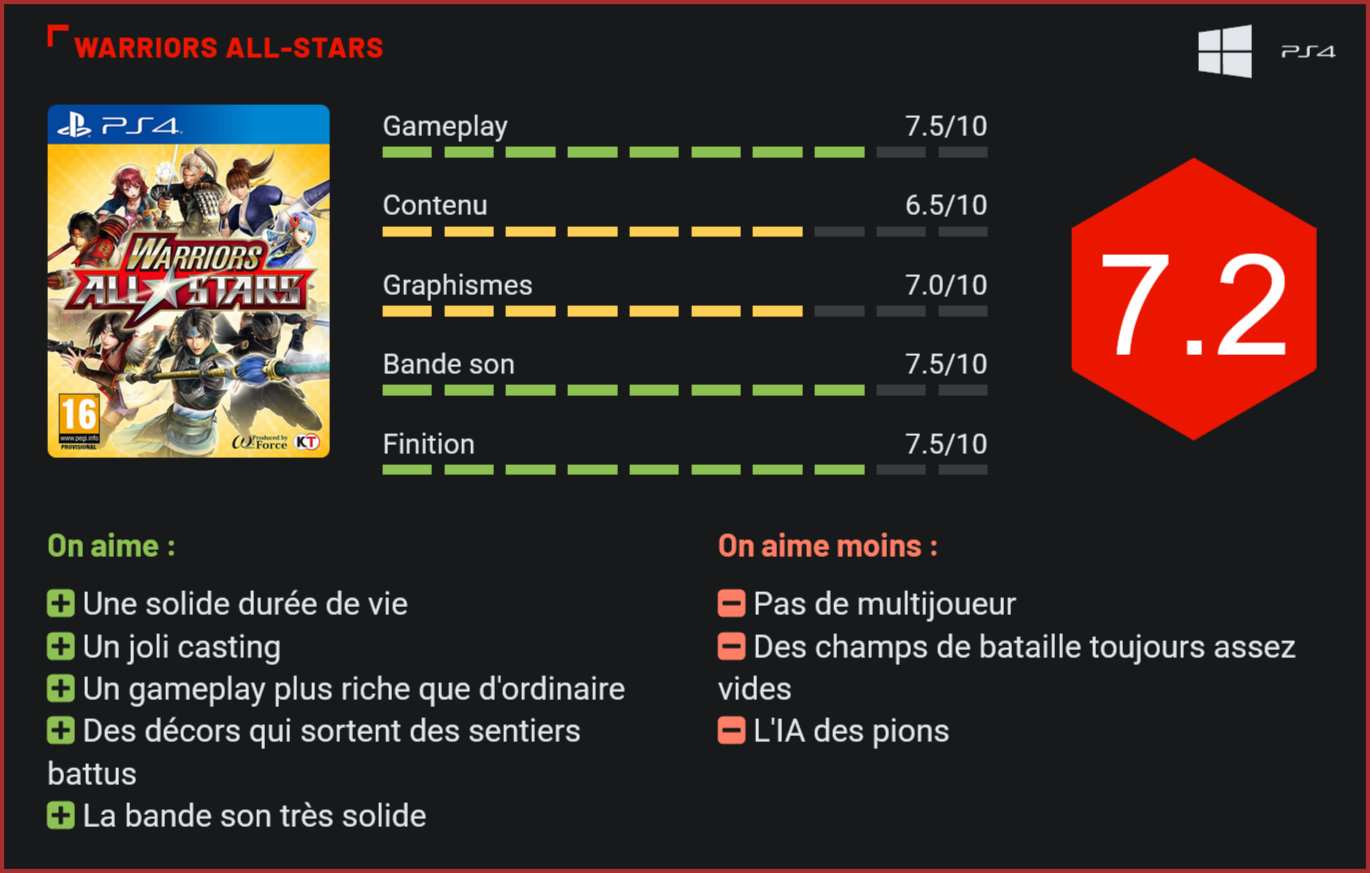 Passé presqu’inaperçu dans l’actualité, Warriors All Stars faisait partie des titres qu’on attendait pas forcément au tournant. Dans la plus grande tradition des “musou”, le jeu de Tecmo Koei parvient toutefois à tirer son épingle du jeu grâce à un casting de folie… Depuis un an maintenant, on assiste à un véritable déluge de “musou”, ce style de jeu si particulier qui est né avec la série des Dynasty Warriors de Koei. L’éditeur enchaine les spin-off et dérivés à une vitesse impressionnante. Le dernier en date, Warriors All Stars, était passé pratiquement inaperçu dans l’actualité vidéoludique. Il pourrait toutefois séduire plus d’un joueur. Et pour cause puisqu’il s’agit d’un véritable crossover des meilleures franchises de Tecmo Koei! Au casting du jeu, on retrouve ainsi plusieurs personnages emblématiques de la série des Dynasty Warriors, de Zhao Yun à Zhou Cang en passant par l’incontournable Lu Bu, mais aussi des personnages venant d’univers diamétralement opposés. On se surprendra ainsi à incarner Kasumi, Ayane et Ryu Hayabusa, trois personnages emblématiques de la série de jeux de combat Dead or Alive, William Adams, le personnage central de NiOh, mais également plusieurs héros des univers de Toukiden, Samurai Warriors, de la série des Atelier, d’Opoona, Deception, Haruka et Samurai Cats – rien que ça! Au total, on retrouve donc une trentaine de personnages issus des principales franchises de l’éditeur. Réunir tout ce beau monde dans un seul et même jeu n’était pas une tâche facile pour Omega Force. Mais le studio de développement s’en est finalement brillamment sorti. A travers un scénario inédit, le joueur verra s’affronter trois factions, qui font appel aux héros d’univers parallèles pour porter leurs rêves de grandeur. Si le scénario du jeu n’est finalement qu’un prétexte pour réunir un joli casting, on notera toutefois que le concept fonctionne plutôt bien. L’univers du jeu est cohérent, et c’est justement ce qui fait tout le charme de ce musou. Outre la joie d’incarner ses personnages préférés dans un Dynasty Warriors-like, ce sont surtout les couleurs chatoyantes, les environnements inédits et les ennemis au design improbables qui permettent à ce titre de se démarquer des autres jeux du même genre. Car dans le fond, rien n’a changé. All Stars reste un Dynasty Warriors dans la plus pure tradition du genre, avec ses séquences de planification du combat, ses affrontements répétitifs, ses nombreux “boss” et toute sa dynamique propre. Confronté à des milliers d’unités et accompagné de sa propre armée, le joueur devra évoluer avec son escouade de deux compagnons sur le champ de bataille et défaire les commandants ennemis jusqu’à l’affrontement contre le général adverse. Plusieurs conditions devront parfois être remplies pour remporter la victoire. Joliment scénarisées, les missions restent toutefois très répétitives comme tenu de la nature même de ce type de jeu. Là où Omega Force marque des points, c’est au niveau du casting. Comme dans les Dynasty Warriors, chaque personnage a son propre style de combat et ses propres pouvoirs. Et quel plaisir de pouvoir incarner des personnages aussi cultes que Kasumi, Ryu ou William dans un Dynasty Warriors-like! All Stars introduit également plusieurs nouvelles mécaniques de jeu qui ajoutent un peu de piment aux batailles. On songera ainsi au concept d’escouade, qui permet de tirer parti des atouts de ses deux compagnons en cours de partie, en faisant appel à eux pour bénéficier d’un gain de santé, lancer un combo meurtrier ou affaiblir l’ennemi. Pour rendre la progression dans le jeu plus passionnante, Tecmo Koei introduit également un système de cartes qui permet de débloquer de nouveaux personnages. Des cartes que le joueur devra récupérer sur le champ de bataille, en affrontant les commandants adverses. Le concept de cartes est poussé plus loin encore avec des objets à équiper en cours de partie et à crafter, dans le menu principal, pour améliorer son arsenal. Plus intéressant, on notera qu’il est également possible d’obtenir d’autres bonus en tissant des liens d’amitié avec d’autres personnages, liens que vous créerez en réalisant des missions secondaires ou en faisant équipe avec les bonnes personnes. Rien de vraiment transcendant en soi pour le genre, mais des petites nouveautés qui permettent de donner une identité propre à ce spin-off. Sur le plan technique, All Stars s’en sort également très bien – mieux en tout cas que la majorité des autres jeux du genre. Les modélisations des personnages sont superbes, les effets visuels nombreux et les champs de bataille plus travaillés que d’ordinaire. En revanche, les champs de bataille restent très vides une fois que le ménage a été fait et les pions adverses sont toujours aussi peu réactifs. Pour le reste, le contenu du jeu est assez riche pour vous tenir scotché à votre pad durant plusieurs dizaines d’heures. La replay value est également assez impressionnante, vu le casting du jeu et le nombre de fins différentes disponibles. Et ce, d’autant plus qu’il est possible de commencer une nouvelle partie en conservant objets, argent, niveau et affinités accumulés au cours de la campagne précédente. Assez paradoxalement, Tecmo Koei n’a pas songé à introduire un mode multijoueurs à son titre. Un oubli impardonnable pour ce type de jeu. L’absence de modes de jeu secondaires devrait également déranger les habitués du genre, qui se verront ici limités à un seul et unique mode solo. Conclusion Avec sa durée de vie colossale, son casting de folie, son gameplay très riche et sa bande sonore d’exception, Warriors All Stars est probablement l’un des musou les plus originaux que nous ayons pu prendre en main. Le jeu d’Omega Force joue brillamment la carte du fan servi