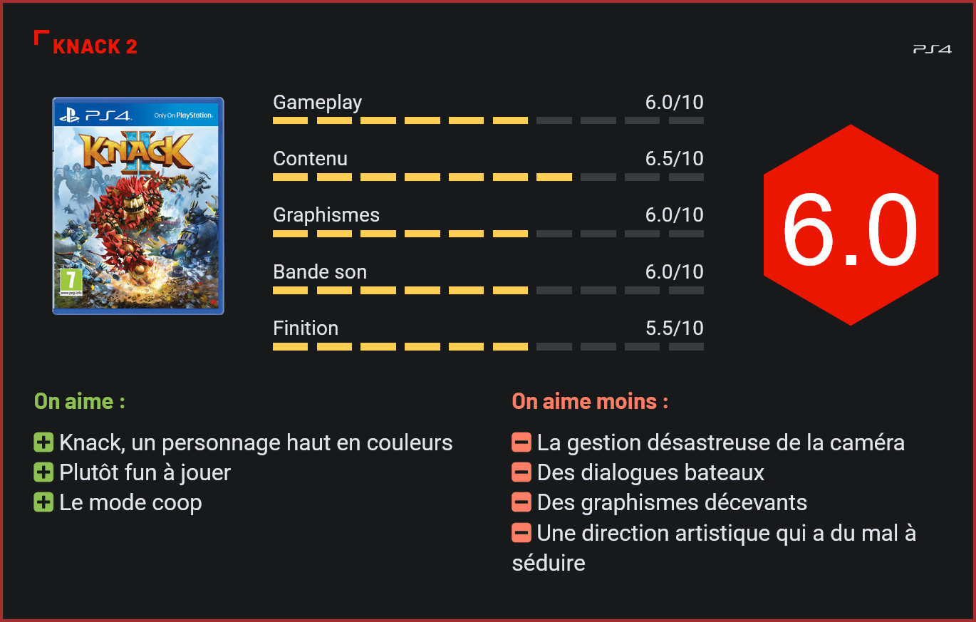 Bien que le premier épisode, sorti en 2013, n’avait pas convaincu la presse ni le grand public, Sony a tout de même décidé de donner son feu vert pour la réalisation d’un second volet. Et si tout est encore loin d’être parfait, difficile de ne pas constater les progrès réalisés en 4 ans. A la sortie de la PS4, en 2013, Sony Computer Intertainment avait présenté une nouvelle franchise à destination d’un jeune public. Innovant, le jeu avait toutefois été décrit par la presse comme beaucoup trop dur. L’univers trop enfantin du jeu avait également poussé de nombreux joueurs à l’oublier aussitôt sorti. Quatre ans plus tard, le studio de développement à l’origine du jeu nous livre une suite sur PS4. Ce second épisode se situe avant les évènements du premier et est censé permettre au joueur de mieux comprendre comment le conflit entre les humains et les gobelins a débuté. Futuriste, l’univers de Knack II, n’en reste pas moins très coloré. L’intérêt principal du jeu reste bien sûr le héros de l’aventure, Knack, une sorte de golem composé de vieilles reliques qui sont reliées entre elles grâce à une magie ancestrale. Une faculté qui permet à Knack de grandir et rétrécir à volonté en absorbant d’autres pièces du même acabit. Un univers enfantin mais divertissant Accompagné de ses deux amis, Lucas et son oncle, Knack tente d’arrêter l’avancée des gobelins qui veulent anéantir l’humanité. Un scénario plutôt basique et qui ne laisse malheureusement aucune surprise, si ce n’est quelques retournements de situation ponctuels. L’histoire n’est en effet pas très intéressante à suivre et les dialogues sont ennuyants. Au final, c’est l’action qui prime et on ne s’en plaint pas étant donné la qualité des dialogues. L’humour et le second degré sont attendus et n’arrachent à aucun moment un léger rictus. Un mix de plusieurs genres Knack II est un jeu assez complet et plutôt bien fait. Jeu de plateformes à la base, le titre n’hésite pas à mélanger les genres en proposant des séquences de combat et des énigmes. La progression se fait de manière assez intuitive ce qui le rend plutôt addictif. On ne voit pas le temps passer et on n’a pas l’occasion de s’ennuyer entre les ennemis à battre et les énigmes à résoudre. Au niveau des plateformes, les choses s’emboitent bien. Pas d’abus de difficulté, ni de facilité – même s’il est possible de choisir le mode du jeu. Malheureusement, l’expérience est gâchée par une caméra incontrôlable qui a du mal à s’adapter. C’est parfois un vrai handicap et, souvent, très frustrant. A chaque carte son Knack En fonction des zones et des chapitres, Knack peut s’adapter aux différents milieux et intégrer de nouveaux éléments ce qui lui permettra d’acquérir de nouvelles attaques. De quoi éviter la redondance des coups de pieds et de poings avec des variantes plutôt sympas. On regrette d’ailleurs que certains enchainements ne soient pas permanents. Ce nouveau titre intègre également un arbre à compétences qu’on peut compléter en accumulant de l’énergie. L’occasion d’améliorer ses coups et de débloquer de nouveaux enchainements. En collectant des pièces – souvent bien cachées – durant la progression, Knack pourra s’enrichir de nouvelles protections et autres facilités. Petit, tu seras, immense, tu deviendras Malheureusement, la grande spécificité de Knack semble tout de même mal gérée. Passer d’un colosse à un ourson grâce à une seule touche, c’est plutôt intéressant, surtout dans des cinématiques où le joueur doit suivre les commandes à l’écran. Mais cela souligne justement la ponctualité de son utilité. Durant les combats, la petitesse est rarement conseillée. À croire qu’elle ne sert qu’à collecter des coffres bien cachés ou à « s’infiltrer » dans des passages indiqués. Overdose de couleurs et de sons Le plus gros défaut du jeu reste toutefois sa réalisation. On a en effet trop souvent l’impression de se retrouver face à un jeu qui n’est pas fini. Si Knack est très réussi, le reste du casting l’est nettement moins. Les décors sont pauvres et les effets visuels n’ont rien de transcendant. On en vient finalement à penser que le jeu aurait très bien tourner sur PS3… La bande sonore du jeu ne joue pas non plus à son avantage, avec des bruitages répétitifs et des morceaux sans charme. A deux, on est plus fort Par rapport au premier volet, Knack 2 gagne un atout de charme. Le jeu de Sony introduit en effet un mode coopératif à deux joueurs qui permet de combiner les pouvoirs de deux Knack pour lancer des attaques surpuissantes. Beaucoup plus agréable à parcourir à deux que seul, le jeu se laissera dévorer avec plaisir par les plus jeunes. Au niveau de la durée de vie, prévoyez une dizaine d’heures pour explorer l’univers du jeu de fond en comble. Difficile en revanche d’être séduit si vous avez déjà dépassé l’adolescence… Conclusion Plus intéressant que le premier épisode, Knack 2 séduit surtout par son univers enfantin, ses décors chatoyants et le charisme de son héros, Knack. Mieux pensé que le premier volet, Knack 2 introduit un mode coop’ très agréable à parcourir et de nouveaux combos dévastateurs. Comme son ancêtre, le titre de Sony reste toutefois à la traîne visuellement, souffre d’une gestion de la caméra désastreuse et d’un scénario trop banal pour réellement séduire.