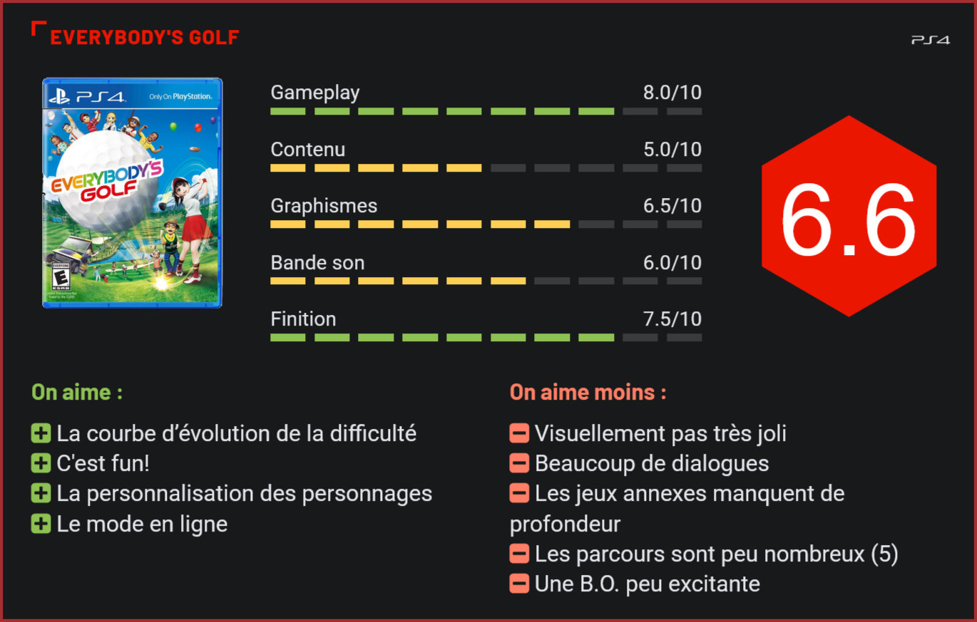 La licence Everybody’s Golf revient avec un nouvel opus pour le plus grand plaisir des fans du genre. Exclusivité PS4, le titre de Sony Interactive Entertainment mise sur une personnalisation poussée, des décors colorés et un gameplay fun pour séduire les joueurs. Everybody’s Golf est une série de jeux de golf qui a fait ses débuts en 1997 sur la Playstation de première génération. Une série vieille de 20 ans qui a plu grâce à son humour décalé, des personnages sympathiques et surtout un gameplay très fun. Du fun et des techniques pour régner sur le green Sous son air joviale et naïf, Everybody’s Golf ne lésine pas sur la qualité et la complexité du sport qu’est le golf. Impossible de faire un ace (trou en un) dès le premier parcours. Il reste cependant très accessible et propose une bonne initiation au golf pour les débutants. Grâce à une courbe d’évolution intéressante, le joueur peut se familiariser avec les bases du sport et les commandes du jeu afin de progresser. Apprendre à manier l’art du swing, du top ou d’un lob, est un bon début, mais le jeu tend à souligner l’importance de prendre en compte plusieurs éléments pour faire un bon parcours. Que ça soit la qualité du terrain, le vent ou la météo, arriver au drapeau n’est pas toujours une chose aisée. En plus de l’orientation de son personnage, il faudra se concentrer sur niveau de la jauge de tir, actionnable en trois temps. C’est là que tout se joue; une pression pour lancer la balle, une deuxième pour déterminer la puissance et une dernière pour la précision. Le tout étant d’arriver au drapeau avec le moins de tir possibles et d’éviter de se retrouver coincer dans un bunker ou atterrir dans un étang. A force de pratiquer, de nouvelles techniques de jeu et de nouvelles difficultés viennent enrichir l’expérience. Les parcours deviendront à la fois plus faciles à parcourir grâce à la maîtrise du putt ou de l’albatros, mais ils seront beaucoup plus longs, passant d’un Par 3 (229 mètres) à un Par 4 (entre 228 et 434 mètres) voire un Par 5 (plus de 434 mètres). De quoi occuper le golfeur en herbe. De plus en plus de points à prendre en compte viendront compliquer le jeu comme la pluie, le vent, les distances et obstacles sur le parcours. Durant sa progression, on pourra équiper son personnage de nouveaux clubs permettant une meilleure adaptabilité au terrain: un Bois, un Driver ou Chipper par exemple. L’expérience accumulée permet également de se confronter à de nouveaux adversaires. Le game design est sans cesse modifié en fonction de son avancement ce qui permet de renouveller les parties et les tactiques de jeu. On notera également le mode miroir et le mode retours qui viennent augmenter la diversité des exercices. Un monde semi-ouvert intéressant Pour ce septième épisode – auquel on rajoute 5 spin-off -, Everybody’s Golf propose un mode en ligne plus travaillé que ses prédécesseurs. En mode local ou en ligne, on peut facilement se confronter à des joueurs réels, paramétrer des parties et entrer dans une nouvelle forme de compétition. Avec la « Guerre des Territoires », deux équipes s’affrontent sur un parcours, le but étant de passer le plus vite possible d’un trou à l’autre. Un mode chronométré qui obligera les joueurs à jouer vite, mais bien aussi, afin d’éviter de perdre du temps inutilement. Une vraie compétition à la fois contre la montre et contre ses concurrents et qui offre un vrai plaisir de jeu. Une île dédiée au golf : Golf Island Transporté sur une île dédiée à la pratique du golf, le joueur peut se balader sur l’ensemble de l’île. A la nage ou en voiturette, il est intéressant d’explorer les moindres recoins de Golf Island afin de découvrir les lieux, mais aussi des trésors cachés. La palette de couleurs criardes à laquelle on est confronté est plutôt intense, mais fidèle à ce qu’on a pu voir dans les autres titres. Les arrières plans sont très beaux, mais manquent de finition quand on s’approche, comme le reste du visuel. Il arrive d’ailleurs que certains objets bloquent la vue lorsqu’on sort du fairway et qu’on se retrouve dans le rough (hautes herbes) ou un bunker. Dans ces cas-là, on est content que le “dropper” existe (action qui consiste à ramasser sa balle lorsqu’elle se trouve dans un endroit injouable et la lâcher le bras tendu sur le fairway). Le design des personnages reste très mignon, à l’image des Mii, avec une grosse tête et des petits corps. Pour ce nouveau volet, Clap Hanz intègre une personnalisation extrême des personnages. Un élément qui semble couler de sources pour un jeu de 2017, mais qui fait tout de même plaisir. On soulignera tout de même un mode aléatoire qui permet de passer cette étape. Là où le titre marque des points, c’est justement dans son approche ouverte du genre, et dans la présence de quelques mini-jeux. Il sera ainsi possible de conduite des buggys un peu partout sur l’île, pour varier les plaisirs. Niveau durée de vie, vous vous en doutez, celle-ci est intimement liée à l’intérêt du joueur pour ce style de jeu. L’un dans l’autre, difficile de trouver un sérieux concurrent à ce titre, qui devrait dès lors n’avoir aucune difficulté à séduire les amateurs de golf. Dans le même genre, il faut en effet remonter à Ultra Mini Golf et Outlaw Golf pour trouver de sérieux concurrents à Everybody’s Golf… Conclusion Accessible et évolutif, le nouvel Everybody’s Golf s’impose au niveau des jeux de golf sur console. Avec son monde semi-ouvert, l’expérience de jeu déjà bien riche est augmentée avec son mode de compétition caractérisable par le joueur. Des techniques et des difficultés réalistes qui ne laissent pas de place au hasard. Maitrisable pour un public néophyte ou pour des joueurs avérés, Everybody’s Golf propose un jeu de qualité, fun et agr