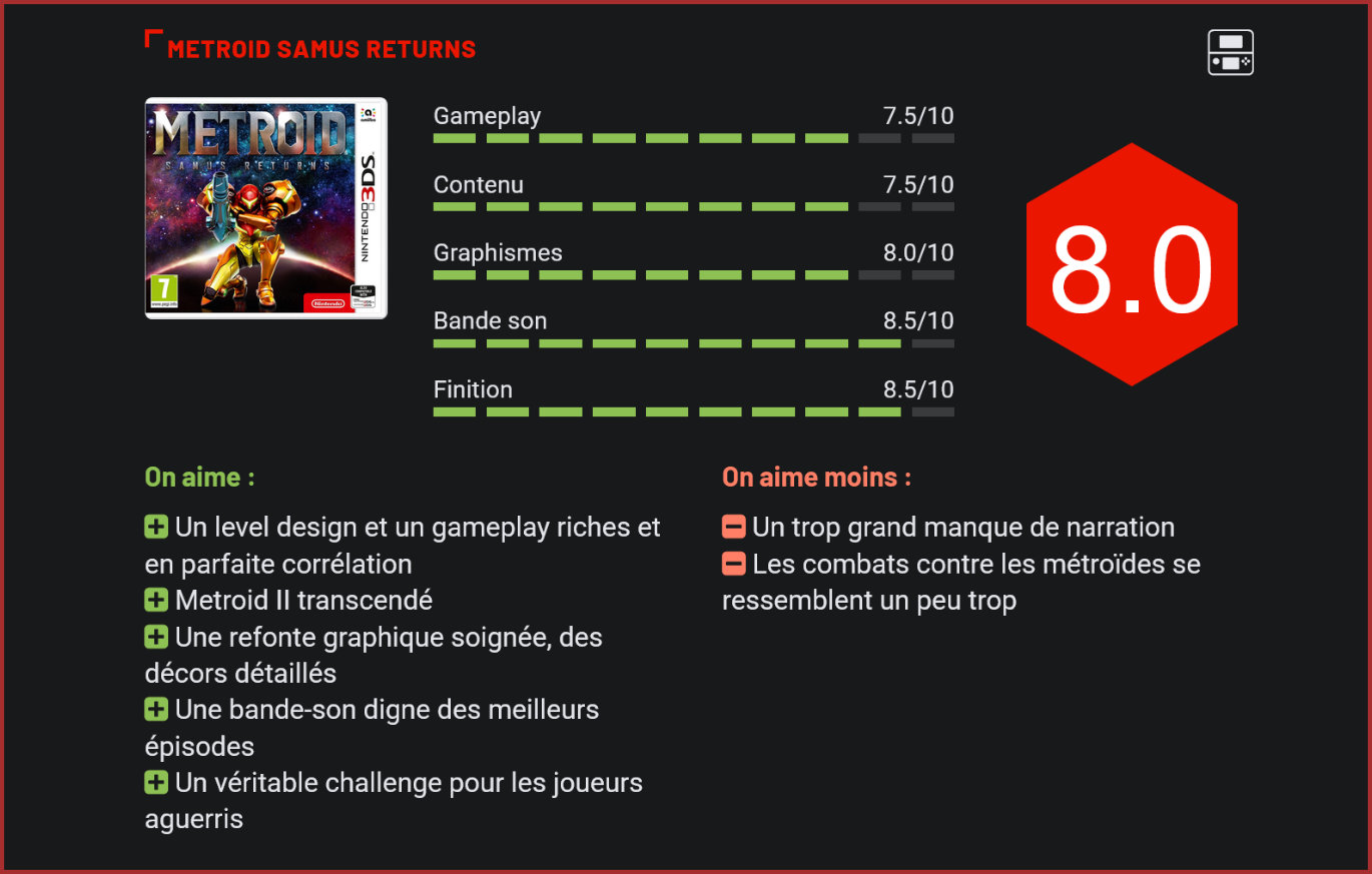 Rares sont les remakes qui parviennent à transcender leur modèle. Confiés aux bons soins du studio MercurySteam (Castlevania : Lords of Shadow), celui de Metroid II : Return of Samus sorti initialement en 1991 sur Game Boy est pourtant de cette trempe, offrant à la 3DS l’un de ses meilleurs jeu d’exploration en 2D. Comme dans l’opus original, Metroid Samus Returns voit la chasseuse de prime intergalactique Samus Aran se rendre sur la planète SR388 pour y éradiquer toute trace de métroïdes, ces parasites extraterrestres qui absorbent l’énergie de leurs proies pour survivre et évoluer. Une partie de chasse dans les entrailles de ce territoire infesté s’ensuit, chaque groupe de métroïdes vaincus ouvrant de nouvelles voies permettant de poursuivre la mission. Si les combats contre les métroïdes ont un peu trop tendance à se ressembler, la faune et la flore de SR388 s’avère suffisamment variée et les pièges ne manquent pas afin de varier les plaisirs et maintenir constamment l’intérêt du joueur. Une exploration bien pensée Surtout que, comme le veut la tradition, tout est pensé pour une exploration de fond en comble. Malgré quelques petits allers-retours inhérents à la série, la progression est assez libre et le joueur peut éliminer les métroïdes présents dans chaque zone dans l’ordre qu’il veut…à condition de dénicher les capacités nécessaires pour en débloquer l’accès. Le level design se marie parfaitement à un gameplay aux petits oignons, le premier étant conçu pour exploiter à fond toutes les capacités que Samus débloquera au fil de l’aventure. Aux commandes de cette dernière, le joueur fouille ainsi chaque recoin et exploite toutes ses capacités pour progresser et dénicher le moindre item. Il faut dire que le jeu fourmille de secrets, raccourcis et bonus cachés, certains chemins principaux s’apparentant même carrément à de biscornus passages secrets. Une règle élémentaire de la saga Metroid ici parfaitement respectée et qui ravira les fans de la première heure, même si la tâche n’est pas toujours aisée. Samus, plus agile que jamais Samus Returns comprend en effet une bonne dose de challenge à l’ancienne et s’adresse à une catégorie de joueurs aguerris, demandant une attention de tous les instants et une bonne dextérité. La prise en main excellente du soft nous y aide grandement, Samus s’avérant d’une agilité déconcertante. Celle-ci peut tirer dans tous les sens (ce qui n’était pas le cas dans la version Game Boy) et le joueur habile pourra enchaîner avec souplesse et rapidité tirs, contres (l’un des nombreux autres ajouts par rapport à la version de 1991), sauts et passages en Morph Ball avec une grande aisance. Les amateurs de speed running et les joueurs les plus exigeants seront sans nul doute aux anges. De nouvelles compétences ont également fait leur apparition. Utilisant une jauge spéciale, elles permettent notamment à Samus de scanner l’environnement (pratique, voire un peu trop facile, pour découvrir tous les secrets), de ralentir le temps ou encore d’utiliser un champ de force protecteur. Une fois de plus, tout cela est parfaitement exploitable au cœur d’un level design diablement bien pensé. Un ravissement pour les yeux et les oreilles La refonte visuelle est de son côté remarquable, la palette de couleurs utilisée frappant forcément par rapport à l’original sur Game Boy, qui était tout en nuances (limitées) de gris. Bien que se déroulant en 2D, l’aventure profite du moteur graphique 3D déjà utilisé par MercurySteam sur le sympathique Castlevania : Lords of Shadow – Mirror of Fate, qui permet d’afficher une jolie profondeur à des décors vivants et merveilleusement détaillés (on conseillera d’ailleurs d’activer la 3D sur la console pour en profiter pleinement). La bande-son (bruitages compris) rend quant à elle hommage à cette saga mythique éditée par Nintendo, bénéficiant du talent des compositeurs à l’origine de Super Metroid. L’ambiance propre à la série est ainsi parfaitement respectée, Samus Returns ne s’encombrant au passage d’aucun véritable scénario ni de bla-bla. Un petit manquement qui a néanmoins la vertu d’amplifier le sentiment d’isolation du joueur. Conclusion Metroid Samus Returns est un titre autant destiné aux joueurs nostalgiques qu’aux plus exigeants grâce à un gameplay souple et complet accordé à un level design solide et regorgeant de secrets. Nintendo et MercurySteam accouchent donc presque d’un sans-faute qui propulsera le joueur avide d’exploration dans une aventure de plus de 10h qui possède en outre son lot de nouveautés et de surprises qui raviront les fins connaisseurs de l’opus original.