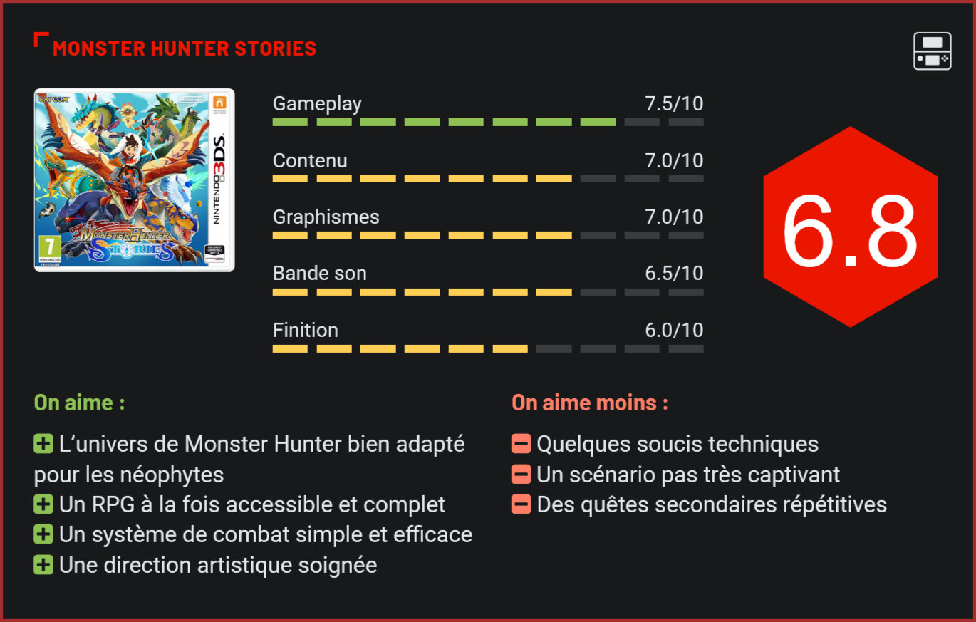 En attendant Monster Hunter World prévu pour le mois de janvier 2018, Capcom sort une version plus accessible de son jeu-phare sur 3DS, avec un gameplay davantage orienté RPG comprenant des combats au tour par tour simplifiés et une quête proposant de collectionner et dompter des créatures. Si elle ravit les chasseurs les plus chevronnés, la série des Monster Hunter peut s’avérer difficile d’accès pour le néophyte. Capcom a pour cette raison décidé d’élargir son audience avec un titre plus orienté grand public avec ce spin-off intitulé Monster Hunter Stories, uniquement disponible sur 3DS. Nanti de graphismes colorés en cell-shading, d’un univers bon-enfant et de mécanismes de combats simplifiés, le titre est avant tout destiné aux plus jeunes, sans pour autant délaisser la profondeur de son gameplay. Monstres et cie Ce qui marque avant tout, c’est bien évidemment l’allure très kawaï du titre. C’est lumineux, coloré, le héros est un enfant d’une dizaine d’année accompagné d’un minou très allègre et il n’est pas ici question de chasser les monstres pour les éliminer mais de les dompter pour en faire ses alliés. Les créatures qui peuplent habituellement l’univers de Monster Hunter deviennent ici des monsties (contraction de monster et bestie en anglais) que l’on peut chevaucher pour explorer un monde divisé en cinq grandes zones et auprès desquels l’on combat durant toute l’aventure. On incarne en effet un rider en herbe, sorte de guerrier capable grâce à une pierre d’amitié de créer des liens avec les créatures qu’il croisera durant sa quête. Pour cela, il faudra capturer celles-ci en s’aventurant dans leur tanière afin d’y voler un œuf pour ensuite le faire éclore dans son écurie. Chaque Monstie ainsi obtenu peut être assigné à son équipe pour prendre part au combat. Chacun dispose de capacités diverses, aussi bien en combat que lors de l’exploration, certains pouvant sauter des obstacles, grimper aux murs ou encore nager. Un RPG simplifié Contrairement aux autres titres de la série, les combats de Monster Hunter Stories se déroulent au tour par tour. Trois types d’attaques sont disponibles faisant appel à la force, la vitesse et la technique. Pour prendre le dessus sur l’adversaire, il faut soigneusement étudier ses coups suivant un principe triangulaire : la force l’emporte sur la technique, qui prend le dessus sur la vitesse, qui elle domine la force. Les coups réussis font ensuite grimper une jauge d’amitié qui permet de monter en selle pour effectuer des attaques spéciales avec le monstie choisi. Un système efficace et facile à prendre en main, dans lequel interviennent également des phases aléatoires de QTE. Il est bien sûr également possible d’utiliser toute une série d’objets et de potion curatives durant les combats. Un arsenal à la hauteur On retrouve d’ailleurs toute une partie dédiée à la recherche d’objets et au crafting, le joueur devant récolter divers éléments dans les environnements parcourus (végétaux, minéraux, insectes) afin de confectionner des potions ou d’améliorer ses armes et armures auprès des forgerons. Des nombreux éléments sont à ramasser, et l’arsenal s’avère bien fourni avec de multiples armes et armures à obtenir. Des quêtes secondaires viennent également se greffer à l’aventure principale, mais elles s’avèrent hélas très répétitives et sans grand intérêt si ce n’est celui d’obtenir les précieuses pièces de monnaie qui permettront de finaliser l’achat de pièces pour l’équipement. Le déroulement du scénario principal est quant à lui sans surprise mais se suit sans déplaisir. Si la patte graphique séduit avec des animations très réussies, on constate malheureusement des ralentissements fréquents et des textures qui s’affichent au dernier moment, en particulier sur 3DS classique. Des écrans de chargement un poil trop longs viennent également régulièrement gâcher les parties de chasse lorsque l‘on passe d’un environnement à l’autre. Conclusion Les néophytes et les plus jeunes pourront découvrir avec émerveillement l’univers de Monster Hunter dans cet opus kawai qui leur est avant tout destiné. Les connaisseurs et fans de la série risquent par contre de s’ennuyer face à un épisode manquant de challenge dont la quête s’avère au final beaucoup trop routinière. De plus, malgré des animations soignées, les nombreux ralentissements et autres soucis techniques gâchent franchement la partie, surtout sur 3DS classique.