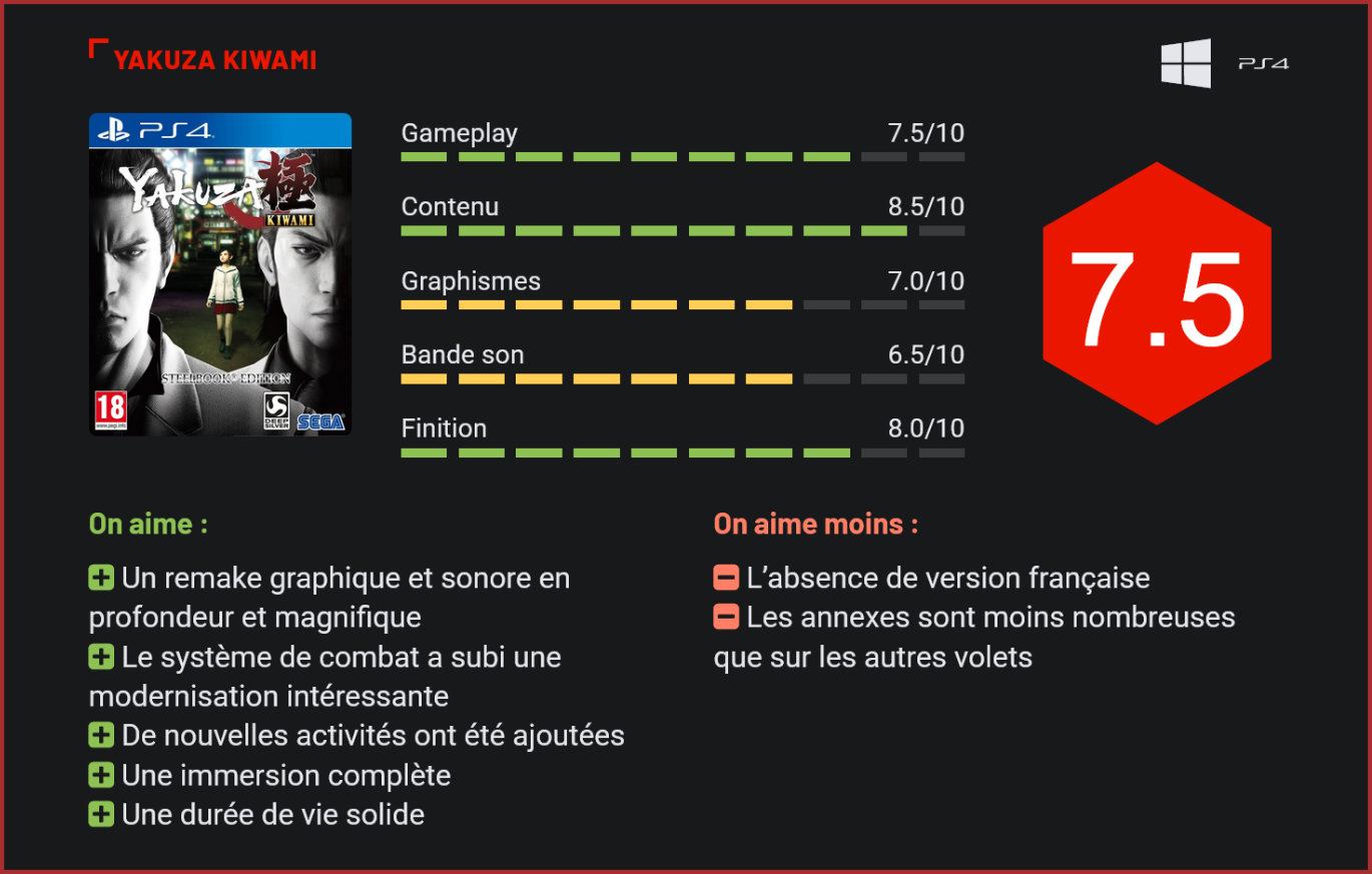 Les mystères autour de la mafia japonaise ne cessent de faire fantasmer les mafiosi en herbe. Édité par Sega, la série des Yakuza a permis à bon nombre de joueurs d’entrer dans ce monde très fermé. Douze ans après la sortie du premier titre, les fans peuvent revivre l’expérience du premier volet dans une version totalement remise à neuf. C’est donc une vieille histoire que nous refourgue Sega. Sorti en 2005 sur Playstation 2, Yakuza – ou Ryū ga Gotoku, pour les amateurs de langue japonaise – est le premier titre d’une saga de 6 épisodes qui compte presqu’autant de spin-off. Développant l’univers des mafiosi japonais, Yakuza a souvent été qualifié de la version asiatique de GTA. Crime, meurtre, mais aussi honneur et loyauté sont les mots d’ordre de cet univers rempli de malfrats, pots de vin, victimes et abus. Le titre avait déjà connu un portage en 2012 sur Playstation 3 et sur Wii U en 2013, mais Sega semble vouloir user jusqu’à la corde cette histoire puisqu’il sort un nouveau remake en 2016, au Japon. Ce n’est qu’en août 2017 que le reste du monde pourra profiter d’un Yakuza Kiwami totalement retravaillé. Rien que pour la qualité et la beauté des images, on pardonne le manque d’originalité scénaristique. On soulignera tout de même l’ajout d’une cinématique de 30 minutes totalement inédite. Petite parenthèse tout de même sur la saga pour les non familiers. Jeu d’action-aventure, Yakuza mêle les phases d’exploration et d’aventure à travers divers chapitres. La progression est parfois linéaire avec un développement de l’histoire principale et parfois non-linéaire où le joueur peut se balader à travers l’environnement, découvrir de nouveaux quartiers japonais, réaliser des quêtes annexes et collecter de nouveaux objets. Axé aussi beaucoup sur les combats, Yakuza demande une grande familiarité avec les touches et les enchaînements afin de terrasser la vermine avec des combos surpuissants. Honneur et courage sont aussi des mantras importants de la saga, code de la famille des Yakuzas. Une histoire connue mais immersive Malgré le portage total de l’histoire du premier épisode, le scénario conserve son charme. Riche parfaitement construit, Yakuza Kiwami nous plonge dans le destin honorablement tragique de Kazuma Kiryu, un ex-yakuza emprisonné pendant 10 ans pour un crime dont il avait endossé la responsabilité pour protéger son ami d’enfance, Kazama Shintarô. Celui-ci avait assassiné l’un des grands parrains japonais pour avoir tenté d’abuser de sa petite sœur. Après dix ans loin des codes de la rue, Kiryu devra réapprendre à survivre dans un monde où il sera à la fois rejeté par sa famille de mafieux et rechercher par les proches de celui qu’il a soi-disant tué. Malheureusement pour lui, son ami d’enfance Kazama Shintarô ne lui sera pas d’une très grande aide étant donné qu’il est devenu l’un des parrains les plus cyniques des Yakuza. Relations compliquées, retournements de situation et folie meurtrière sont au rendez-vous et entrainent le joueur dans la vie compliquée d’un gangster dont le mantra est l’honneur et le courage. Des qualités peu communes dans les rues où seule la loi du plus fort semble désormais régner. Combats épiques sur base d’arts martiaux Si le jeu comporte plusieurs séquences d’exploration, Yakuza est avant tout une série de jeux de « Beat’em all ». Pour combattre la pègre et se défendre face aux Yakuzas mécontents, notre cher Kazuma Kiryu va devoir réapprendre à maitriser les techniques ancestrales des arts martiaux. Et quelle richesse ! On est loin des coups de poings et de pieds basiques, ici, on enchaine avec tous les parties du corps et objets trouvés au sol. Coups de pied circulaires, manchettes, écrasements des vertèbres, batte de baseball. Sensible, s’abstenir. Le tout est de maîtriser les touches. Durant la progression, un tutoriel viendra aider les mafieux en herbe à intégrer la complexité des enchainements. La concentration est de rigueur, surtout face à 3, 4 ou 5 ennemis. Les combats sont rarement à nombre égal ici. Mais cela n’est rien comparé aux affrontements des boss. Chacun ayant son style, notre Kiruy – et le joueur – devra maîtriser les 4 modes des combats plus intensément qu’avec des malfrats de premier ordre. Sega a d’ailleurs modernisé les combats à ce niveau par rapport au titre de 2005. Chaque situation implique son mode ; Brawler, Rush, Beast et Dragon de Dojima, chacun ayant ses avantages et inconvénients. La maîtrise est accompagnée par une puissance de frappe grisante pour le joueur. On notera également l’apparition répétée et incongrue d’un personnage devenu clé dans la saga : Majima. Un mafieux plutôt perturbé qui bondit devant notre héros meurtri à n’importe quel moment pour un combat épique. Les Majima Everywhere ont la particularité d’apporter un petit côté comico-flippant à l’aventure. Des quêtes annexes pour tous Les quêtes secondaires et l’extermination des vermines viendront compléter le gain d’expérience, utile pour améliorer ses techniques de combats. Kazuma Kiryu pourra également s’équiper de bon nombre d’arme en tout genre et déguster des mets afin de restaurer sa jauge de vie. Pour ce remake, Sega offre deux nouvelles activités dans le quartier de Kamurocho. Le premier, le Pocket Circuit Car Racing est une course de voitures sur circuits électriques. Le second, MesuKin : Battle Bug Beauties est un jeu de combat Pierre-Papier-Ciseau plutôt particulier puisque ce sont des jeunes dames en petite tenue qui s’affrontent. Vous vous en doutez, avec un tel contenu, la durée de vie du jeu est tout bonnement exceptionnelle. Ceux qui accrocheront au concept en auront donc largement pour leur argent. Attention, on tourne La saga n’a jamais caché son attachement pour le 7ème art. De par son inspiration dans les 