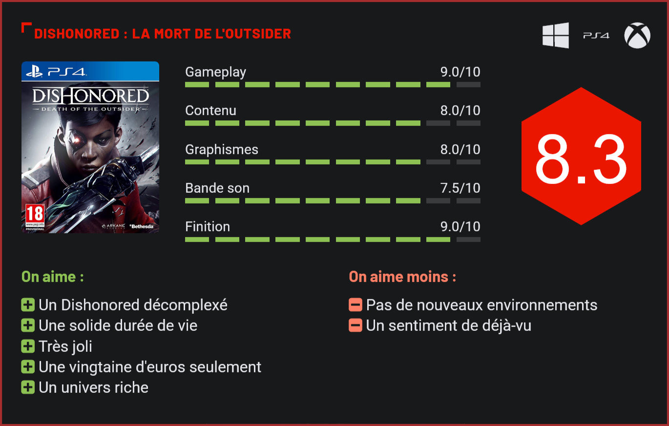 Si elle n’est pas la plus populaire auprès des gamers, la série des Dishonored est parvenue à séduire les gamers les plus exigeants avec son univers bien sûr mais aussi la richesse de son gameplay, qui en fait l’un des FPS les plus passionnants à parcourir de ces dernières années. En attendant un troisième volet, les développeurs nous proposent un premier spin-off, parfaitement maîtrisé. Depuis ses débuts, la série des Dishonored reçoit les éloges des critiques mais rencontre un succès relativement mitigé au niveau des ventes. Il faut dire que la série d’Arkane nage en eaux troubles, n’hésitant pas à mélanger les genres. A des années lumières d’un Call of Duty ou d’un Halo, le jeu du studio lyonnais plonge le joueur dans un univers futuriste d’une richesse impressionnante et ose faire preuve d’originalité au niveau du gameplay en jouant la carte de l’infiltration et des super-pouvoirs. Si les ventes de Dishonored n’ont pas influencé jusqu’ici la décision de Bethesda Softworks de porter le projet, la sortie d’un spin-off, qui serait pratiquement une extension du second volet, était sans doute la meilleure direction que pouvait prendre la franchise. Car ne nous voilons pas la face, Dishonored n’est pas une franchise qui marche auprès des consommateurs. Et s’il est appréciable de voir débarquer un nouvel opus, il semble fort peu probable que Bethesda engage des ressources dans le développement d’une suite en bonne et due forme. La Mort de l’Outsider semblait donc le parfait compromis pour le studio français, qui pouvait poursuivre l’extension de son univers sans prendre de trop gros risques. Car c’est bien là le plus gros atout de ce spin-off, qui aurait en théorie très bien pu être une extension de Dishonored 2. Il n’est pas nécessaire d’avoir joué aux deux premiers opus ni de posséder le second volet pour y jouer. Pour les fans, le jeu creuse un nouveau pan de l’histoire de Dishonored, et nous fait redécouvrir un personnage croisé à plusieurs reprises. A travers ses yeux, le joueur redécouvrira Karnaca sous un nouveau regard. Car Billie a une vision du monde très différente des autres protagonistes de l’univers d’Arkane. Sans trop entrer dans les détails, les joueurs en apprendront beaucoup plus sur l’univers de Dishonored, les origines de l’Outsider et les liens qui unissent les différents personnages. Le scénario de ce spin-off est une fois de plus une franche réussite. D’autant plus que l’aventure principale vous tiendra scotché à votre pad durant 8 à 14 heures. Une durée de vie impressionnante pour un jeu vendu à tout petit prix… Car oui, l’autre atout de proposer un spin-off, c’est qu’il est possible de le vendre à un prix nettement inférieur. De quoi pleinement convaincre les fans de sauter le pas! La Mort de l’Outsider aurait toutefois été un titre très pauvre s’il n’avait pas introduit de grosses nouveautés. Les habitués de la franchise auront ainsi le bonheur de découvrir que contrairement à Dishonored 2, la plupart des pouvoirs de Billie sont débloqués dès le début de l’aventure, ce qui donne libre cours à la créativité du joueur pour éliminer les ennemis. Arkane n’hésite pas à bouleverser les codes du genre pour satisfaire les joueurs. Beaucoup plus nerveux que ses ancêtres, le jeu d’Arkane ne limite pas non plus le joueur en mana, et donc en attaques spéciales, laissant ainsi libre court à toute sa rage pour massacrer ses ennemis. Le mana se régénérant de manière automatique, le jeu libère totalement le joueur de toute contrainte. De nouvelles capacités sont bien sûr également au programme. Si le jeu reste globalement très proche de ses ancêtres, en mixant infiltration, combats au corps à corps et exploration, il délivre le joueur de toute contrainte. On remarquera ainsi également la disparition des choix au cours des missions, qui influençaient l’histoire. Plus besoin de réfléchir aux conséquences de ces actes donc, puisque le joueur est véritablement libre d’aborder le champ de bataille selon ses envies. Extraordinaire en terme de level-design, le jeu d’Arkane se veut également très riche au niveau de son gameplay, et offre de nombreuses façons d’aborder ses adversaires. La présence d’objectifs secondaires au cours des missions permettra de garder un semblant de respect à l’égard des règles du jeu, et de ne pas céder au massacre pur. Intelligent, le jeu ne souffre finalement que d’un seul gros défaut : celui de nous replonger dans des environnements déjà parcourus et de ne pas nous faire découvrir de nouveaux décors. Un sentiment de déjà-vu qui gênera peut-être ceux qui ont fait les deux premiers opus, mais pas les nouveaux venus. Ceci étant dit, si la ville reste la même, les développeurs ont tout de même fait l’effort de concevoir de nouveaux intérieurs. Pour le reste, pas de grosse surprise à l’horizon, le jeu d’Arkane remplit parfaitement son contrat. S’il avait été proposé à plein tarif, la note et la conclusion de ce test auraient sans doute été très différentes. Pour un peu plus de 20€, le jeu d’Arkane reste donc une excellente affaire, pour les fans comme pour ceux qui n’avaient pas encore goûté aux délices de Dishonored! Conclusion Proposé à un tout petit prix (un peu plus de 20€), Death of the Outsider est le spin-off dont tous les fans de la série rêvaient. Totalement décomplexé, le jeu pousse le joueur à exploiter ses nombreuses capacités dans des affrontements nerveux et violents. Riche en contenu, le jeu d’Arkane devrait séduire à la fois les habitués de la série, de par ses mécaniques de jeu repensées, et les nouveaux venus. Si l’on regrettera un sentiment de déjà vu, le studio lyonnais est parvenu à brillamment exploiter les assets de Dishonored 2 pour nous proposer une nouvelle aventure qui mérite le détour