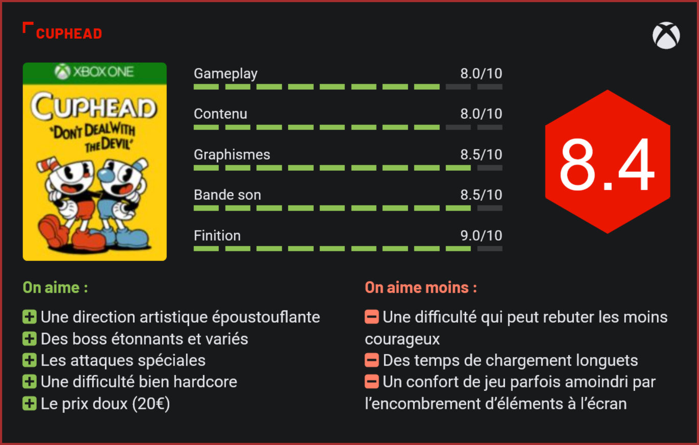 Issu d’une collaboration entre Microsoft et le studio indépendant MDHR, Cuphead est une exclusivité Xbox One qui a su faire monter l’attente en affichant son esthétique cartoon flamboyante dans moult vidéos. Mais derrière sa beauté plastique se cache un titre retors qui mettra les nerfs des joueurs à rude épreuve. Cuphead et Mugman sont deux tasses qui, après avoir perdu une partie de poker contre le Diable, doivent partir récolter pour ce dernier les âmes des créatures farfelues habitant Inkwell Isle. Sur cette île haute en couleurs divisée en trois parties que l’on parcoure en vue du dessus, nos héros vont de boss en boss, récoltant au passage des pièces dans des phases de plateforme qui leur seront bien utiles pour améliorer leur redoutable tir sortant de…leur index ! Des influences délicieusement rétro Conçu initialement comme un pur boss rush, Cuphead est issu de l’imagination des frères Moldenhauer. Ces deux canadiens ont travaillé durant sept ans sur leur bébé, dessinant et animant chaque image à l’ancienne, c’est-à-dire à base de bons vieux crayons, de celluloïds et de peinture à l’aquarelle, notamment utilisée pour les décors. Le résultat est un ravissement pour les yeux en hommage aux dessins animés des années 30, véritable âge d’or d’où émanaient des personnages tels que Mickey Mouse et Betty Boop. L’amour de cette époque transpire de chaque image de Cuphead, son ambiance rétro étant joyeusement rythmée par une bande sonore jazzy du plus bel effet. Les influences de Cuphead lorgnent aussi bien sûr du côté du jeu vidéo. A l’instar d’un Contra III ou d’un Gunstar Heroes, le jeu est un run and gun agrémenté d’une petite dose de shoot’em up à défilement horizontal. Les héros peuvent ainsi tirer dans huit directions différentes, sauter, s’accroupir et même profiter d’un dash. Le joueur a également la possibilité d’utiliser un « parry » en rebondissant sur le moindre élément rose présent à l’écran. Autant de mouvements et d’actions simples et efficaces qui vous permettront de venir à bout des boss et niveaux retors présents tout au long de l’aventure. Une difficulté diaboliquement élevée Autant vous prévenir, vous aurez besoin de bien maîtriser ces bases pour venir à bout du titre. A l’image des jeux cités plus haut, Cuphead est un monstre de difficulté qui demande beaucoup de patience, de dextérité et de concentration. Vous allez littéralement vous arracher les cheveux ! Les boss, qui composent la plus grosse partie du jeu, sont diaboliquement retors et changent leurs attaques lors de plusieurs phases. Cela engendre une foule de patterns à étudier attentivement mais prenez gare, car ils ne sont pas toujours lancés dans le même ordre lors d’un nouvel essai. Car n’imaginez pas réussir à battre un boss du premier coup : Cuphead embrasse les mécaniques du die and retry et vous allez mourir, au bas mot, des centaines de fois. Vous aurez toujours la possibilité de choisir le mode facile qui supprime notamment certaines transformations des ennemis mais qui ne permet pas d’accéder au monde final, uniquement accessible en ayant récolté les âmes des ennemis en mode normal. Pour profiter du jeu pleinement, il va donc falloir souffrir. Vous pourrez d’ailleurs décider de souffrir à deux, le jeu permettant de jouer en coopération (mais uniquement en local). On pourrait se dire que l’aventure est plus facile de cette façon, mais, même si ce mode permet de ressusciter son partenaire grâce à un « parry » effectué sur son fantôme, il ne simplifie pas forcément les choses, l’encombrement à l’écran devenant bien trop souvent important. Une persévérance récompensée Pour peu que l’on soit habitué au genre, on ne se décourage pour autant pas devant les nombreux échecs et l’on a toujours envie de recommencer pour aller plus loin et voir ce que nous ont réservé les développeurs. Le rythme trépidant du jeu nous y pousse ainsi que sa direction artistique singulière à se damner, d’où émerge des idées peu vues dans l’univers du jeu vidéo. Cuphead fourmille véritablement de détails et d’animations à la fois dingues et magnifiques. On soulignera d’ailleurs que ça fourmille tellement que la lisibilité à parfois tendance à en pâtir (des éléments à l’avant-plan cachant parfois des projectiles adverses, par exemple). Un fait qui se produit d’ailleurs davantage lorsque l’on approche de la fin du jeu. Un peu de plateforme pour le skill Entre les combats de boss, une petite poignée de phases de plateforme sous forme de run and gun permettent de récolter des pièces pour l’achat d’améliorations. Celles-ci permettent de changer le tir principal, d’obtenir des attaques spéciales ainsi que des charmes. Allant du tir autoguidé à l’ajout d’un point de vie, ces améliorations s’avèrent très utiles mais sont à utiliser à bon escient, l’ajout du point de vie diminuant par exemple légèrement votre puissance de tir. Des combinaisons à tester et à adopter en fonction de l’ennemi que l’on affronte, ce qui ajoute à l’ensemble une petite dimension stratégique pas désagréable. Notons que pour obtenir certaines attaques spéciales, il faudra passer par les mausolées présents sur la carte. Ces endroits demandent au joueur d’enchaîner les « parry » sur des fantômes roses afin de libérer un esprit qui remettra les super attaques en question. Sympathique. Si tout tourne à merveille et que recommencer un niveau après être mort se fait immédiatement, lancer la partie, entrer dans un niveau ou dans une nouvelle zone passe par contre par un écran de chargement longuet qui a même tendance à ramer. Un petit bémol qui a néanmoins la vertu de permettre de reprendre son souffle entre deux affrontements acharnés. Conclusion Ne vous fiez pas à son esthétique douce et charmeuse : Cuphead e