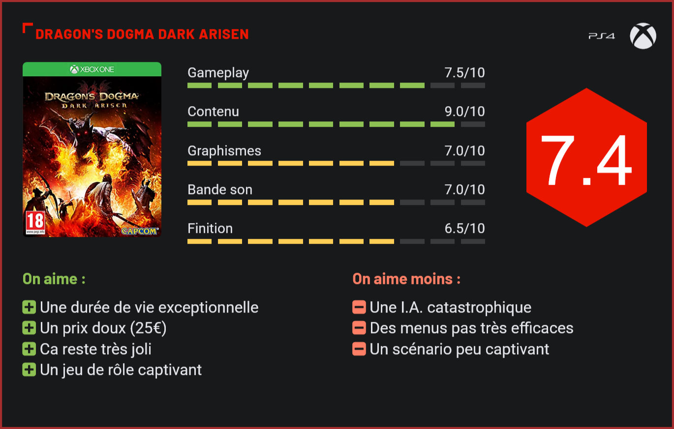 Fort critiqué pour sa fluidité chancelante à l’époque, le sympathique Dragon’s Dogma s’offre une réédition sur Xbox One et PS4, qui réjouira les amateurs de jeux de rôle passés à côté de cet excellent jeu en 2012. S’il n’avait pas rencontré le succès escompté – en raison notamment de ses nombreux petits défauts techniques -, Dragon’s Dogma avait toutefois avait eu droit à une première extension en bonne et due forme avec l’épisode Dark Arisen, sorti sur PC, Xbox 360 et PS3. Capcom nous livre aujourd’hui une réédition de son jeu, à la sauce nouvelle génération, avec une édition gold qui rassemble le jeu original et son extension. Un contenu très riche qui est surtout mis en valeur ici par des améliorations notables au niveau de la fluidité du jeu. Mais que les fans du jeu originel ne s’enthousiasment pas trop car cet épisode reste un portage plutôt paresseux. Pas de nouveau moteur graphique à l’horizon ni d’amélioration au niveau des modélisations et textures donc, mais une meilleure fluidité, grâce aux consoles de dernière génération, beaucoup plus puissantes, qui permettent de se plonger dans le jeu de manière optimale. Vu son prix très honorable – la réédition est vendue 25€ sur ONE et PS4 -, difficile d’être déçu, d’autant plus que beaucoup de joueurs étaient passés à côté de ce titre à l’époque et pourraient donc avoir une très belle surprise en le découvrant pour la première fois… Dans le fond comme dans la forme, le jeu n’a donc pas changé d’un iota : on se retrouve face au titre originel et son extension, Dark Arisen, qui proposait de se plonger dans de nouveaux environnements plus sombres, contrastant avec les décors très colorés de l’épisode originel. L’originalité du jeu, par rapport aux autres jeux de rôle japonais, vient du fait qu’il se déroule en temps réel, à la façon d’un Skyrim. Le joueur crée son personnage, choisit sa classe (archer, guerrier ou mage) et part à l’aventure dans un univers médiéval fantastique vaste et très riche qui le confrontera à des créatures gigantesques. Contrairement à un Skyrim, le jeu propose toutefois de contrôler à la fois son personnage et ses pions, des personnages secondaires qui obéissent à trois ordres de base et vous accompagnent dans chaque combat. Bien choisir leurs caractéristiques et leur classe sera essentiel pour progresser sans encombre. Car le eu est beaucoup plus stratégique qu’il n’y paraît… Les ennemis étant plutôt costauds, il faut être patient et surtout faire preuve de stratégie pour les terrasser. Le jeu de Capcom est en effet un titre moins accessible qu’un Skyrim, qui mise sur la richesse de son gameplay et la diversité du bestiaire pour séduire le joueur. Vous y affronterez harpies, dragons et créatures mythologiques en tous genres, qui nécessiteront à chaque fois des approches très différentes pour être vaincues. On regrettera toutefois que le plaisir de jeu soit gâché par la médiocrité de l’intelligence artificielle, tant de vos alliés que des ennemis, qui se retrouvent parfois bêtement bloqués sans aucune raison apparente, ou effectuent des allers retours sans but sous le feu ennemi. Dommage. A cela, on ajoutera une gestion catastrophique de l’équipement, qui pousse le joueur à passer par des menus pas très agréables à parcourir et surtout fort mal pensés. En revanche, difficile de ne pas être séduit par la richesse de l’univers, la diversité des décors, le design des créatures et les nombreuses quêtes, qui vous tiendront en haleine durant des dizaines d’heures de jeu. La durée de vie exceptionnelle de Dragon’s Dogma en fait de ce fait un excellent investissement. Certes, on aurait pu espérer un scénario un peu plus palpitant, mais globalement le titre est tellement passionnant qu’on prend un pied formidable à le parcourir. S’il n’est donc pas parfait, Dragon’s Dogma n’en reste pas moins un excellent divertissement, qui captivera les amateurs de jeux de rôle et gardera scotchés à leurs pads les passionnés d’heroic-fantasy. Visuellement, le jeu n’a pas trop mal vieilli malgré son âge, grâce notamment à la grandeur de ses décors. La bande sonore demeure quant à elle un must avec des morceaux grandioses qui résonneront longtemps dans les oreilles des joueurs… Conclusion Malgré son âge, Dragon’s Dogma n’a rien perdu de sa superbe. Le jeu de rôle de Capcom propose un contenu très riche, et demeure un titre passionnant à parcourir pour les amateurs de jeux de rôle. Visuellement, le jeu n’a pas trop vieilli et reste plutôt joli. Il a même gagné en fluidité grâce à la puissance des nouvelles consoles. En revanche, l’I.A. et les menus du jeu restent toujours aussi catastrophiques. Pour 25€, difficile d’être déçu, surtout si vous étiez passé à côté du titre en 2012, et de son extension (offerte ici).