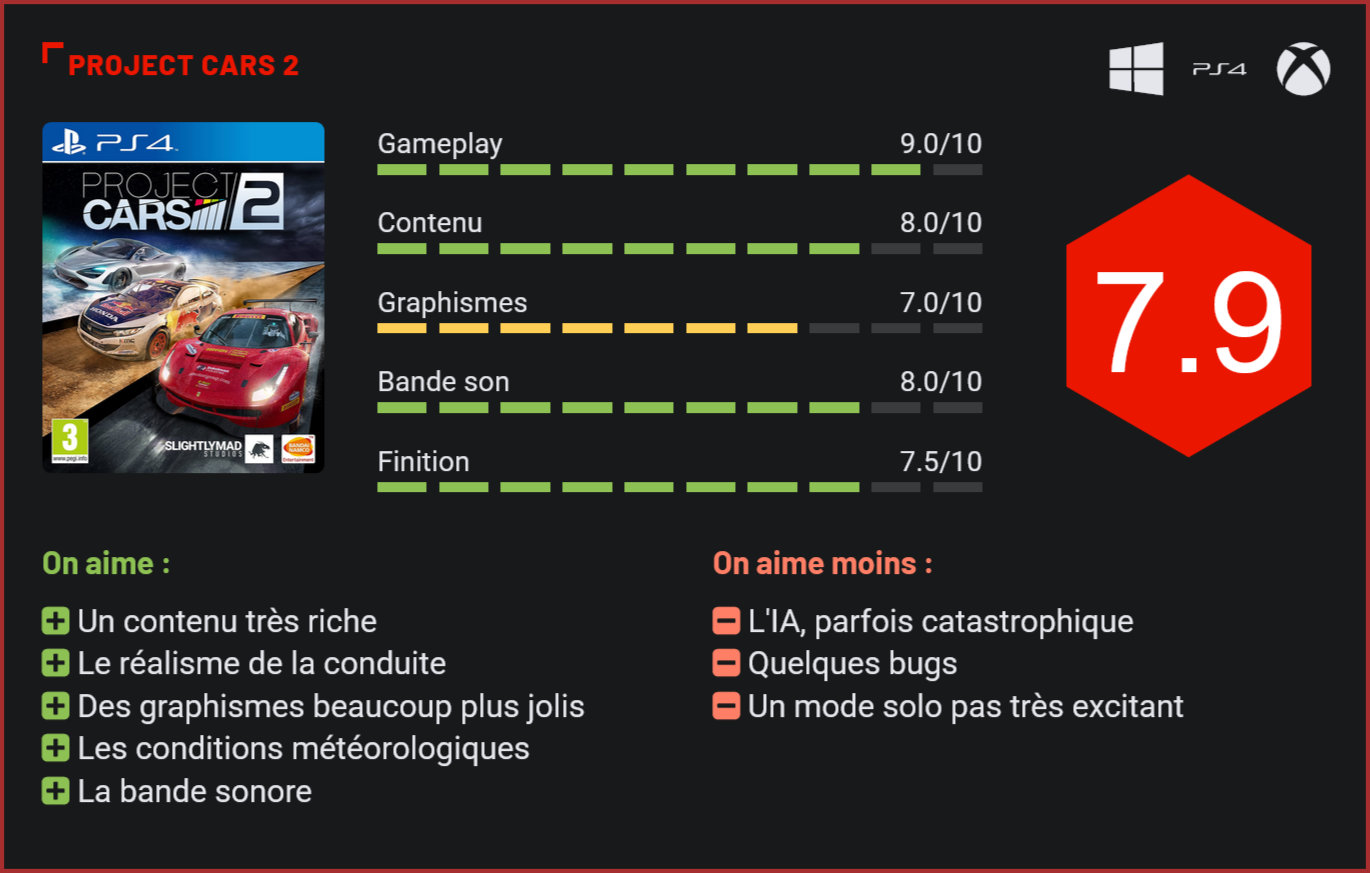 Après un premier volet qui avait créé la surprise, Slightly Mad Studios revient avec un second épisode de sa série Project Cars, toujours aussi axé simulation, mais qui se heurte cette fois à une rude concurrence, avec d’un côté des simulations plus accessibles comme Gran Turismo Sports et Forza Motorsport 7 et de l’autre des titres plus pointus, comme le sous-estimé Assetto Corsa. Malgré ses nombreux défauts, le premier Project Cars était parvenu à séduire les passionnés de course automobile avec son réalisme et la complexité de sa prise en main, qui en faisait un titre se dégustant de préférence avec un volant plutôt qu’une manette. Gros succès commercial – avec ses 2 millions de copies écoulées -, le jeu de Slightly Mad Studios ne pouvait toutefois pas rivaliser avec les ténors du genre sur le plan technique et pour cause puisque le studio de développement avait eu recours à une campagne de crowdfunding pour financer le premier volet… Le succès de Project Cars a toutefois permis au studio de revoir ses ambitions à la hausse pour le second volet, qui s’annonçait excellentissime. Outre un nouveau mode carrière, les développeurs nous avaient ainsi promis un plus vaste line-up de véhicules, des conditions météorologiques qui changent en temps réel et impactent beaucoup plus les performances des véhicules et de grosses améliorations sur le plan technique. Ceux qui avaient déjà touché au premier volet ressentiront les différences dès les premières minutes de jeu. S’il n’est pas aussi réaliste – ni exigeant – qu’un Asseto Corsa, Project Cars 2 peaufine sa technique et se classe sans difficulté parmi les meilleures simulations automobiles. L’adhérence des pneus a été entièrement revue et le joueur devra désormais prendre en compte de nouveaux éléments dans sa conduite. Outre les conditions météorologiques qui viendront lourdement impacter la tenue de route, le changement de surface a désormais un impact beaucoup plus important sur la conduite. Que ce soit sur l’asphalte, la terre battue ou la poudreuse, les sensations de conduite seront totalement différentes selon la surface. Le jeu prône également une conduite moins laxiste en forçant le joueur à faire preuve de prudence, en particulier sur les circuits qu’il ne maîtrise pas encore. Là où les développeurs de Slightly Mad Studios marque des points, c’est au niveau de la variété des courses. Car outre l’Indycar, le GT et le karting, le jeu propose également des courses plus atypiques, avec la Formule 1 en tête d’affiche, mais aussi le rallyecross – l’une des grandes nouveautés de cet épisode -, et la course sur glace. Des catégories de véhicules qui pourraient attirer de nouveaux joueurs dans l’univers de Project Cars… On appréciera d’autant plus la diversité des défis que les nouvelles catégories introduites dans ce second épisode sont parfaitement maîtrisées par les développeurs. Certes, le nombre de tracés pour chacune de ces nouvelles catégories de véhicules est relativement limité, mais les sensations sont là. Et quel bonheur de glisser à toute vitesse sur le circuit glacé de Sampala! Au niveau du casting, Project Cars 2 se défend également plutôt bien avec pas moins de 180 bolides au compteur. Certes, on est encore loin d’un Forza Motorsport 7, mais il y a largement de quoi s’amuser. D’autant plus que le nombre de tracés a littéralement explosé avec plus de 140 tracés au total. On regrettera toutefois que le mode solo soit toujours aussi peu excitant pour les novices. La scénarisation du mode carrière reste minimaliste et le joueur passera comme dans beaucoup d’autres simus pas mal de temps dans les menus du jeu à lire des messages sans grand intérêt et à naviguer dans des tableaux qui se ressemblent tous. Autre gros défaut à mettre en avant : l’intelligence artificielle des adversaires est toujours aussi catastrophique. Très agressive, l’IA n’hésite pas à jouer des coudes, et sans doute un peu trop même à notre goût, avec à la clé parfois des situations parfaitement surréalistes. Il n’est ainsi pas rare de se retrouver au milieu d’un véritable carambolage. Certes, cela fait partie du spectacle, mais Project Cars 2 a tendance à en abuser. Et pour une simulation, cela passe plutôt mal… Il en va de même pour les bugs, peu nombreux, il est vrai, mais qui pourront occasionnellement anéantir vos espoirs de remporter une course. Des défauts qui passeront toutefois aux oubliettes aussitôt que le joueur se lancera dans le mode en ligne, face à de véritables adversaires. Pour le reste, les développeurs de Slightly Mad Studios réalisent un carton plein. La conduite est beaucoup plus réaliste – et sensationnelle que dans le premier volet, sans être pour autant plus exigeante. Le jeu reste parfaitement jouable au pad mais les amateurs de grosses cylindrées prendront leur pied aux commandes d’un volant. Comme dans le premier volet, il d’ailleurs possible de totalement personnaliser la conduite. Attention toutefois, Project Cars 2 demeure un titre très réaliste et qui peut par conséquent se révéler très frustrant pour les nouveaux joueurs. En ce qui concerne la réalisation technique, Slightly Mad Studios opère presqu’un sans faute avec des graphismes nettement améliorés par rapport au premier volet. Non seulement les véhicules, circuits et paysages sont beaucoup plus jolis, mais en outre le studio de développement est parvenu à leur donner vie en y ajoutant des conditions météorologiques qui changeront au cours de la course et feront de votre vie un véritable cauchemar. La bande sonore n’est pas en reste avec des moteurs qui rugissent, des pneus qui crissent et des impacts plus vrais que nature. Pas de doute, les développeurs ont fait du très beau travail! Conclusion Plus riche en contenu que son ainé, Project Cars 2 peaufine et amél