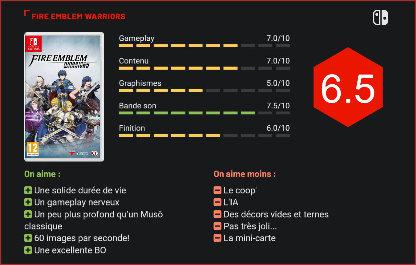 Attendu au tournant par les fans de la série, le spin-off de Fire Emblem tient toutes ses promesses et s’impose comme l’un des titres incontournables de cette fin d’année sur Switch. Que les amateurs de Musô se réjouissent, le genre a encore de beaux jours devant lui! Aujourd’hui, même les plus gros acteurs du marché n’ignorent plus ce genre de jeux, devenu très populaire surtout au Japon. Après Hyrule Warriors, le spin-off de Zelda, Nintendo nous livre un nouveau spin-off de l’une de ses franchises cultes, le bien-nommé Fire Emblem Warriors, dont l’univers se prêtait particulièrement bien à ce type d’adaptation… Pour s’assurer d’un succès, Nintendo a choisi également de confier le projet aux mêmes équipes qui s’étaient déjà chargées de porter l’univers de Zelda en beat them all. Malheureusement pour les habitués de la série, Fire Emblem perd un peu de son identité avec ce spin-off. Les développeurs se sont en effet contentés du minimum syndical sur le plan scénaristique, assemblant tant bien que mal un scénario en tirant des éléments de plusieurs épisodes de la franchise. Le résultat n’est pas franchement épatant, malgré la présence de quelques jolies cinématiques. La plupart des dialogues devront être suivis dans des bulles apparaissant au-dessus des illustrations des personnages. L’histoire se concentre ici sur le prince Rowan et sa soeur jumelle, qui vont tenter tant bien que mal de sauver leur royaume d’une terrible menace. En revanche, du point de vue du gameplay, rien à redire. Les développeurs ne se sont clairement pas contentés ici d’un simple “skin”. Un véritable travail de fond a été opéré au niveau des attaques, beaucoup plus dynamiques que dans un Musô traditionnel. Les personnages que l’on incarne sont très puissants et sont capables de déchainer des attaques d’une violence exceptionnelle en faisant tournoyer dans les airs leurs adversaires. Quelques petites touches d’originalité sont aussi au programme. Ainsi, il sera possible de déchainer des attaques duo, pour ravager les rangs adverses. Les personnages secondaires permettront également de soigner ses troupes sur le champ de bataille. Plus intéressant, il est même possible de donner des ordres à ses unités pour les faire se déplacer sur le vaste champ de bataille et pouvoir ainsi attaquer un ennemi sur plusieurs fronts simultanément. Pour le reste, Fire Emblem Warriors reste un Musô très classique dans lequel le joueur devra affronter des centaines de fantassins, archers et cavaliers sur un vaste champ de bataille. L’objectif ici est d’éliminer les commandants ennemis pour progresser dans le niveau et pouvoir accéder au général, qu’il faudra terrasser. Quelques objectifs secondaires apparaîtront également pour varier les plaisirs, mais rien de très folichon. Arbres de compétence, matériel à récupérer sur le champ de bataille, vente et achat d’armes et gestion de l’escouade sont également au programme. Un peu plus profond qu’un Musô traditionnel, Fire Emblem Warriors se distingue des autres titres du genre par son univers bien sûr, mais aussi son dynamisme. Malheureusement, le jeu conserve les défauts de tous les autres titres du même genre : les décors sont souvent vides et ternes, le gameplay est très répétitif, l’intelligence artificielle est complètement à la rue et la mini-carte reste très brouillonne. Amusant les premières heures de jeu, le titre montre vite ses limites. Visuellement, le titre se défend sans faire de miracle. L’ensemble est heureusement supporté par une bande sonore efficace, qui rythmera parfaitement les combats, et des doublages en anglais (avec la possibilité de télécharger les doublages japonais, pour les puristes). Pour ce qui est de la durée de vie, il faudra compter entre 12 et 20 heures de jeu pour en voir la fin. Après quoi, il sera toujours possible de rejouer certains passages inspirés des jeux Fire Emblem dans le mode Chroniques, qui vient rallonger la durée de vie de quelques heures. Un mode coopératif à deux joueurs est également présent, mais la fluidité du jeu en prend malheureusement un coup. A ce sujet, on notera que Nintendo propose une option qui permet de favoriser l’affichage ou la fluidité, avec du 1080p à 30 images par seconde et du 720p à 60 images par seconde. Intelligent! Conclusion A défaut d’être un titre original, Fire Emblem Warriors s’impose comme un très bon Musô et un titre à posséder absolument pour tous les fans de la franchise. Plus nerveux qu’un Dynasty Warriors, le jeu de Koei est également un peu plus profond que ses congénères. Il conserve toutefois les défauts intrinsèques des jeux du genre. Ultra-répétitif par nature, Fire Emblem Warriors n’en reste pas moins un titre agréable à parcourir, par courtes sessions de jeu.