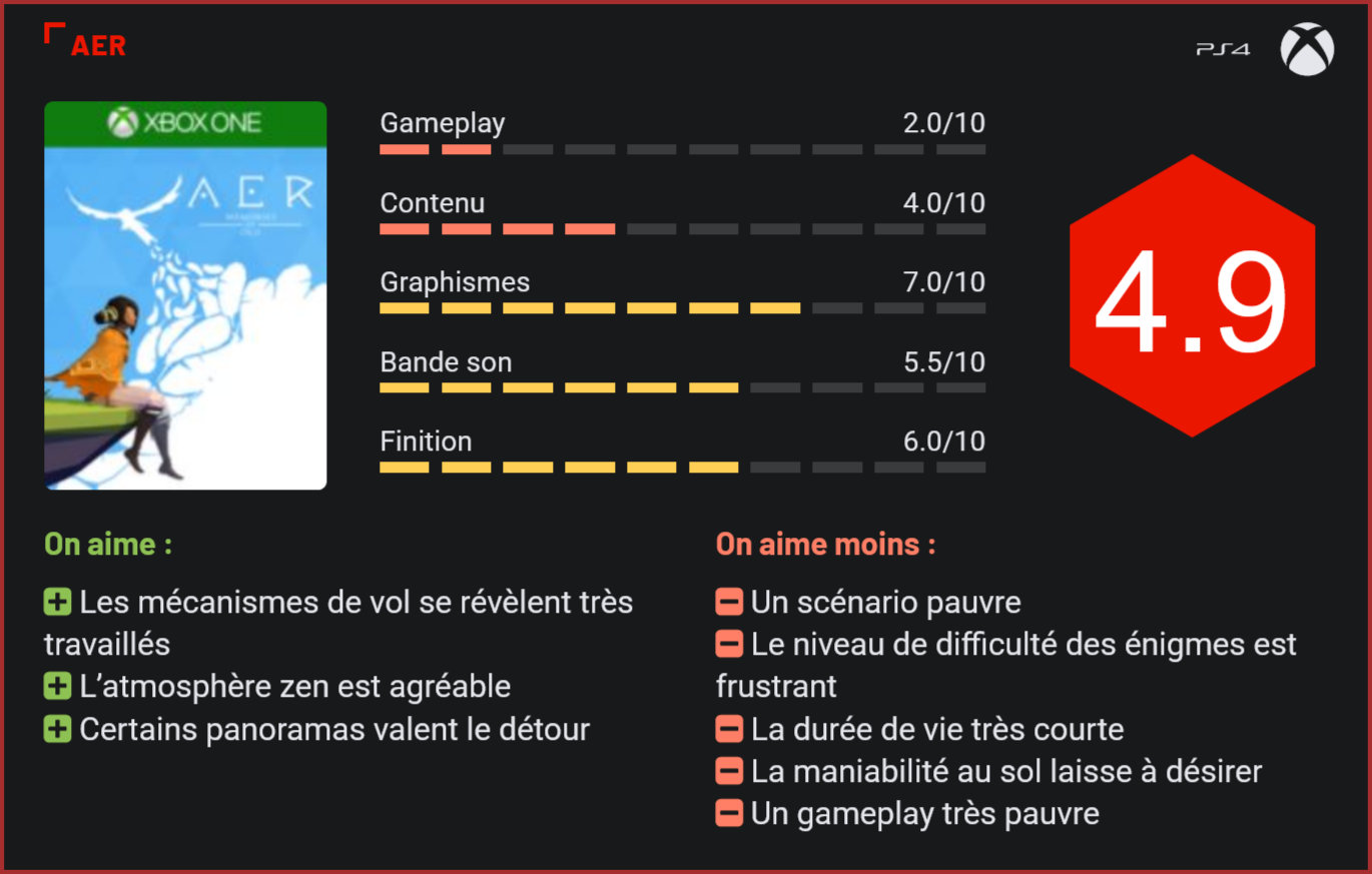 Annoncé en 2012, AER : Memories of Old faisait partie des plus belles arlésiennes de l’univers vidéoludique. Enfin sorti, le jeu ne tient malheureusement pas toutes ses promesses… Le nouveau jeu des studios suédois Daedalic Entertainment est à la fois un ovni et une pépite. Très différent des jeux que l’on peut rencontrer et qui occupent la première place des charts, AER : Memories of Old a demandé près de 5 ans de développement aux équipes du studio. Un projet de longue haleine et ambitieux, qui propose une épopée mystérieuse et enchanteresse dans un univers profondément zen… Un parcours initiatique au pays des hommes-oiseaux Basé sur de l’exploration, le concept du jeu flirte énormément avec la zenitude et le calme ce qui lui donne un aspect très agréable. AER nous propose une aventure presqu’initiatique dans la peau d’Auk, une jeune femme qui a la capacité de se transformer en créature ailée. Envoyée sur les anciennes Terres des Dieux pour un pèlerinage, notre héroïne découvrira un univers bien mystérieux… Capable de se transformer en créature ailée, l’héroïne devra explorer diverses îles flottantes afin de découvrir les secrets enfuis dans ce monde en ruines afin d’empêcher sa destruction. Pour cela, il faudra résoudre diverses petites énigmes – c’est un euphémisme – dont regorgent les terres sacrées dans le but de reconstituer un médaillon brisé. L’aventure se traduit par une balade de santé Un concept original, qui ne propose malheureusement aucune profondeur. Car au final le jeu est assez pauvre. Le scénario est en effet d’une maigreur famélique et le gameplay d’une simplicité enfantine. Toute l’aventure semble reposer sur la transformation de la jeune femme en oiseau. Une expérience parfaitement maîtrisée, qui ne laissera pas le joueur insensible. Il faut dire que les mécanismes relatifs au vol ont occupé les développeurs suédois durant deux années d’après leurs dires. Malheureusement, le vol en lui-même ne sert qu’au transport. Les quêtes et les énigmes se feront uniquement sous la forme humaine d’Auk. Une sous-utilisation du concept qui s’avère assez décevante au vu de la qualité des sensations de vols. On notera tout de même que les transformations humaine – oiseau et inversement offrent quelques jouissances en plein vol. Le travail effectué sur le vol n’a certainement pas été de la même qualité que celui fait sur la maniabilité du personnage au sol. Difficile à diriger et assez lente, Auk est une horreur à déplacer une fois les pieds sur la terre ferme et ce alors que les phases au sol sont beaucoup plus nombreuses que celles de vol. Le pire reste les sauts or, une grande partie des « énigmes » nécessitent de parcourir divers chemins accidentés et donc, de sauter. Tout repose sur le vol Autre point fort négatif : le manque de contenu. L’histoire se limite à cette quête de reconstitution du médaillon pour laquelle notre héroïne devra explorer plusieurs temples sacrés. Les autres îles aux alentours se montrent incroyablement vides. Seules quelques stèles et écriteaux justifient – ou non – leur présence. Les énigmes en elles-mêmes se montrent également d’une utilité presque nulle étant donné leur niveau de difficulté qui n’offre aucun sentiment de challenge pour le joueur. Appuyer sur quelques manivelles, explorer un petit labyrinthe et hop, le tour est joué. Un animal magique apparait et donne la nouvelle destination à notre chère Auk. Simpliste et décevant. Un univers poétique et séduisant Si l’aventure se montre fragile, AER : Memories of Old a le mérite de proposer un univers d’une grande beauté et d’une certaine poésie. Les décors aériens ou terrestres se déclinent en diverses couleurs et formes de très belle facture. La présence des nuages, des fontaines et de la verdure fait émerger un sentiment de bien-être et d’apaisement chez le joueur qui, même si cela ne permet pas d’oublier le manque de contenu, a le mérite de contenir la frustration et d’émoustiller les yeux. Son côté sacré et enchanteur est tout aussi agréable à l’œil. On se laissera dès lors facilement porter par la poésie que le jeu dégage. L’ambiance sonore colle également parfaitement bien avec l’atmosphère mystérieux et angélique de l’univers. Malheureusement, ce ne sera pas suffisant pour sauver ce projet du naufrage. Moins abouti que Rime, AER est une expérience peu aboutie qui ne séduira que les joueurs les moins exigeants… Conclusion Trop court, pas assez excitant et surtout très mal fichu, AER : Memories of Old était sans doute un titre trop ambitieux pour les développeurs suédois de Daedelic. Malgré ses qualités visuelles et son univers charmant, le titre ne parvient pas à séduire le joueur, la faute à un gameplay trop pauvre et un énorme vide scénaristique. On soulignera tout de même la qualité des séquences de vol qui offrent une très agréable sensation. Malheureusement, les énigmes basiques et les séquences d’exploration au sol font de AER : Memories of Old un titre pénible à parcourir, même à moins de 15 euros.