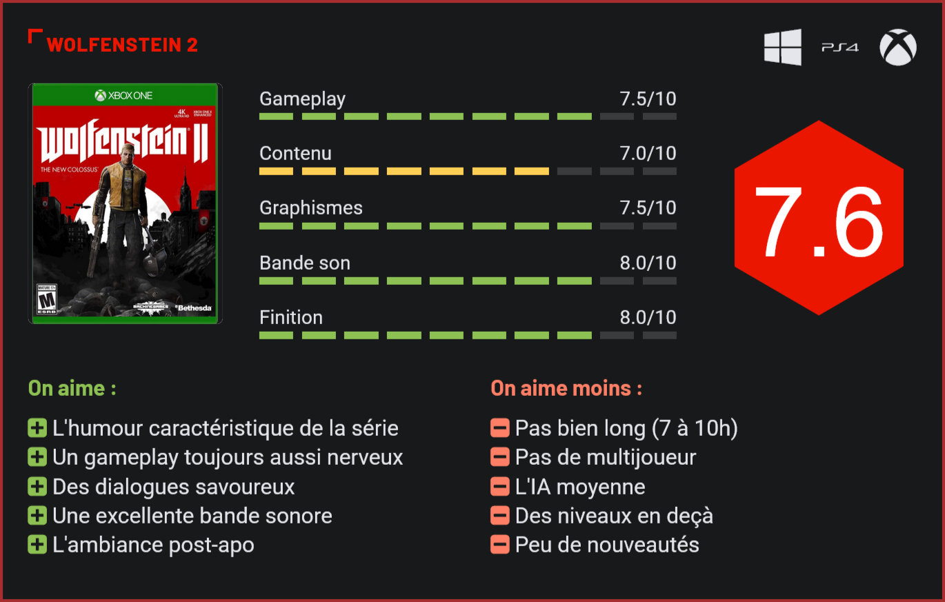 En grande forme, l’agent B.J. Blazkowicz reprend du service pour tuer du nazi. Poursuivant l’histoire de The Old Blood, Wolfenstein 2 marche sur les traces de The Man in the High Castle, la série événement d’Amazon qui retrace l’invasion des Etats-Unis par les forces allemandes. L’excellent reboot de la franchise, orchestré par les Suédois de MachineGames avait déjà donné lieu à une extension solo (stand-alone), le sympathique The Old Blood, qui n’avait toutefois pas rencontré le succès escompté. Convaincu du potentiel de la franchise, Bethesda Softworks enchaine aujourd’hui avec une suite en bonne et due forme, le bien nommé Wolfenstein 2. Et les habitués de la franchise ne devraient pas être déconcertés puisque ce second volet reprend quasi à l’identique la recette de ses ancêtres. Un FPS brutal, qui se joue en ligne droite et qui est parsemé de blagues bêtes et vilaines dignes d’une belle grosse série Z. Conservant les atouts et les défauts de ses ancêtres, Wolfenstein 2 est une suite sans grande surprise qui séduit principalement par son contexte. L’histoire reprend en effet là où nous l’avions laissée dans The Old Blood. Blessé, le supersoldat B.J. Blazkowicz se réveille dans un fauteuil roulant à bord d’un sous-marin, dont il devra s’échapper avec sa fine équipe, venue à sa rescousse. A sa sortie, il découvre que les Etats-Unis ont été envahis par le Reich, qui s’est allié au KKK pour imposer un nouvel ordre aux Américains. Accompagné de son épouse et de ses proches, Blazkowicz organise la résistance et décide de déstabiliser le pouvoir en place. Le concept n’est bien sûr pas sans rappeler la série d’Amazon, “The Man in the High Castle”, qui décrit les Etats-Unis sous un règne nazi. Sauf qu’ici, l’uchronie tourne à la série Z. Bourré d’humour, le jeu propose des dialogues savoureux, enchaine les situations abracadabrantes et plonge le joueur dans un univers d’une richesse et d’une absurdité sans limite. Un spectacle qui mérite à lui seul le déplacement… Du Manhattan réduit en cendres à la base secrète de la Zone 51 en passant par la Nouvelle-Orléans, l’aventure vous fera voir du pays. Si l’on aurait aimé davantage de niveaux en plein air, difficile de ne pas être séduit par le formidable character-design et les choix audacieux des développeurs. On notera d’ailleurs que le jeu qui est commercialisé chez nous n’a pas été censuré – les portraits d’Hitler et drapeaux nazis foisonneront donc à travers l’aventure! Malgré son absurdité, The New Colossus n’en garde pas moins un scénario d’une richesse impressionnante. Les dialogues sont travaillés, les cinématiques nombreuses et le joueur pourra en apprendre davantage sur le scénario en récupérant de nombreux objets, lettres et souvenirs à travers les niveaux traversés. Plus encore que ses ancêtres, Wolfenstein 2 a bénéficié d’une attention toute particulière au niveau de la narration, qui fait ici office de véritable carotte pour faire avancer le joueur. Assez paradoxalement pourtant, l’aventure commence très doucement avec le réveil de B.J. qui devra se mouvoir à travers le premier niveau aux commandes d’un… fauteuil roulant. Si le concept est en soi totalement délirant, on regrettera toutefois que la maniabilité ne soit pas au top et que les deux premières heures de jeu soient les moins intéressantes de l’aventure. Du côté du gameplay, très peu de surprises puisque Wolfenstein 2 reprend quasiment à l’identique le modèle de ses ainés. Le titre de MachineGames est un FPS brutal, nerveux, qui force le joueur à être très mobile face à une armada de soldats nazis, pas forcément très intelligents, mais à la puissance de feu impressionnante. Outre les unités d’élite, on rencontrera ainsi des unités canines, des robots, des méchas ou encore des drones. L’arsenal mis à disposition du joueur est heureusement à la hauteur de nos attentes avec son lot de mitrailleuses, de fusils à pompe et lance-roquettes. La petite note de fraicheur ici viendra du côté des affrontements au corps à corps, bien davantage mis en avant grâce à l’utilisation d’une hache de combat qui permettra d’éliminer les ennemis en silence. Amusant, même si l’infiltration n’est pas le coeur de métier de Wolfenstein. Plus ouverts que dans les précédents opus, les niveaux offrent de nouvelles portes en terme de gameplay, en permettant d’avoir une approche très agressive ou au contraire beaucoup plus stratégique. Pour renouveler un peu le gameplay à mi-parcours, les développeurs ont intégré de nouveaux kits qui permettront d’introduire de nouveaux mécanismes de gameplay. Sans entrer dans les détails, ceux-ci apporteront un peu de fraicheur et permettront de varier les plaisirs en rendant les affrontements encore plus techniques. On notera par ailleurs que l’expérience de jeu aura tendance à énormément varier selon le fait que vous opterez pour un mode “facile”, “moyen” ou “difficile”. En facile, le jeu se terminera en un peu moins de 7 heures, en ligne droite et sans trop souffrir. En difficile en revanche, il faudra songer à utiliser les couvertures, à se tapir beaucoup plus souvent dans l’ombre et à employer l’environnement pour venir à bout des hordes d’ennemis. La durée de vie passera également du simple au double, selon le niveau de difficulté choisi… Très agréable à parcourir de bout en bout, le jeu de MachineGames est également une jolie claque graphique, avec ses décors à couper le souffle, sa direction artistique d’exception et ses effets spéciaux à profusion. La bande sonore n’est pas en reste avec des doublages au top et des musiques dignes d’une grosse production hollywoodienne. Au final, le seul reproche que l’on pourrait faire à Wolfenstein 2 est de rester un FPS très traditionnel et donc très dirig