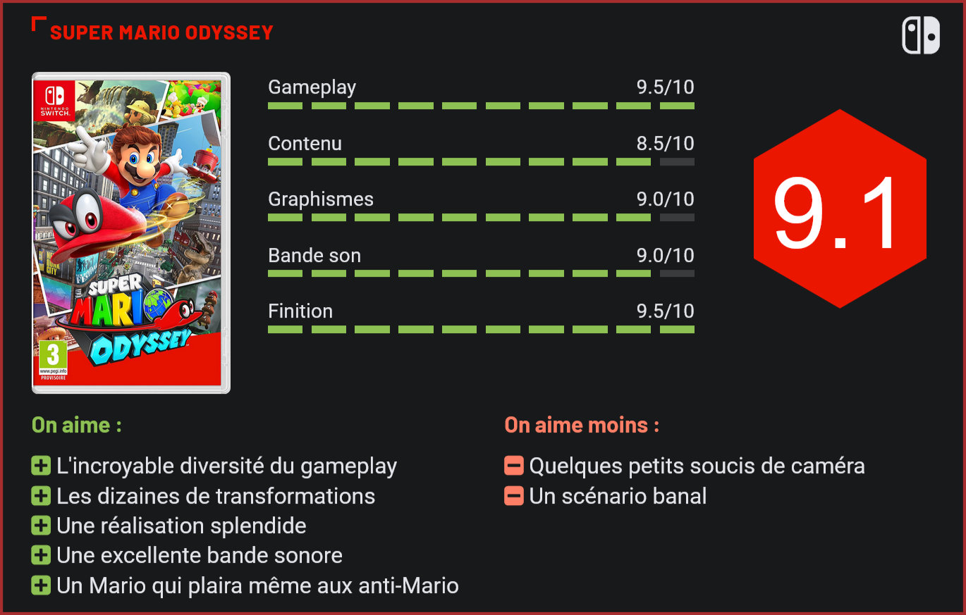 En perte de vitesse depuis plusieurs années, la franchise-phare de Nintendo revient en force avec un épisode qui fera date et qui représente à lui seul une bonne raison de craquer pour la Switch de Nintendo. Véritable “system-seller” il y a encore quelques années, Mario a perdu au fil des ans de son prestige, devenant même un simple invité de marque dans de nombreux jeux. Difficile en effet de se remémorer un titre vraiment marquant depuis l’épisode sorti sur Nintendo 64, le fameux Super Mario 64. Le succès inattendu de la Switch a semble-t-il donné des ailes à Nintendo, qui enchaine depuis plusieurs mois les hits. Après The Legend of Zelda : A Breath to the Wild, considéré par certain comme le meilleur épisode de la série, Nintendo nous livre un Super Mario Odyssey qui fera lui aussi date dans l’histoire du jeu vidéo. Explications. Nintendo a traversé des temps difficiles avec sa WiiU. L’ex-géant du jeu vidéo a dû revoir intégralement sa stratégie, et ne pas hésiter à innover, tant au niveau de ses consoles de jeu, au form factor très différent des concurrentes, que de son line-up. Outre de nouvelles franchises sortant des sentiers battus, comme l’excellent Splatoon ou le plus récent ARMS, qui tirait merveilleusement bien parti des capacités de la petite console nomade de Nintendo, le géant nippon en a également profité pour repartir d’une feuille blanche avec ses principales franchises. C’est ainsi que les fans de Zelda ont pu découvrir A Breath to the Wild, un formidable jeu d’aventure en open-world, qui bouleversait littéralement les standards du genre… Le plombier moustachu a suivi les mêmes traces que Link. Avec Super Mario Odyssey, Nintendo a entièrement revu sa copie et n’as pas hésité à repenser intégralement le gameplay de sa franchise. Son originalité, Super Mario Odyssey la doit principalement à l’introduction de Cappy, un personnage haut en couleur qui accompagnera Mario tout au long de l’aventure et qui prend la forme d’une casquette. Casquette que notre plombier peut utiliser pour activer boutons et interrupteurs à distance, mais aussi prendre le contrôle d’objets, créatures et personnages. Lors des premières minutes de jeu, le joueur pourra ainsi prendre le contrôle d’une grenouille, séquence au cours de laquelle il pourra se rendre compte de tout le potentiel de ce concept, qui est en soi révolutionnaire. Car les personnages et créatures que Mario peut incarner se contrôlent tous différemment et disposent tous de capacités uniques. Dans le cas de la grenouille, le joueur pourra nager beaucoup plus vite dans l’eau, et faire des bonds prodigieux. Plus loin dans l’aventure, Mario pourra également incarner un T-Rex, qui lui permettra de tout détruire sur son chemin, et tout un tas d’autres créatures et objets. Et à chaque nouvelle incarnation, on observera le même phénomène : des yeux qui s’écarquillent, des pupilles qui se dilatent et un sourire de grand enfant qui s’affiche sur le visage. Un émerveillement qui témoigne à lui seul de la formidable réussite de cet épisode qui modernise à lui seul un style de jeu qu’on pensait définitivement mort. Cette mécanique de jeu unique fait de Super Mario Odyssey un jeu particulièrement fun à parcourir et parvient surtout à tenir le joueur scotché à son pad durant toute l’aventure, grâce au véritable plaisir que procure le fait de découvrir les nouvelles incarnations qui sont mises à disposition du joueur à chaque nouveau niveau. L’autre particularité de Super Mario Odyssey, c’est de plonger le joueur au cœur d’un nouveau périple qui lui fera parcourir du pays à bord de son vaisseau. Exit la progression classique par tableau, et l’open world, puisque le joueur est ici plongé à travers une succession de décors très différents, qui vous emmèneront de plages ensoleillées aux dunes sahariennes, en passant par des décors plus urbains et des mondes fantasmatiques. Les décors, assez vastes, regorgent de secrets à découvrir, et de défis en tous genres. On notera toutefois que la progression ici se fait de manière très différente à un “platformer” classique. Super Mario Odyssey se rapproche en effet d’un jeu d’aventure, parsemé de séquences de plates-formes et de mini-jeux. Car le Mario, cuvée 2017, est également un titre très riche en contenu, qui propose des séquences de jeu d’une variété impressionnante. De courses poursuites à des séquences de destruction en passant par des énigmes et des séquences de tir, le joueur n’aura pas le temps de s’ennuyer. Ajoutez à cela plusieurs séquences “nostalgiques” en 2D, et vous comprendrez que Super Mario Odyssey, s’il dénote un peu avec les précédents épisodes de la série, parviendra sans difficulté à séduire les fans de la série et même – c’est un petit exploit en soi -, à convertir ceux qui n’ont jamais apprécié la série. Si le jeu n’est en soi pas bien long – il est tout à fait possible de le terminer en moins de 10 heures, en fonçant en ligne droite ! -, son contenu n’en reste pas moins très riche, et récupérer toutes les lunes, en remplissant tous les défis prendra aux joueurs les plus chevronnés plusieurs dizaines d’heures (20 à 30h de jeu, au bas mot). Alors oui, on pourra lui reprocher quelques soucis de caméra et un scénario d’une banalité à pleurer, mais dans l’ensemble, ce Super Mario Odyssey est bel et bien la perle que tous les fans attendaient. Il tire en outre parfaitement parti des capacités de la Switch en s’imposant comme l’un des plus beaux jeux sortis sur le support, et a bénéficié d’une direction artistique tout simplement grandiose. Les décors traversés sont d’une beauté à couper le souffle et tout dans Super Mario Odyssey suscite l’enchantement du joueur – même la bande sonore du titre, qui n’a rien à envier à celles des plus g